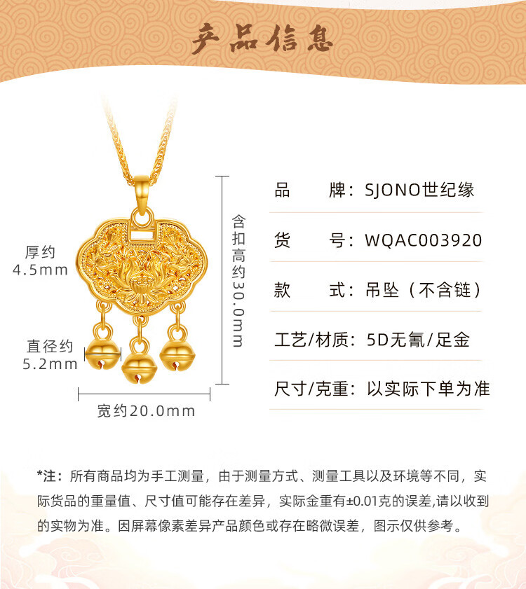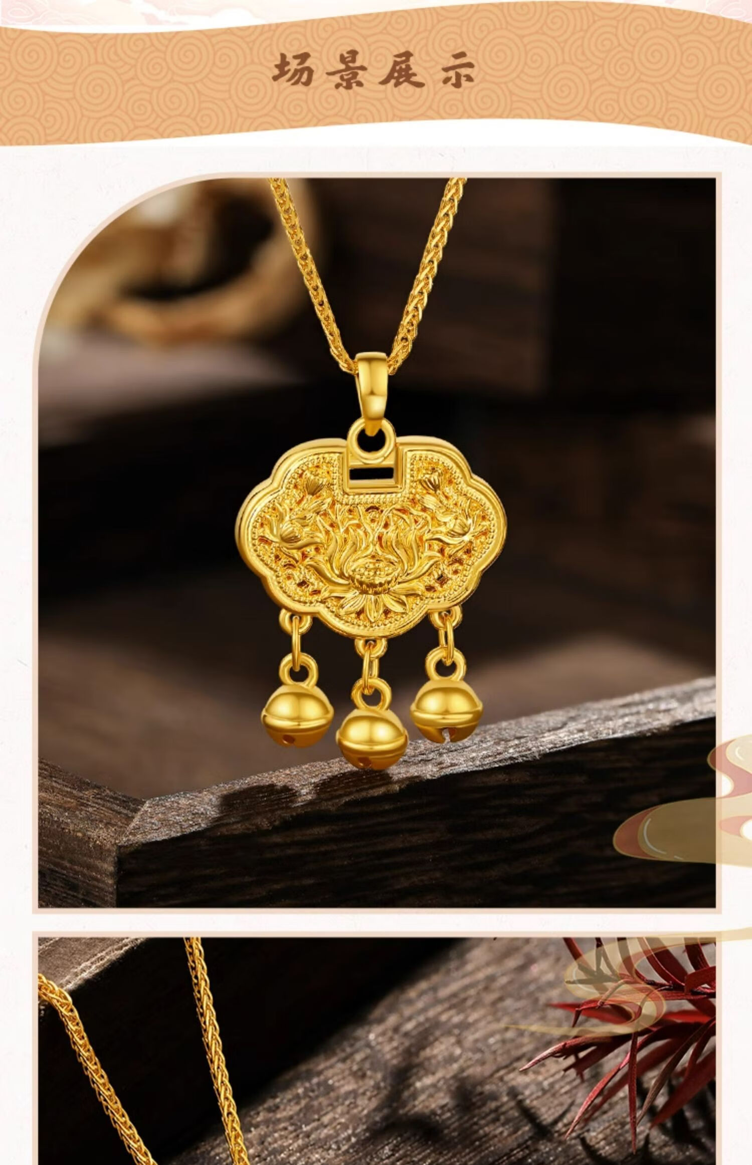 Shien Gold Pendant Women's 5D Hard Gold Pure Gold Safety Lock Pendant Gold Lock Bell Necklace One-month-old Gift Concentric Lotus Lock Pendant 1.93g