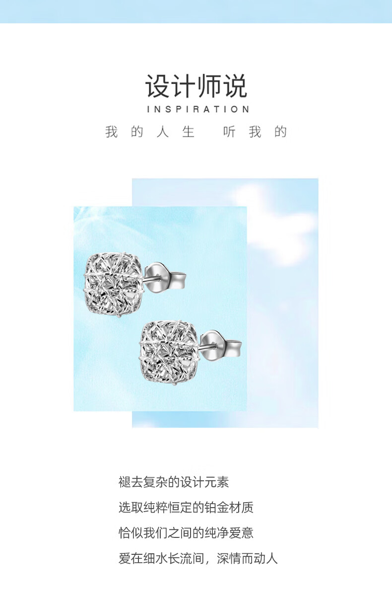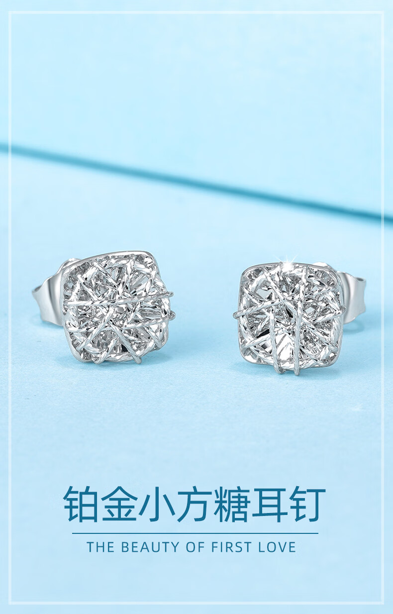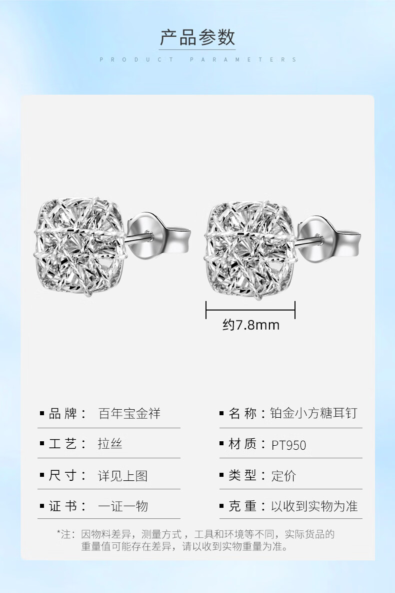 Centennial Baojinxiang Pt950 platinum women's imitation diamond earrings, earrings and earrings, genuine 950 platinum sparkling small sugar cube earrings as a gift, weighing about 3.4-3.6 grams, platinum large sugar cube earrings