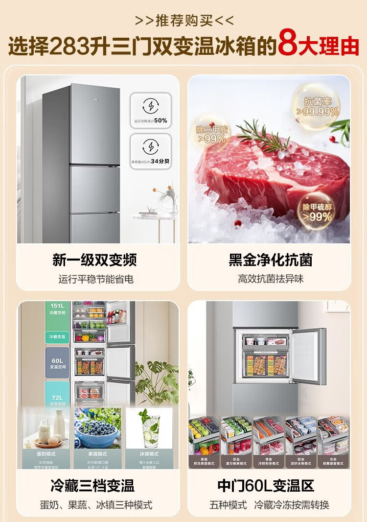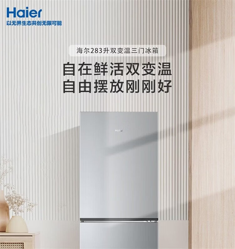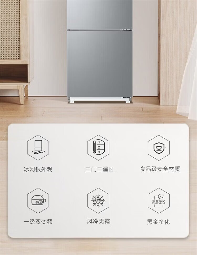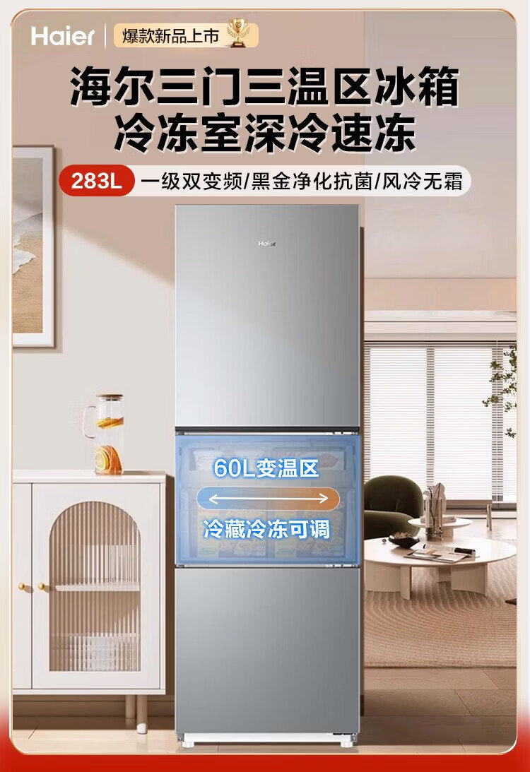 Haier's flagship hot-selling refrigerator 283 liters three-door air-cooled frost-free first-class energy efficiency double frequency conversion small household dormitory rental energy-saving small refrigerator 283 liters three-door three-temperature + dual frequency conversion first-class + black gold purification and antibacterial