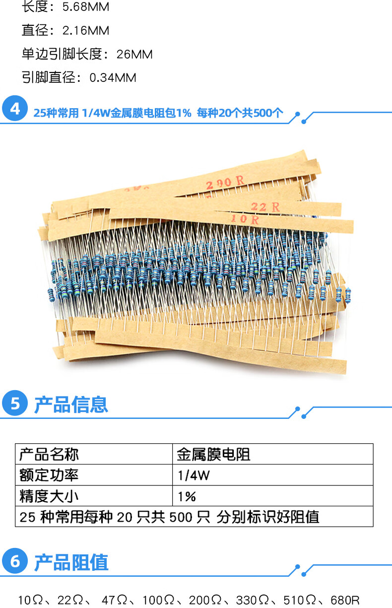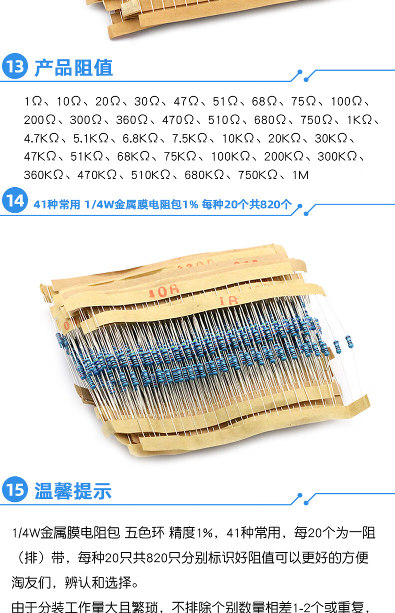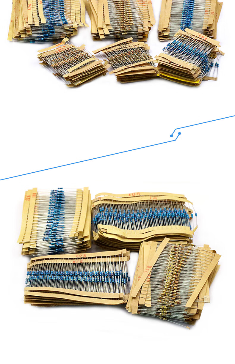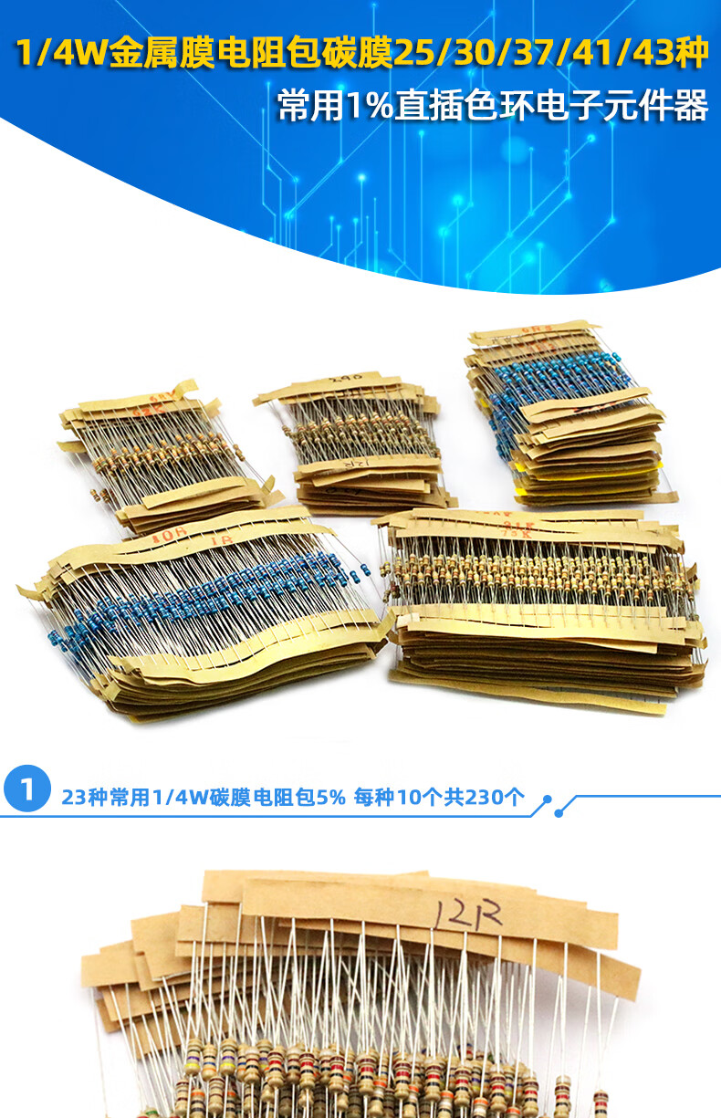 Dafuri 1/4W metal film resistor packaged with carbon film 41 mixed 30/37/43 types of electronic components commonly used 1% color ring 25 types of commonly used 1/4W resistors packaged 1% each 20 pcs, a total of 500 pcs