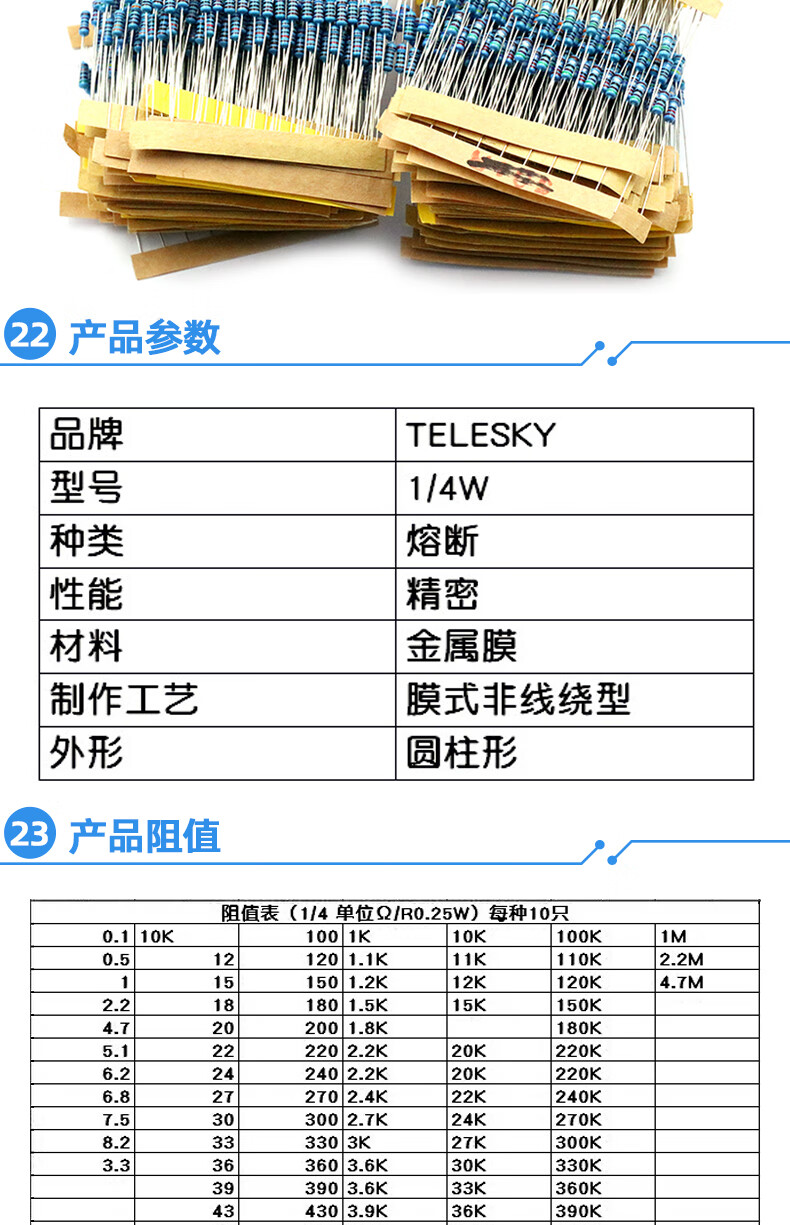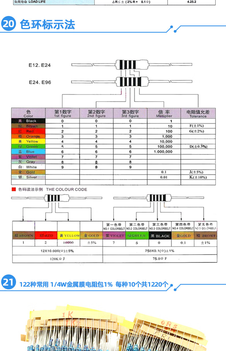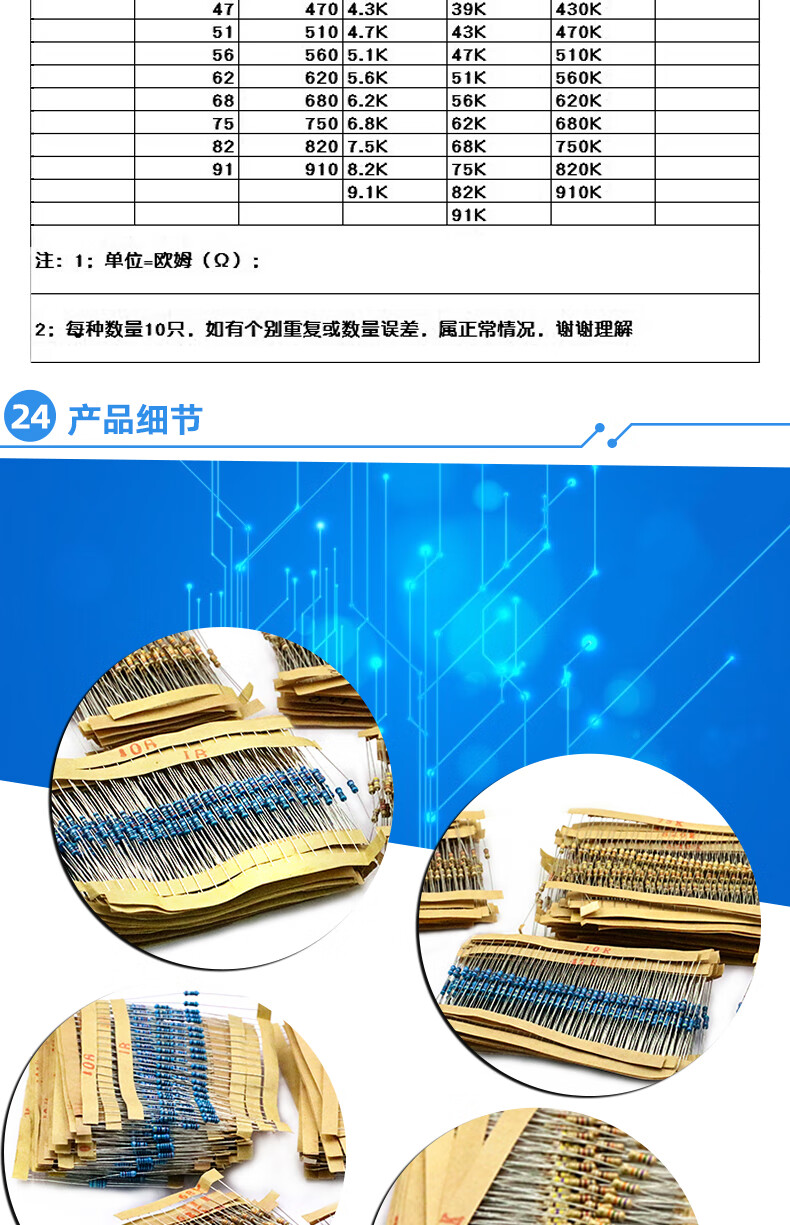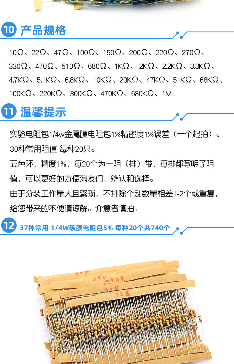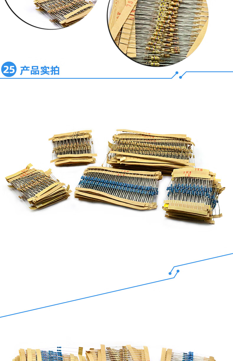Dafuri 1/4W metal film resistor packaged with carbon film 41 mixed 30/37/43 types of electronic components commonly used 1% color ring 25 types of commonly used 1/4W resistors packaged 1% each 20 pcs, a total of 500 pcs