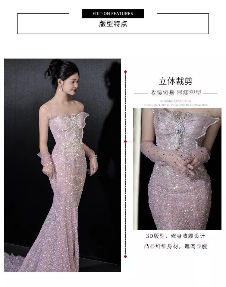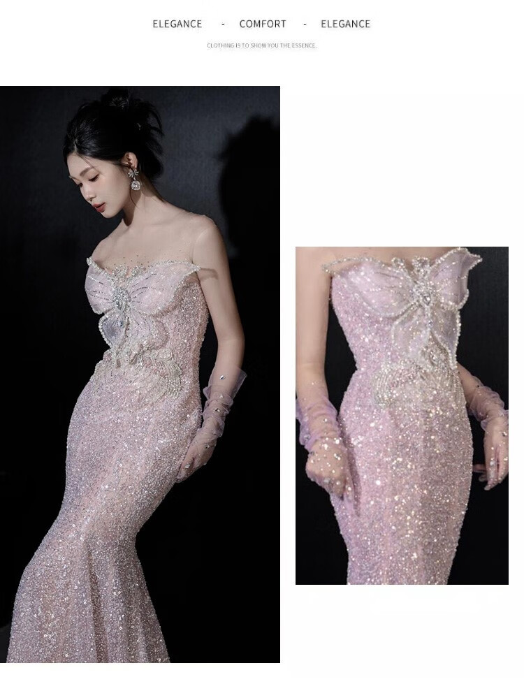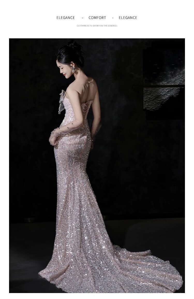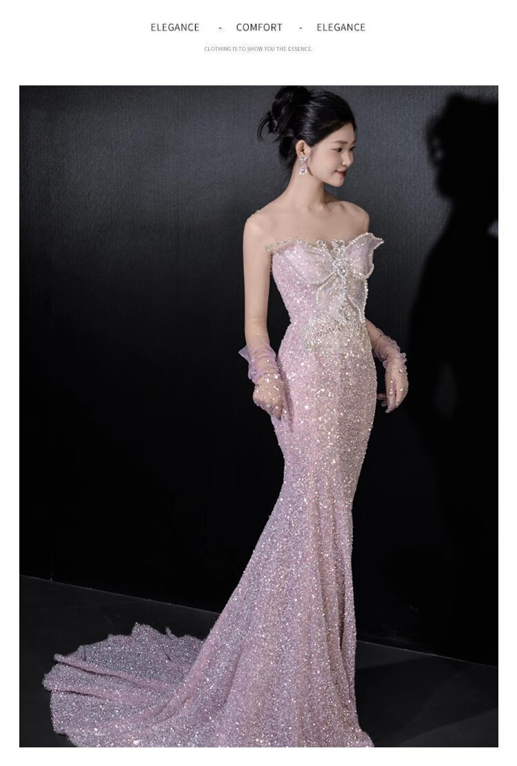COMMAX Heavy Industry Sequined Evening Gown Temperament Socialite Light Luxury Host Pink Tube Top Fishtail Engagement Toast Dress Pink L