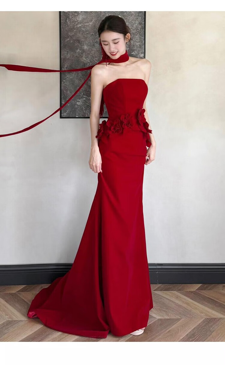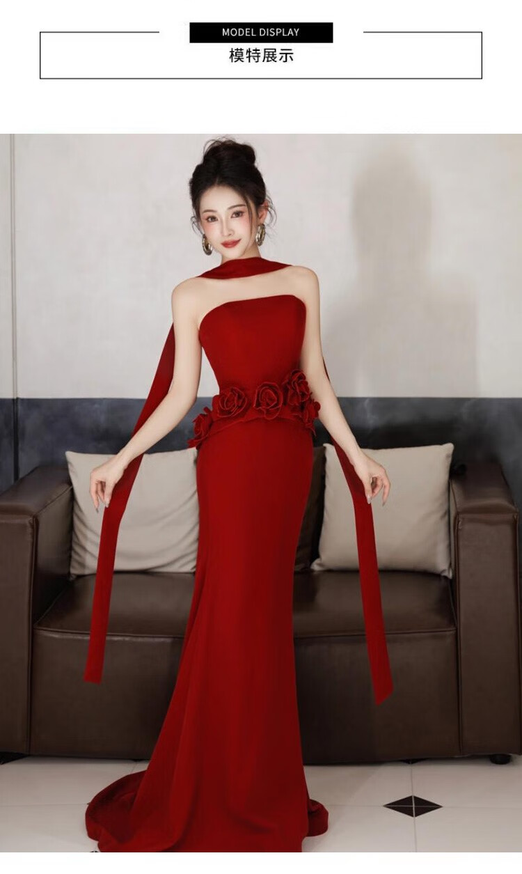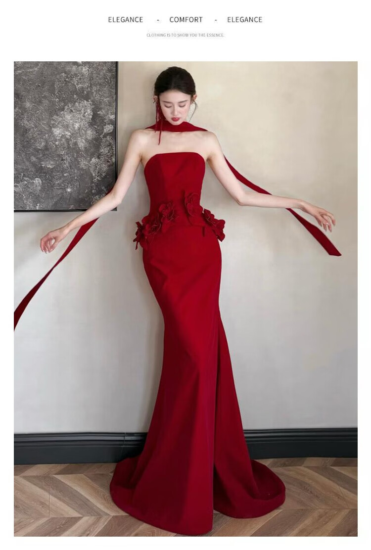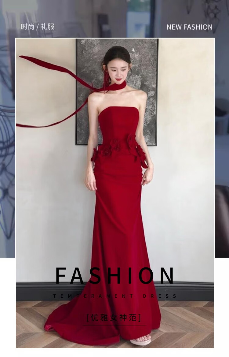 COMEX Burgundy Chinese Style Toast Dress Tube Top Light Luxurious Fishtail Temperament Bride Engagement Wedding Return Dress Burgundy L