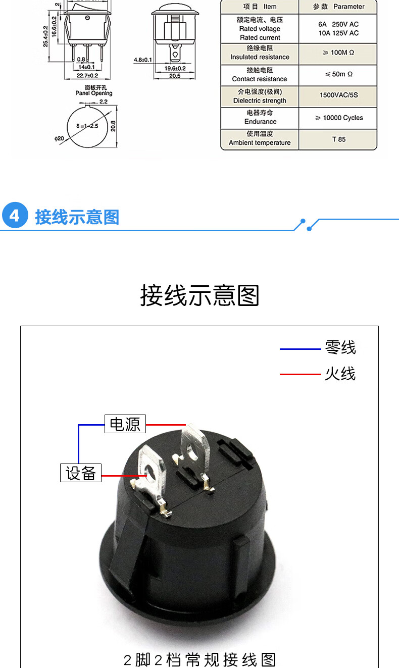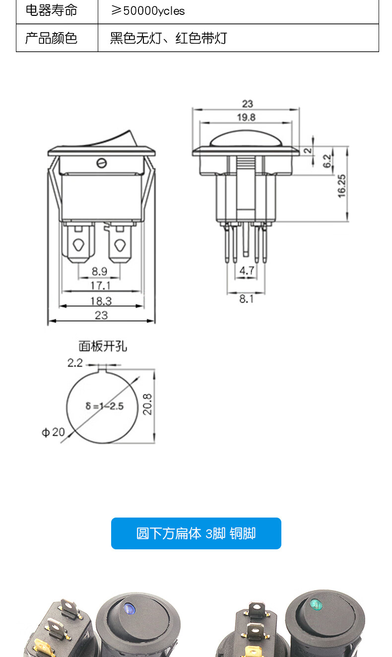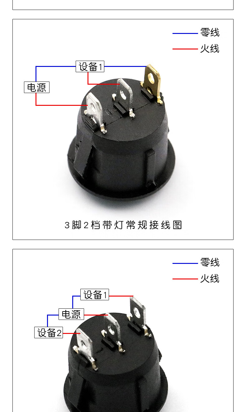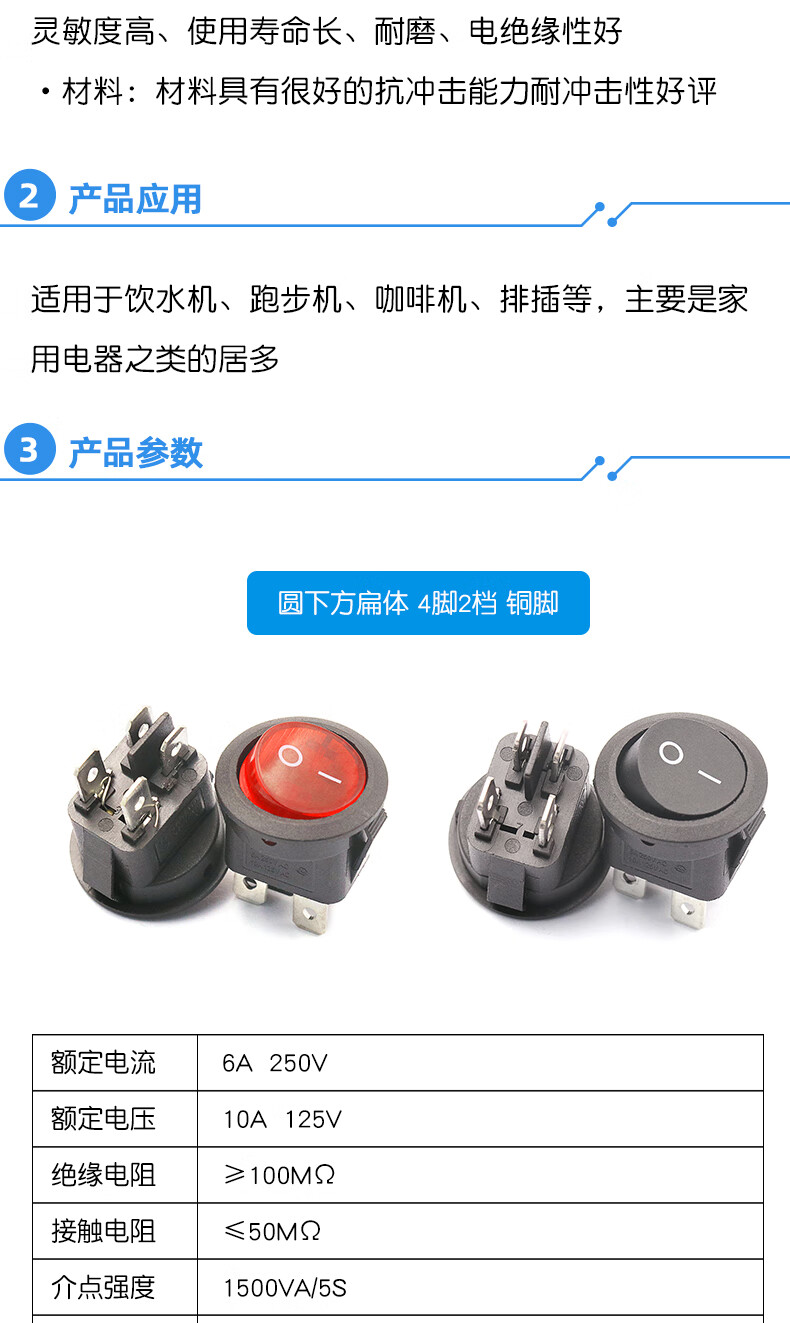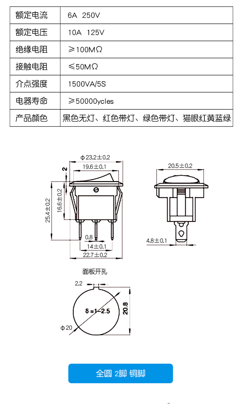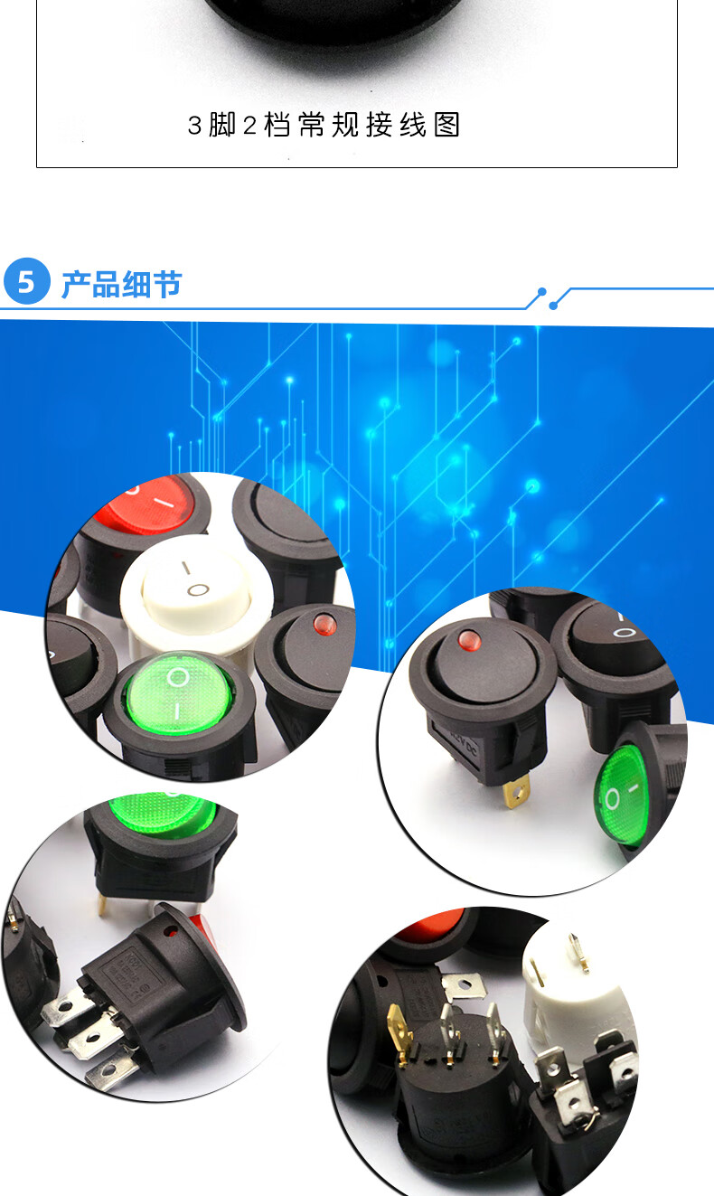Dafuri boat-shaped switch boat-shaped circular rocker power switch button 2 feet 3 red, green, white and black opening 20mm6A 250V full circle black light-free opening 22mm 3 gears 6 feet copper feet