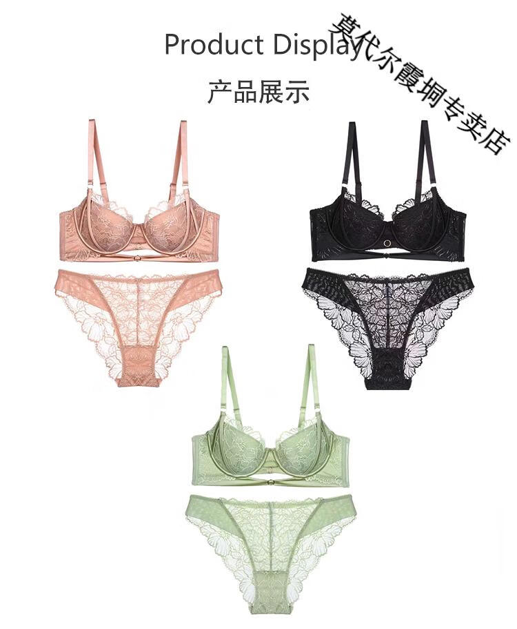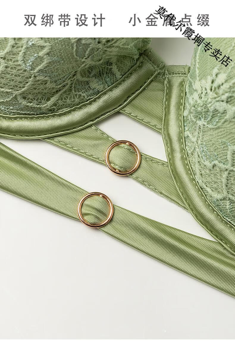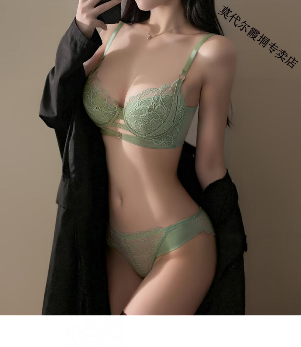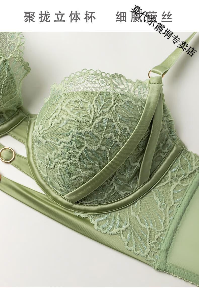 Modal Sexy Lace Hollow Underwear Women's Big Breast Revealing Small Breast Gathering Thin Pure Desire Large Size Bra Set Light Green Set 75B 34