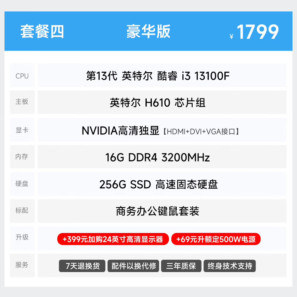 Navigator/Acer i3 13100/16G/512G Enterprise procurement office customer service business multi-screen large-capacity game desktop computer host DIY assembly machine complete set of four i3 13100F丨16G DDR4丨256G