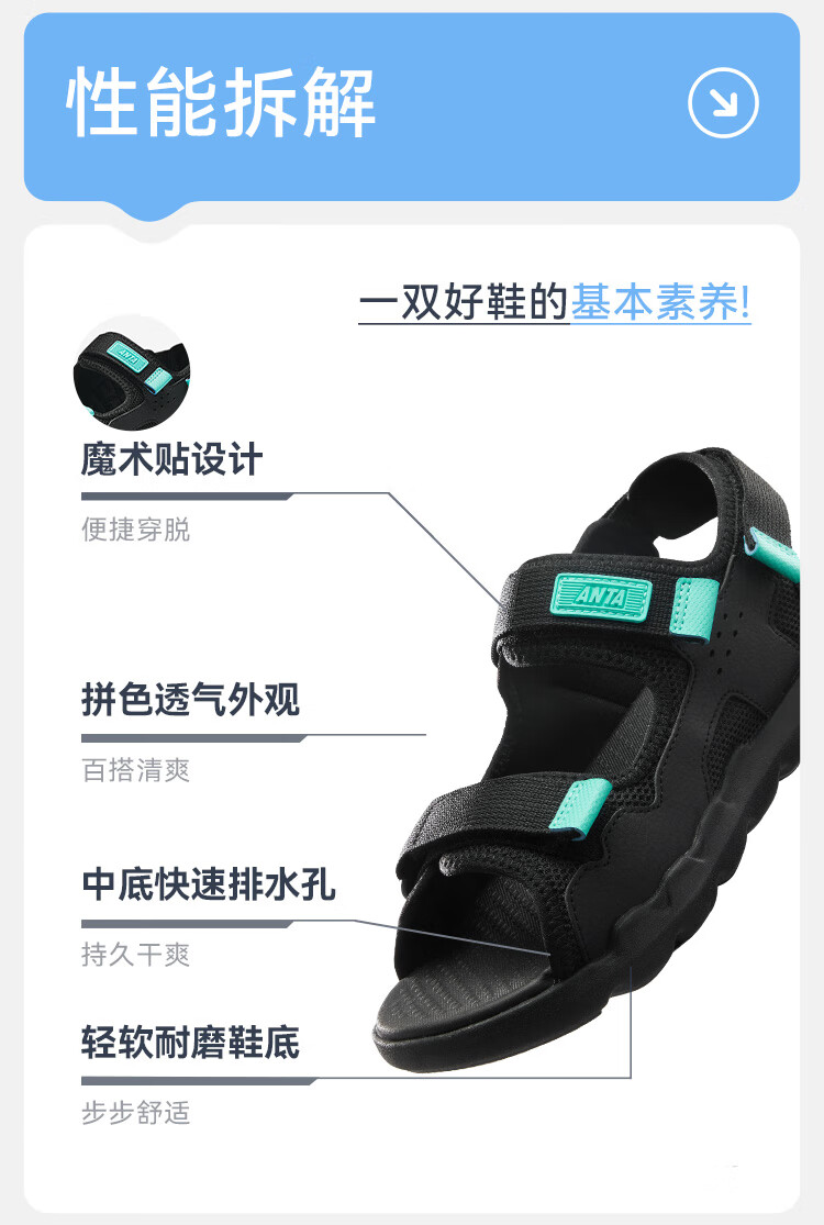 ANTA Children's Sandals, Boys' Shoes, 25 Years Summer Comfortable Outdoor Student Open-Toe Beach Shoes, Black/Clear Blue-1 39, Inner Length 24.5cm