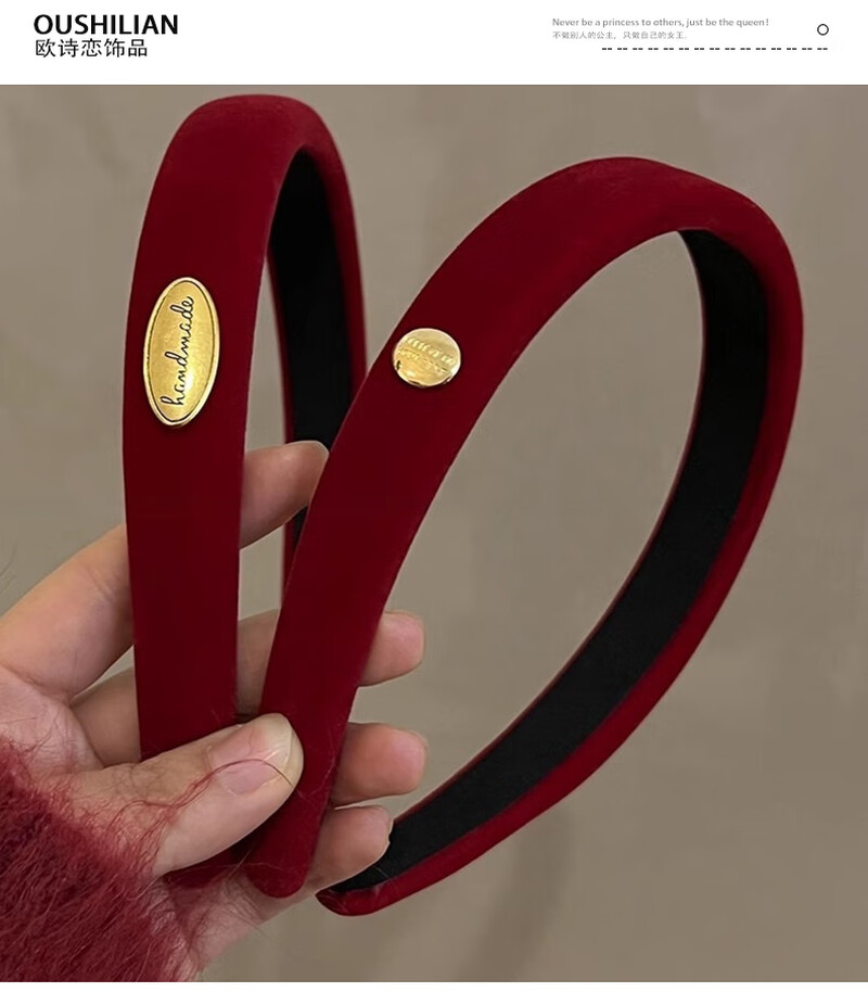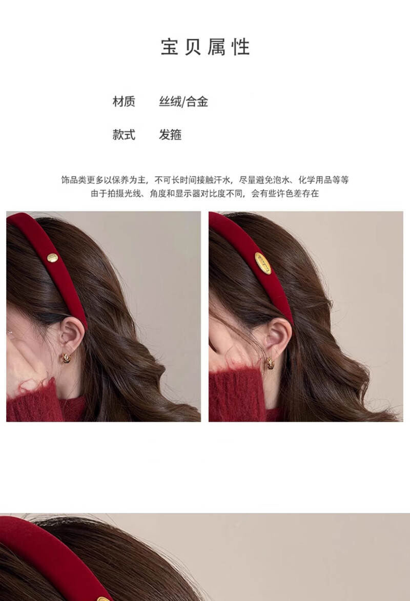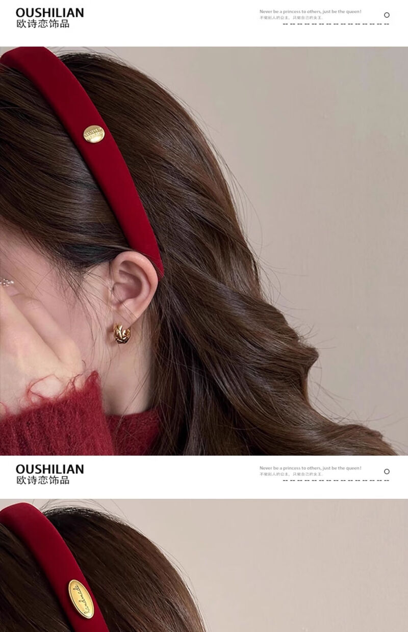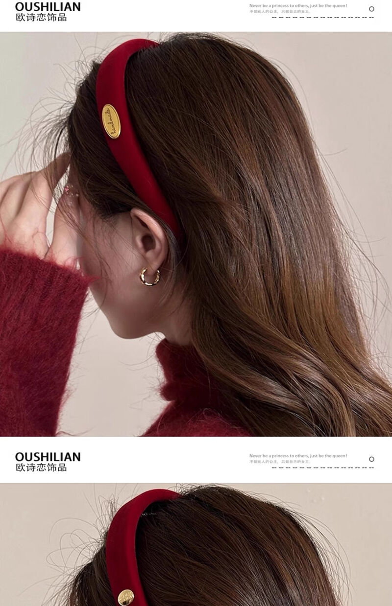 Uplifting burgundy velvet headband for women, autumn and winter temperament, gold label hairpin, New Year's atmosphere headband, small oval, gold label, red