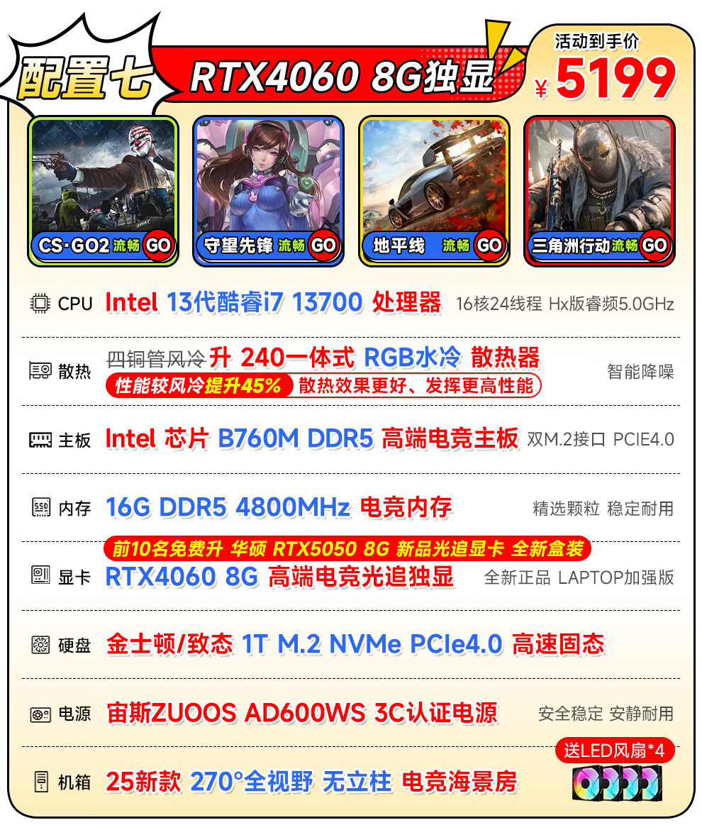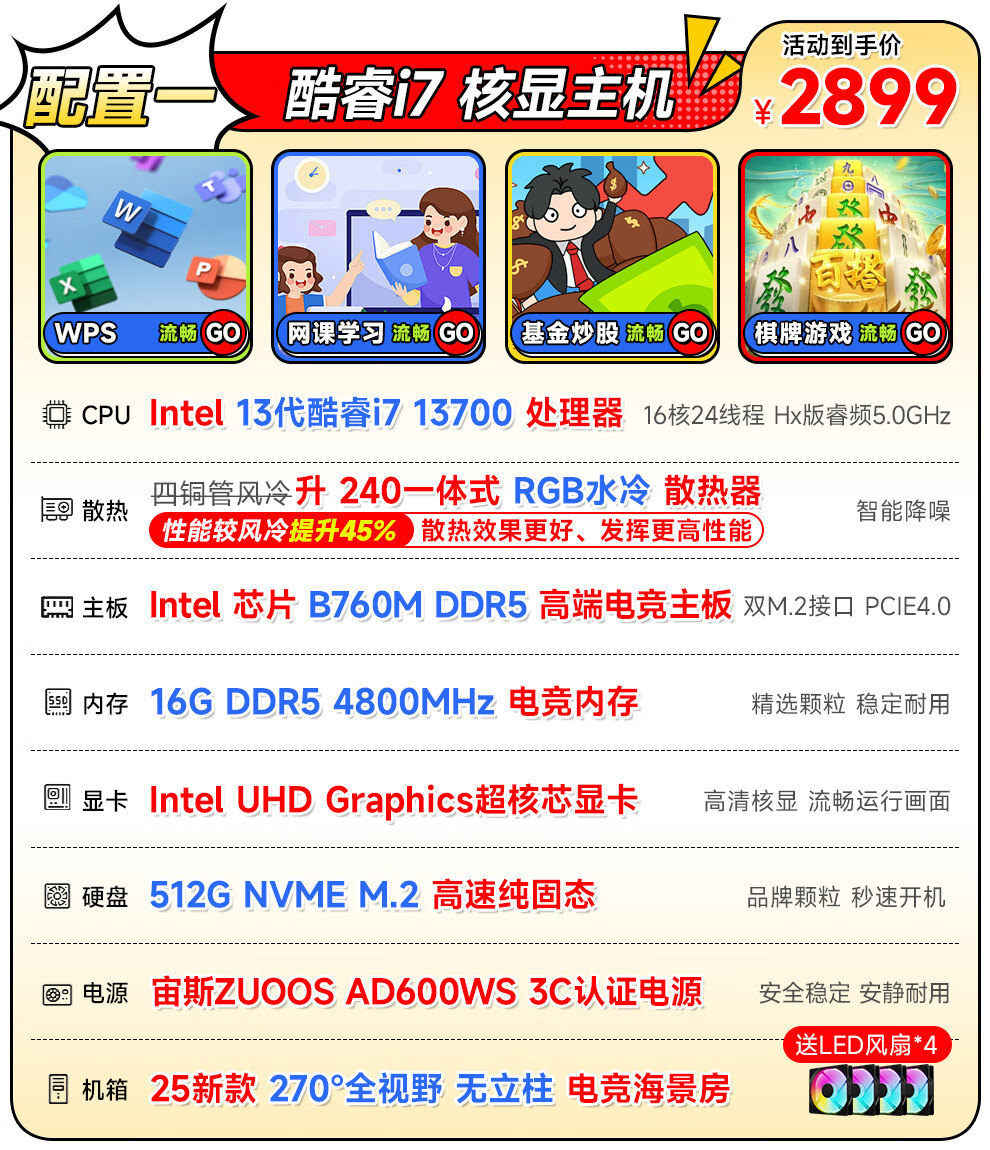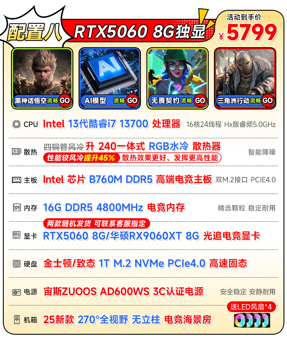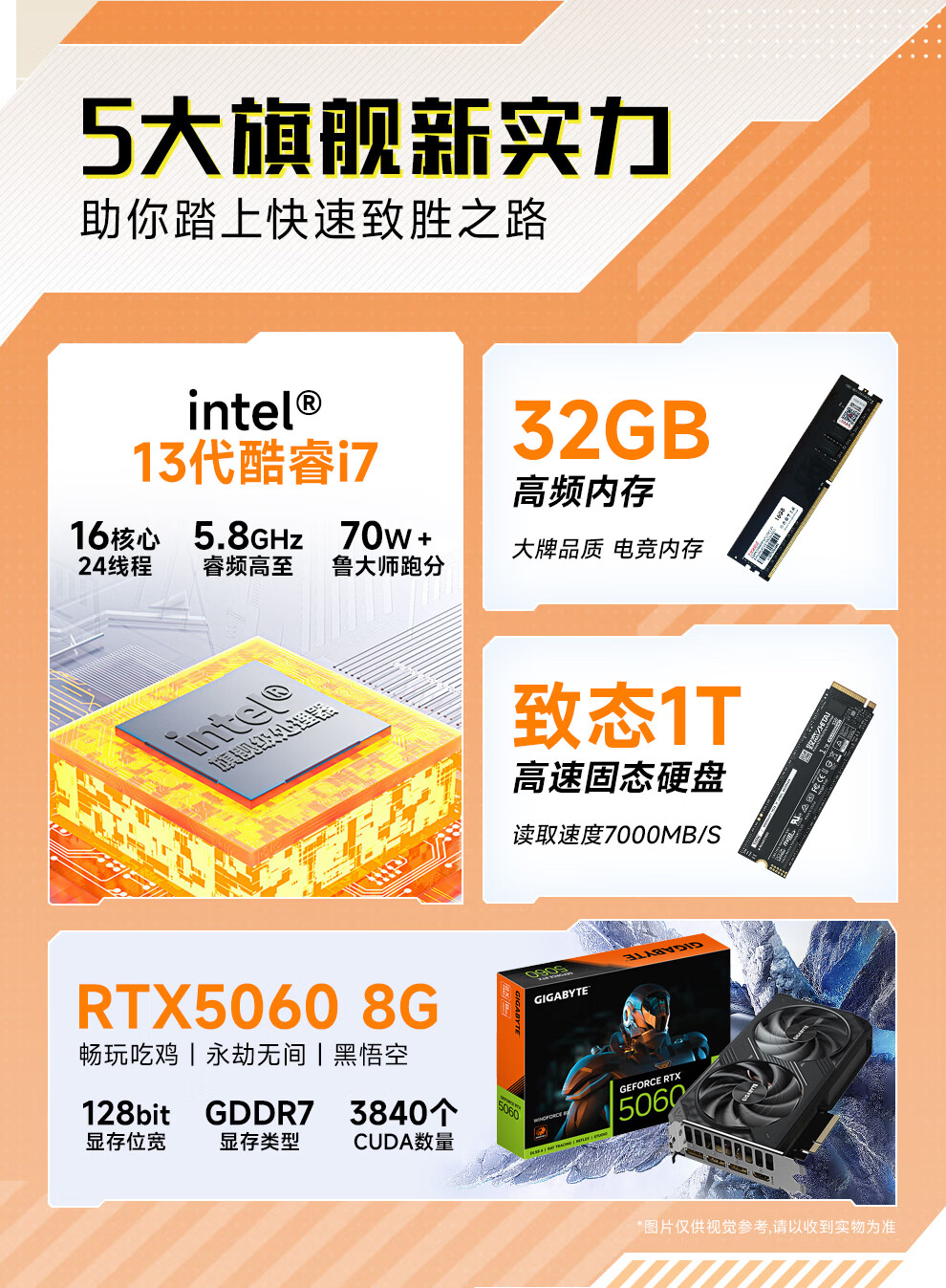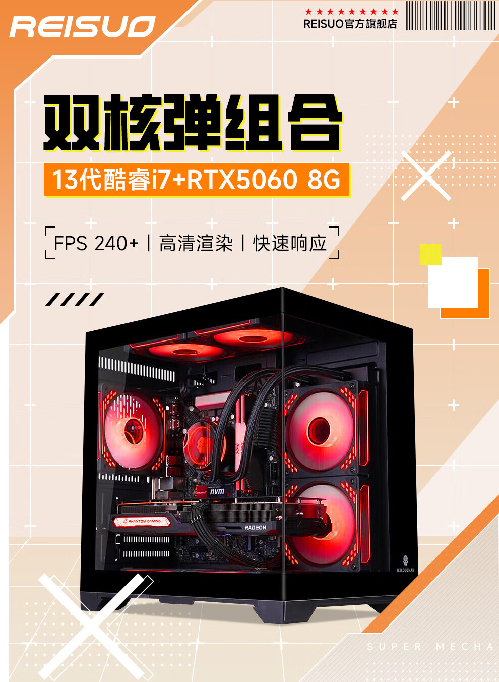 Leisuo 13th generation Core i7 13700/RTX3060/5060/5060Ti high-end HX version desktop assembly computer console game high-end live broadcast design rendering DIY complete machine configuration one 13th generation Core i7丨16G+512G
