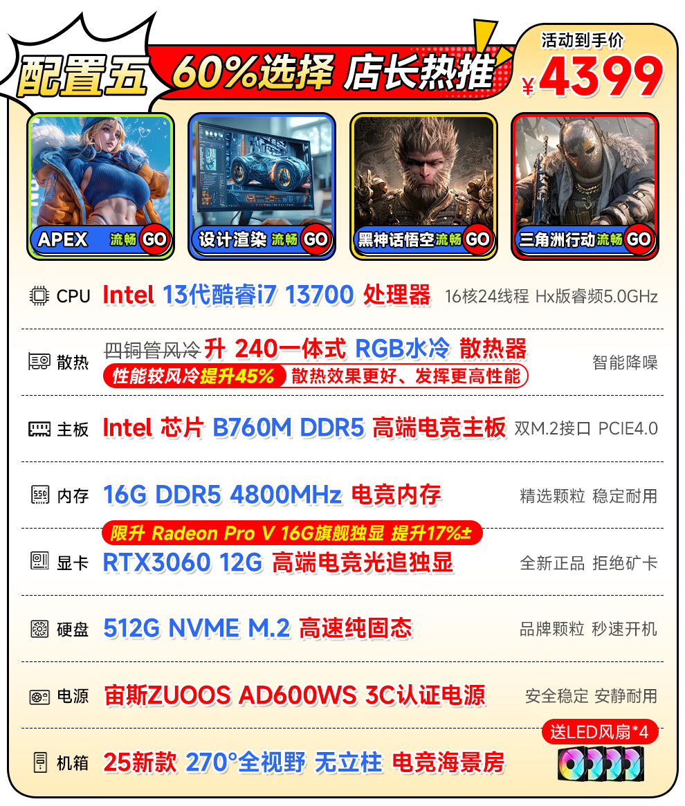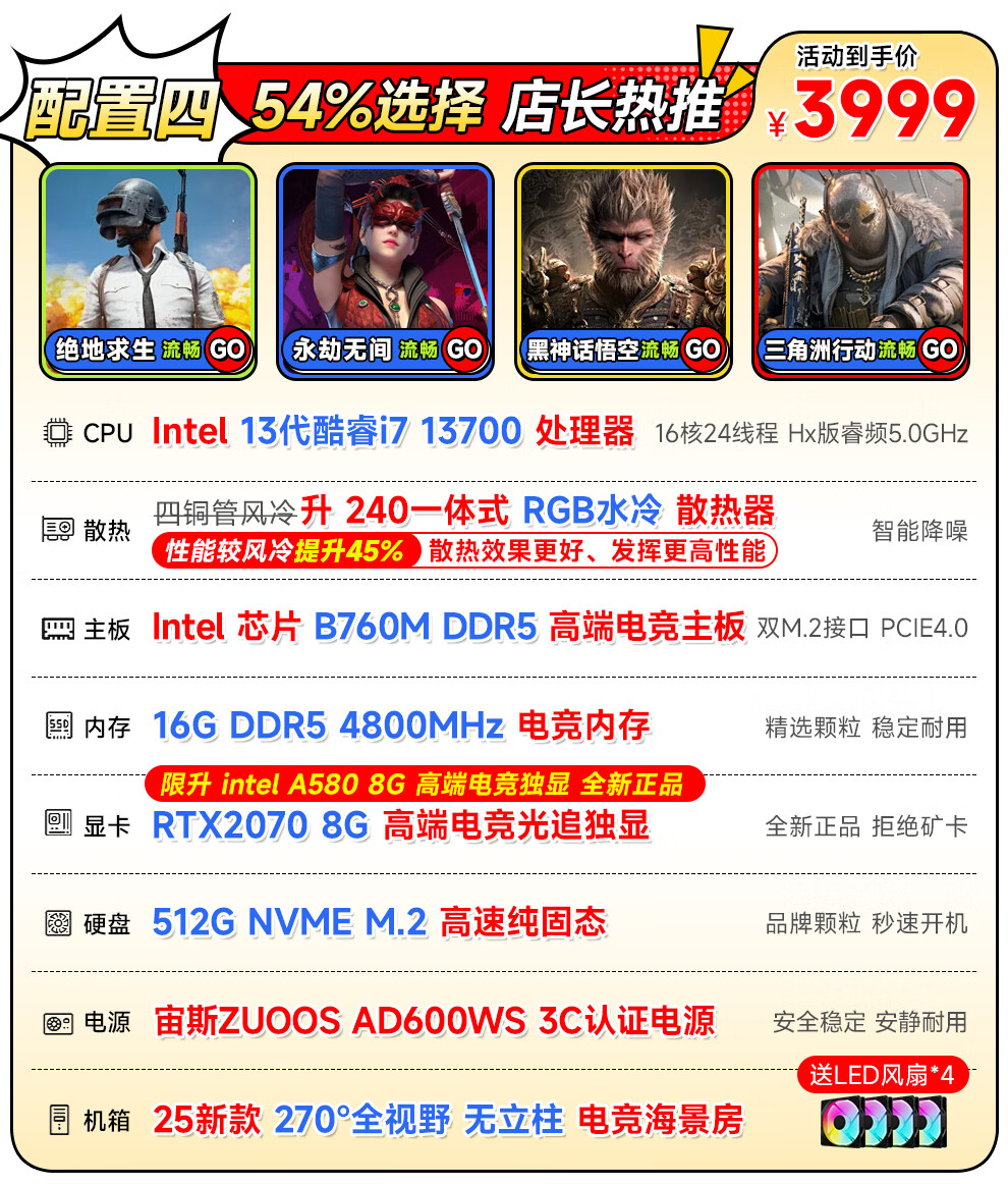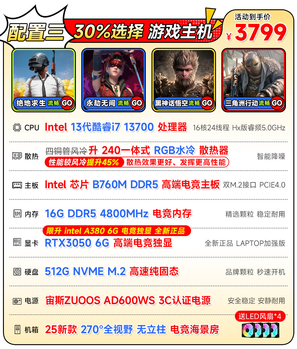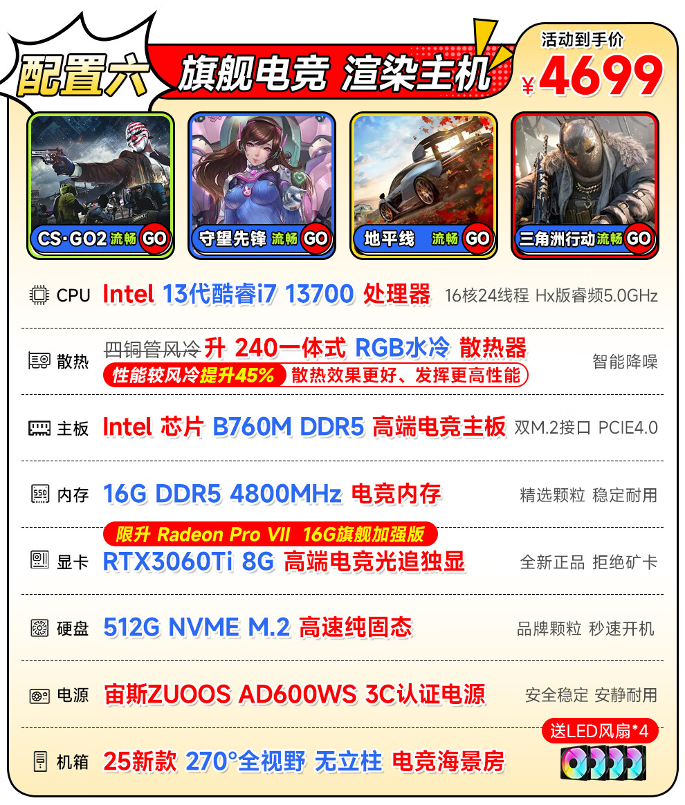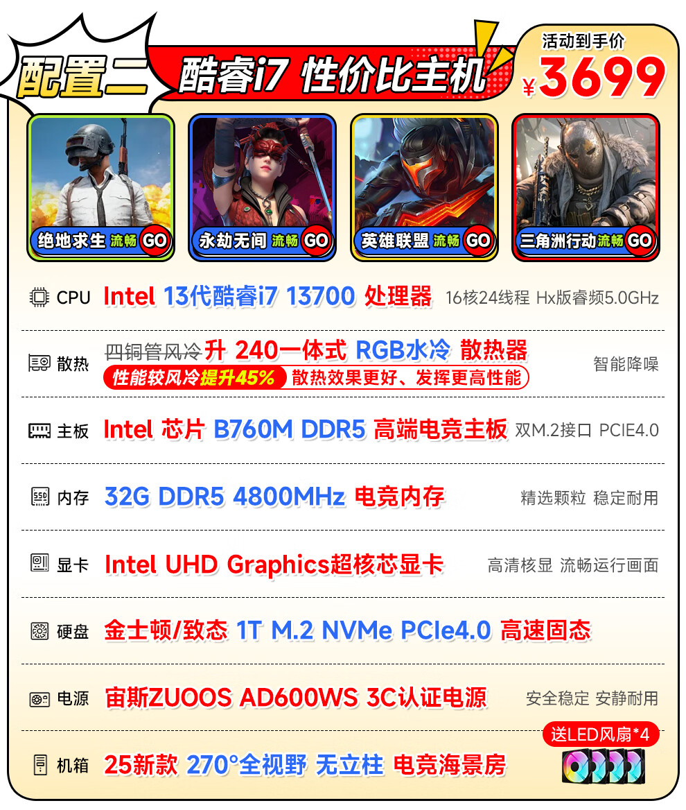 Leisuo 13th generation Core i7 13700/RTX3060/5060/5060Ti high-end HX version desktop assembly computer console game high-end live broadcast design rendering DIY complete machine configuration one 13th generation Core i7丨16G+512G