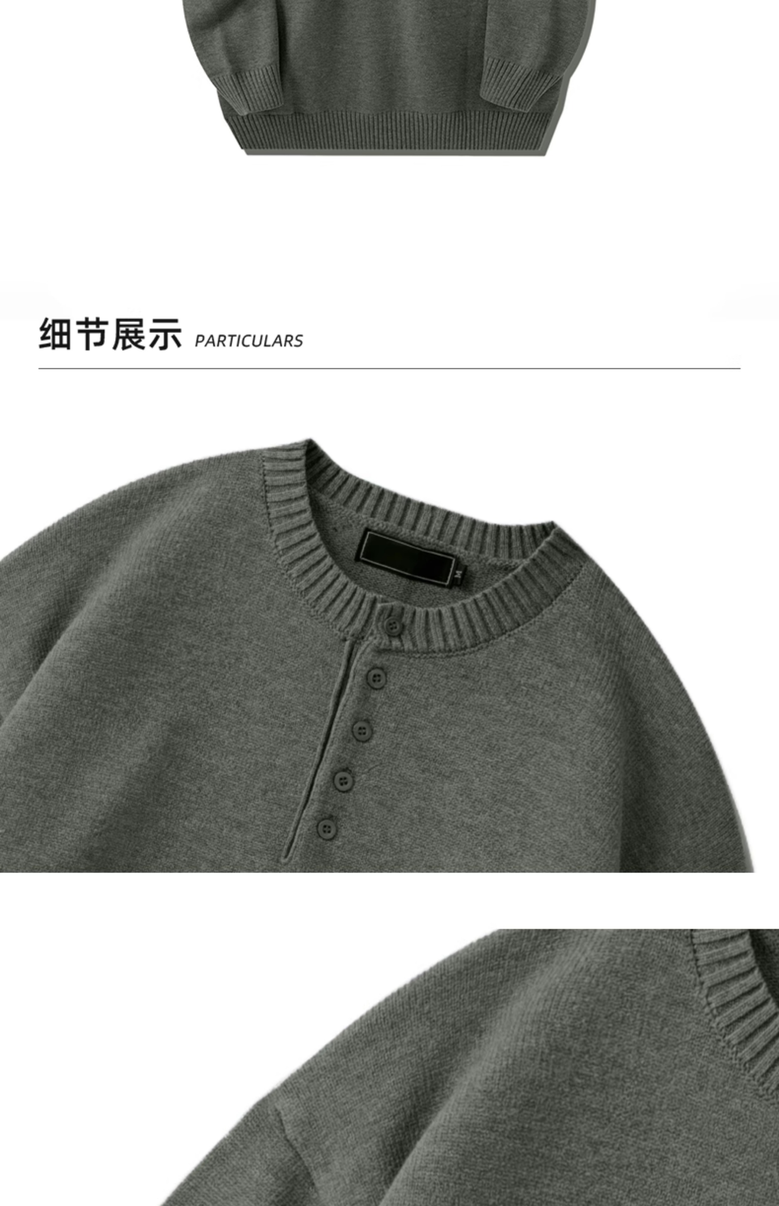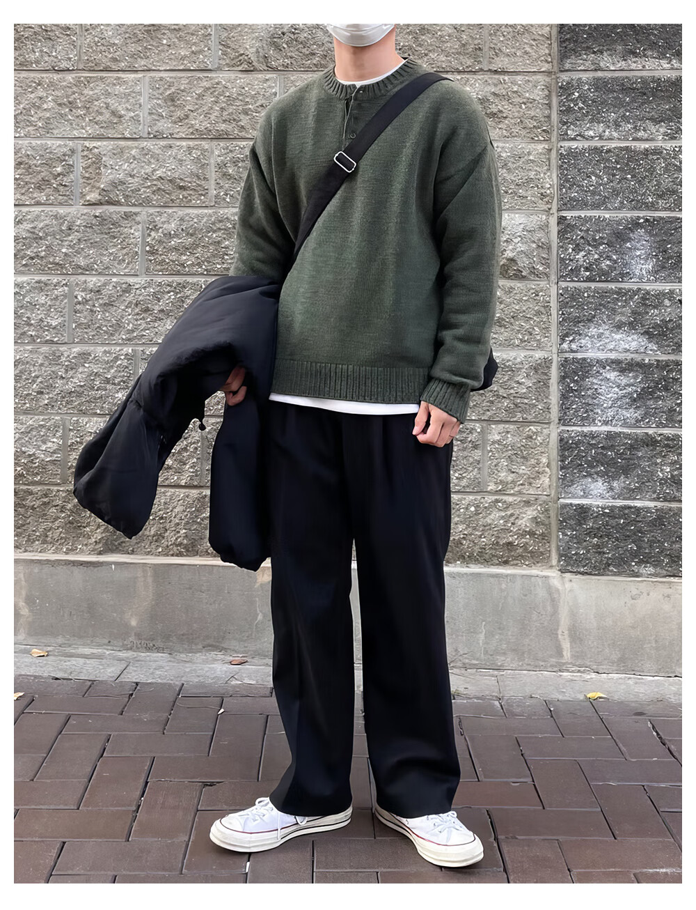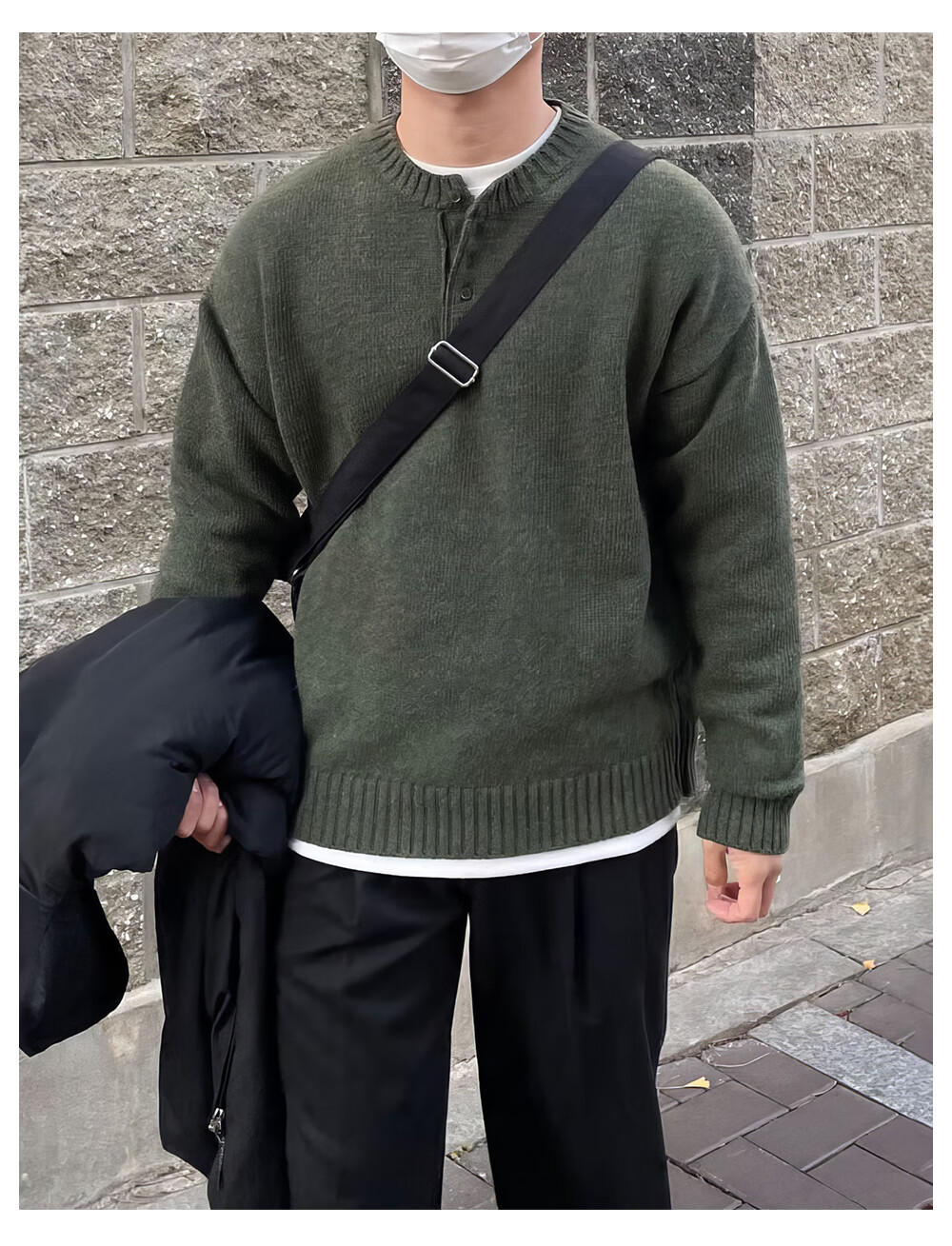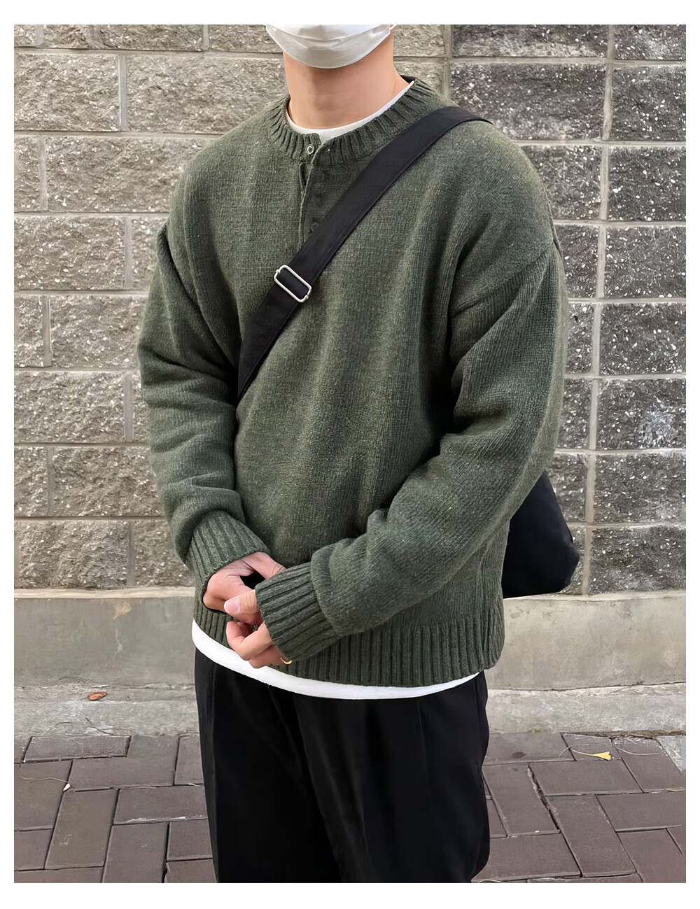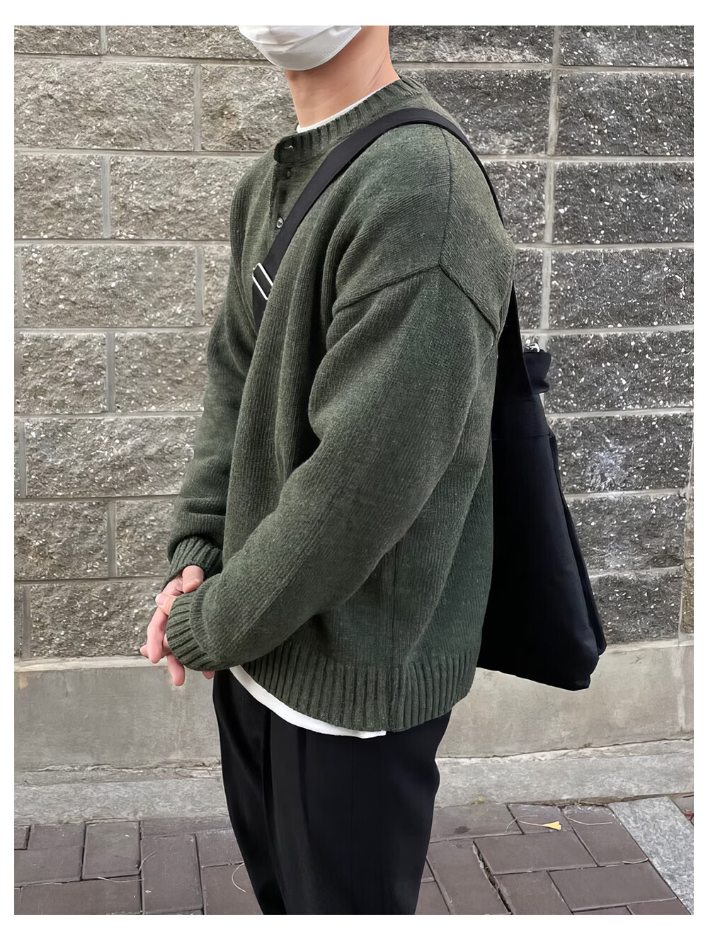 DAVID&ME Henry collar sweater men's spring and autumn new style Japanese retro light literary casual simple versatile loose pullover sweater Army Green M