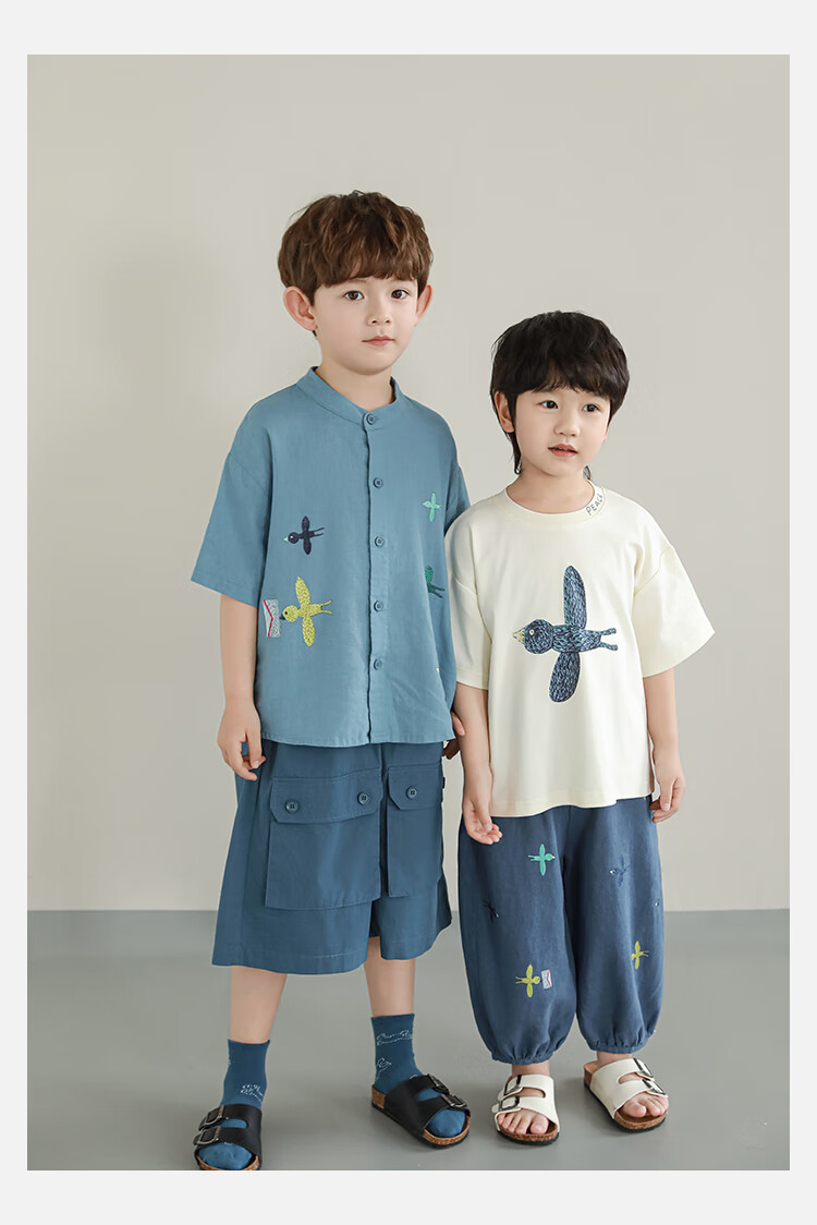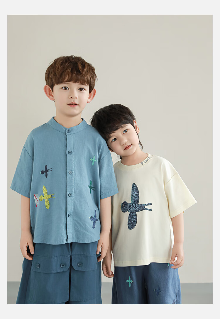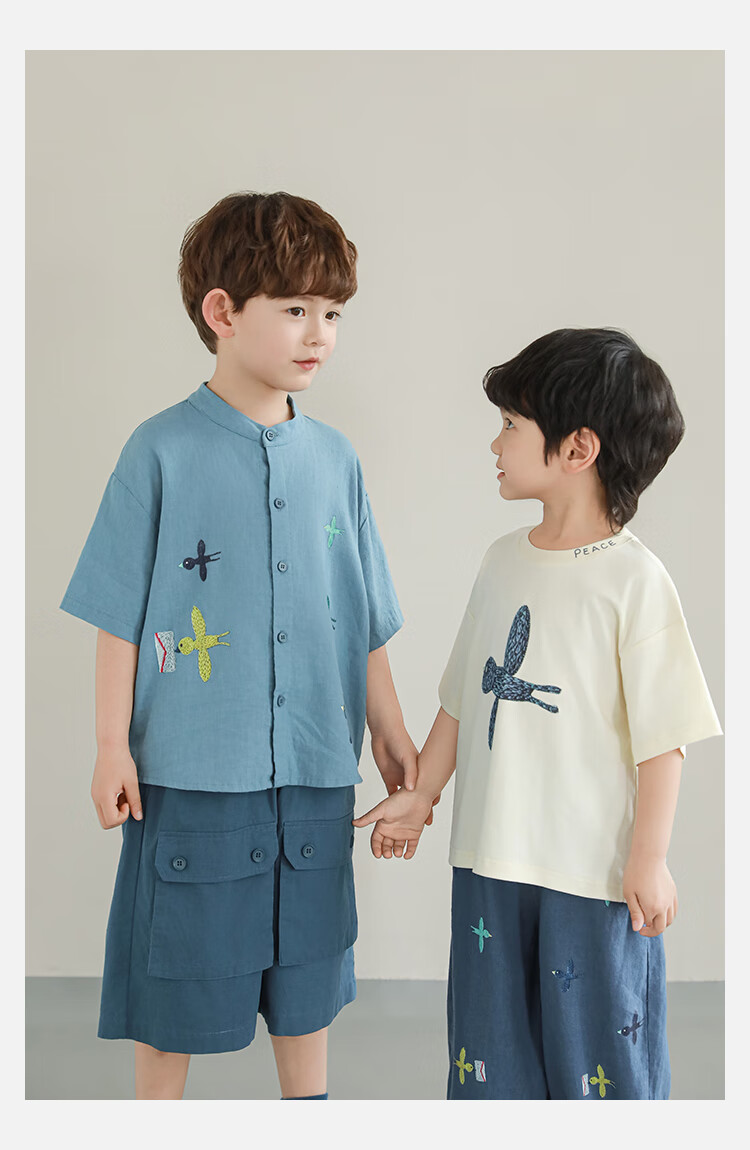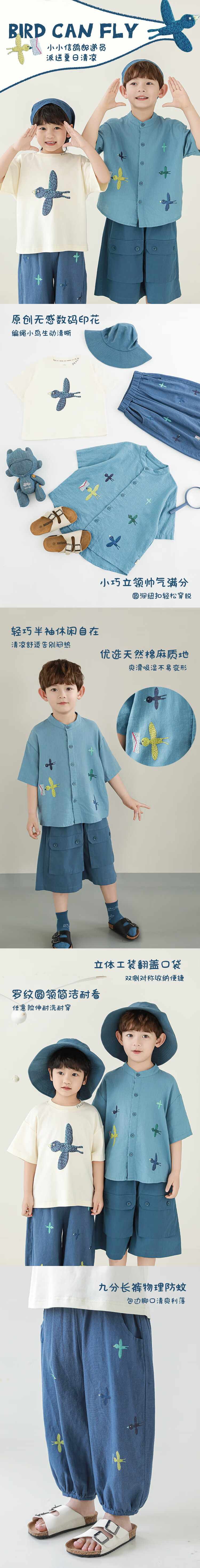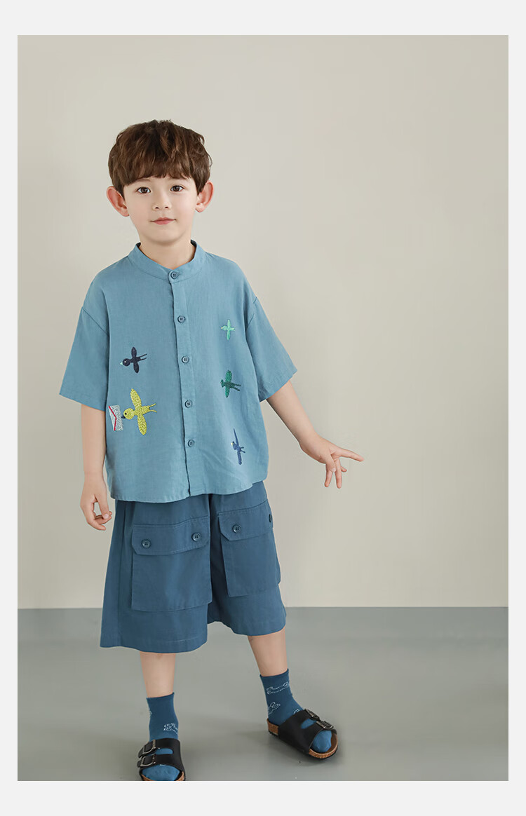Youyou boys 2025 summer new short-sleeved T-shirt round neck handsome shirt overalls shorts carrier pigeon suit shirt blue green N5729 80 cm