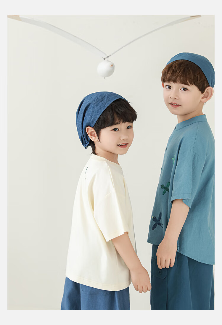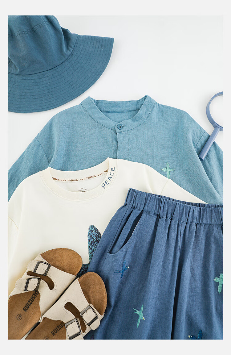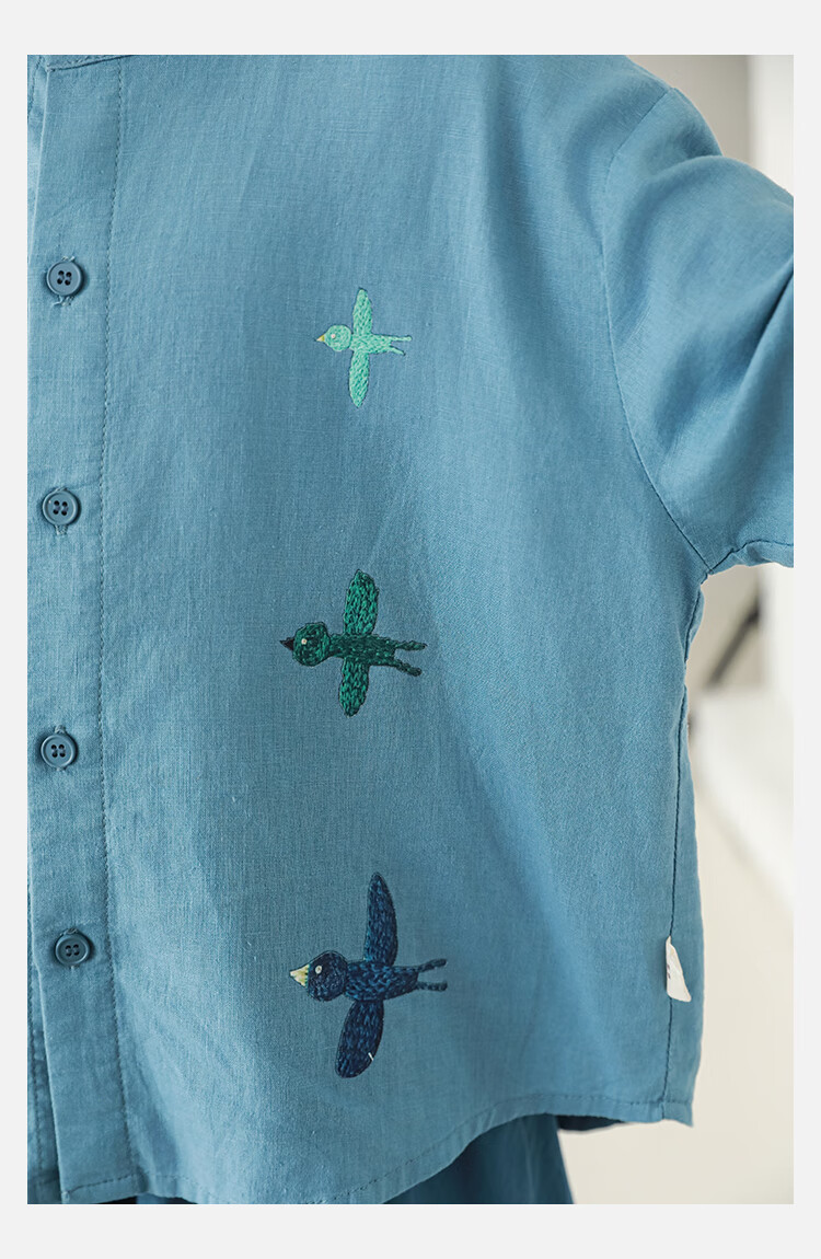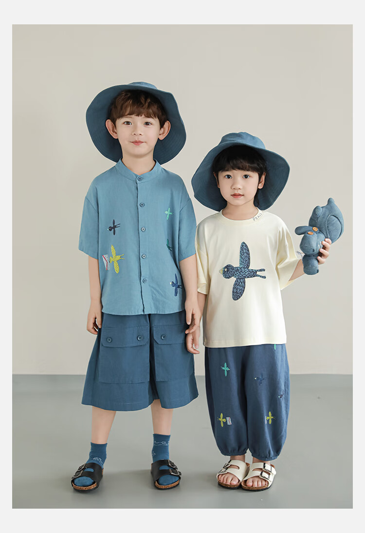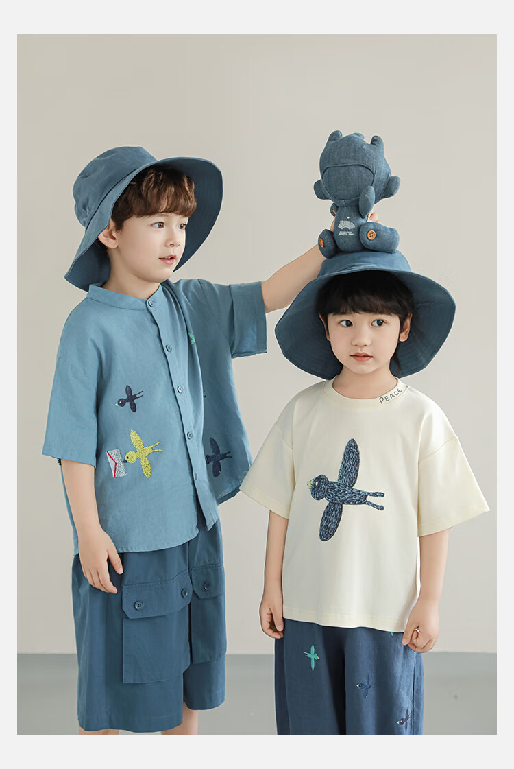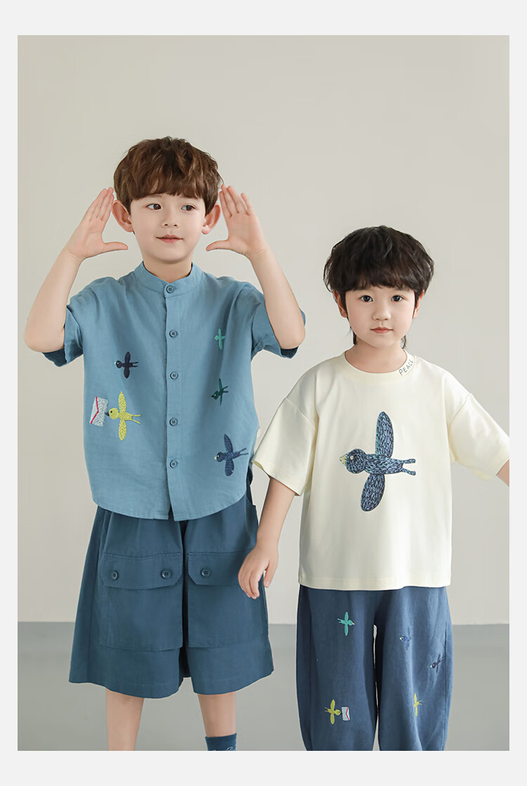Youyou boys 2025 summer new short-sleeved T-shirt round neck handsome shirt overalls shorts carrier pigeon suit shirt blue green N5729 80 cm