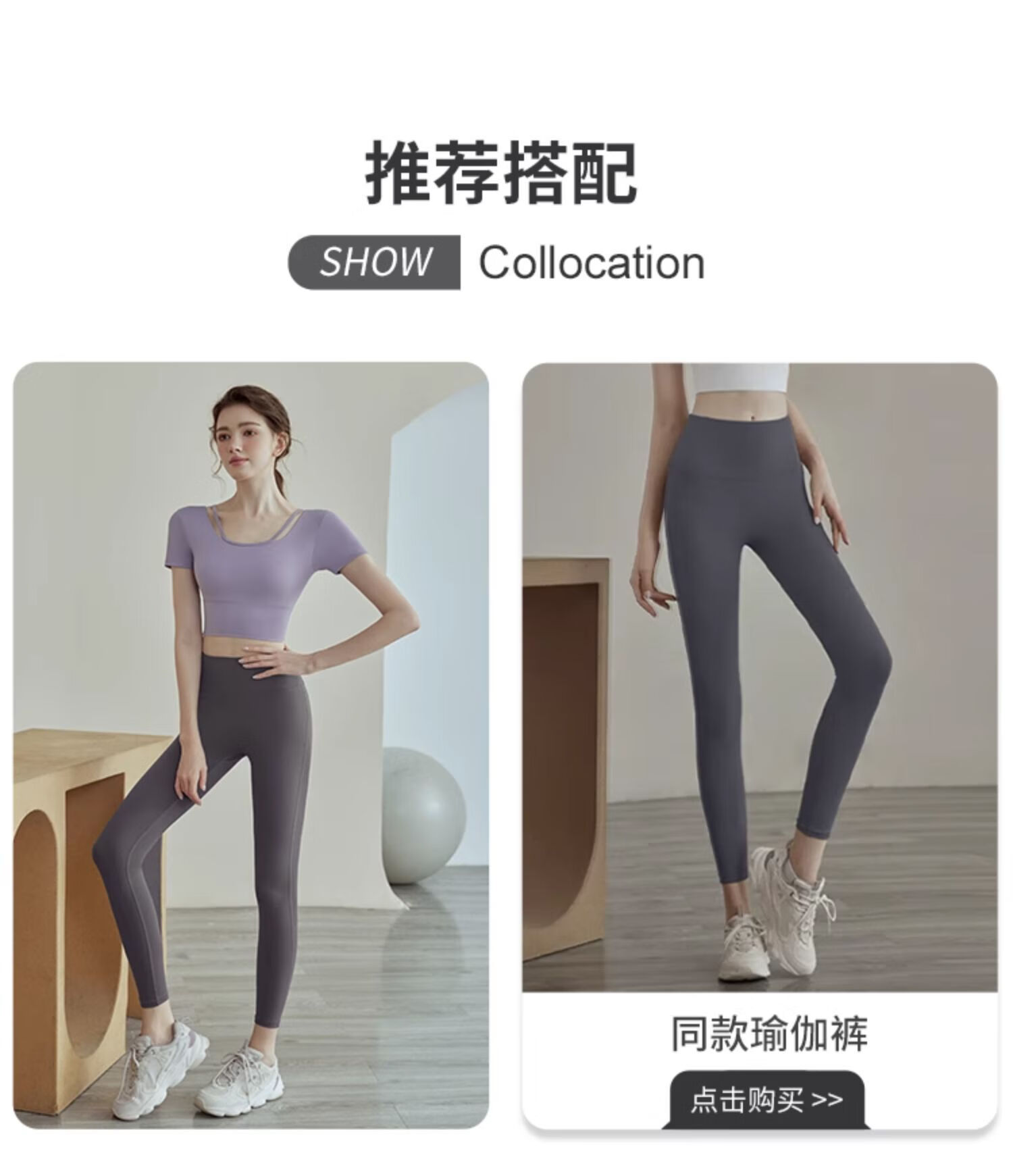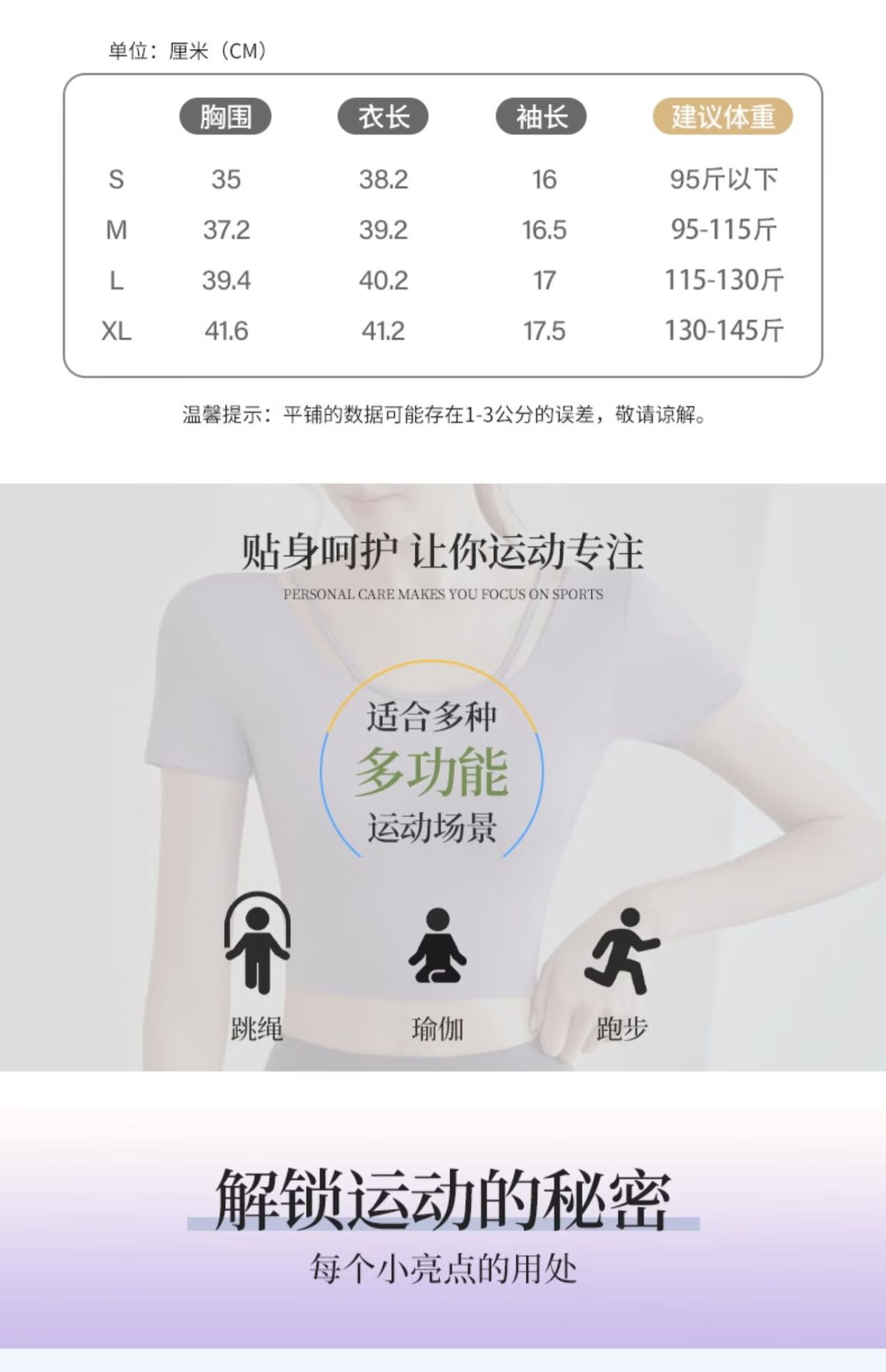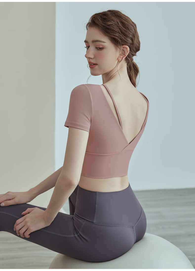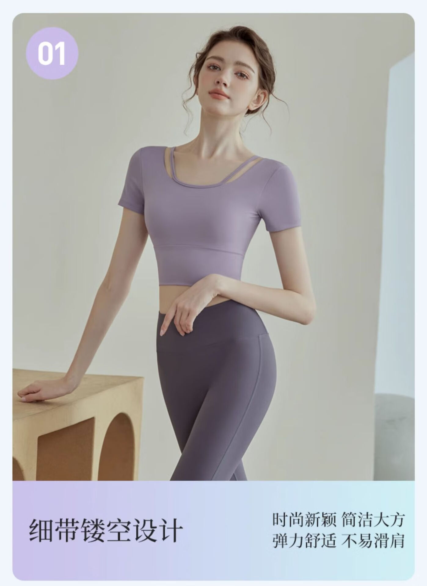 Bright dipped yoga tops for women with chest pads solid color short-sleeved professional Pilates sports T-shirts slim running training fitness clothes purple fixed cup M