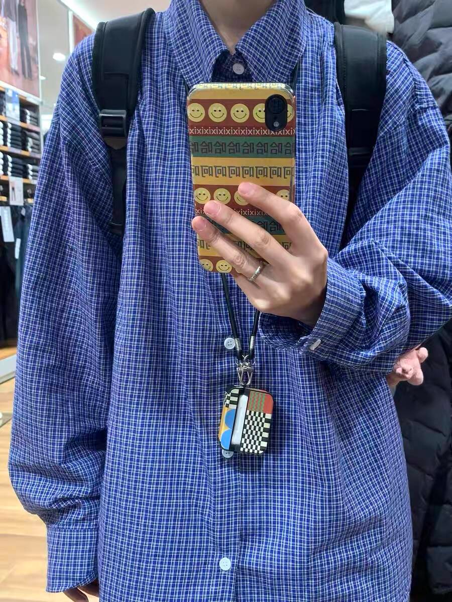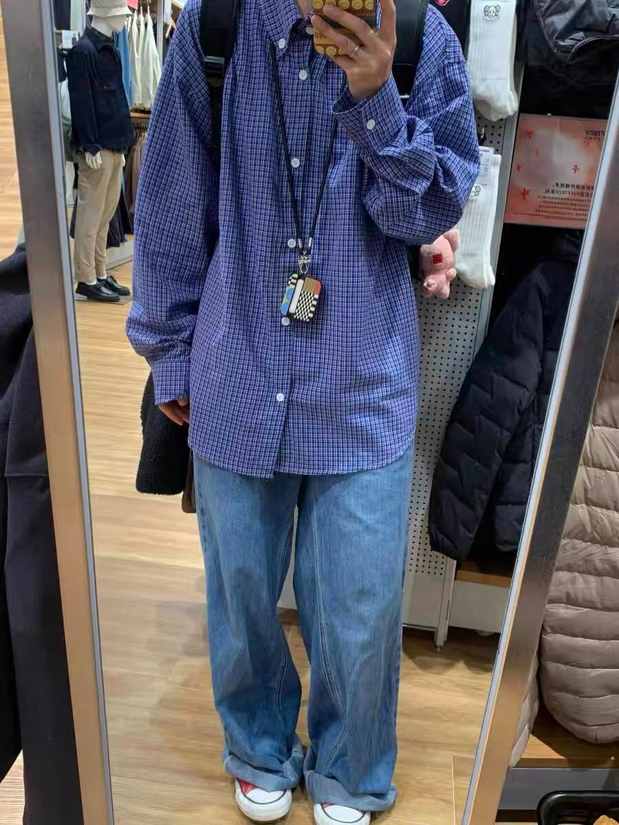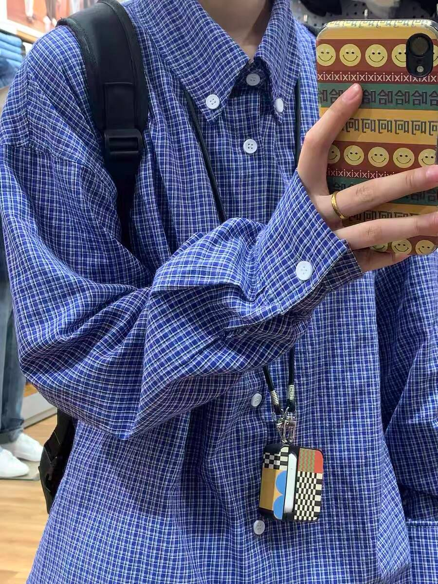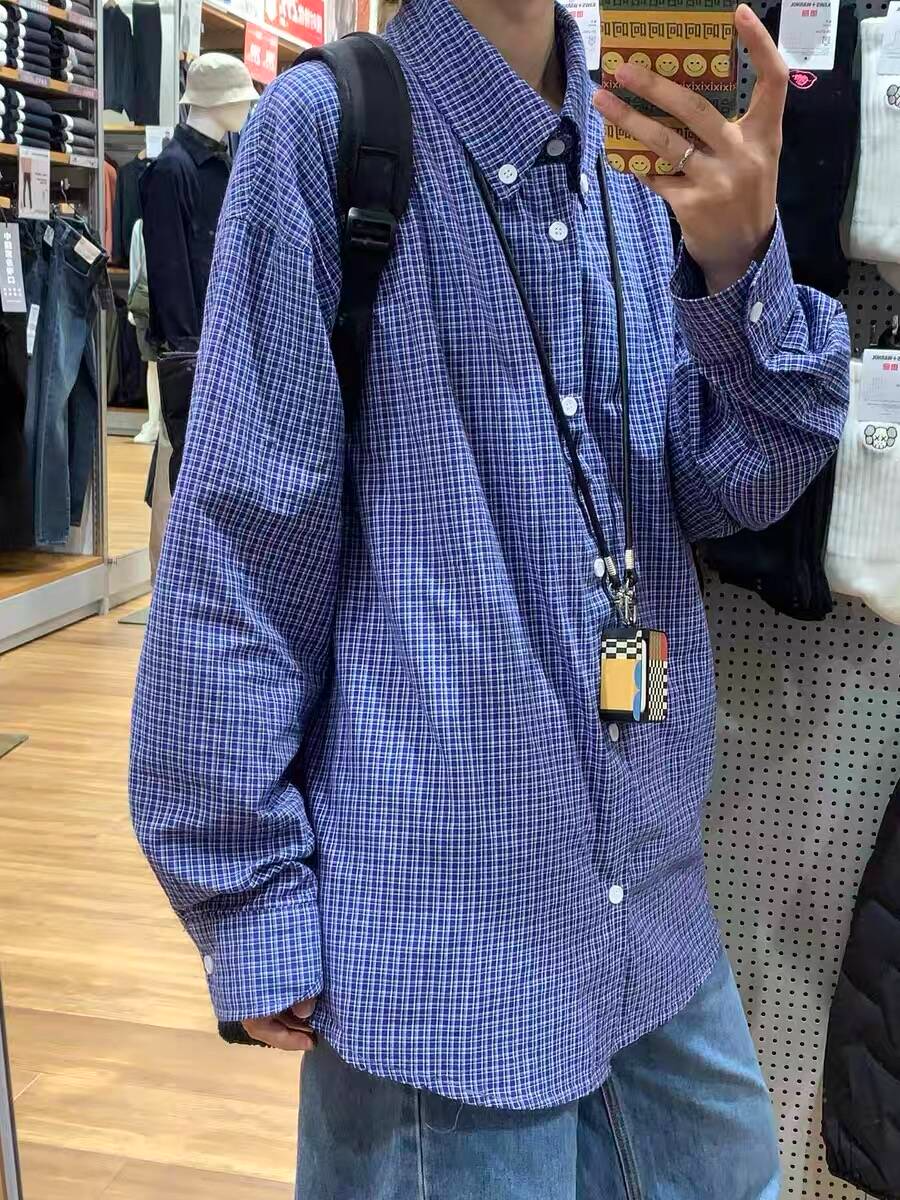 American retro blue plaid long-sleeved shirt for men spring and autumn Korean style loose-feeling embroidered plaid shirt jacket blue-C216 L