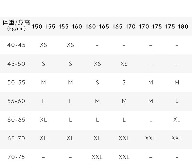 China (cm) 160-165/84-86 165-170 / 88-90 167-172 / 92-96 168-173 / 98-102 170-176 / 106-110