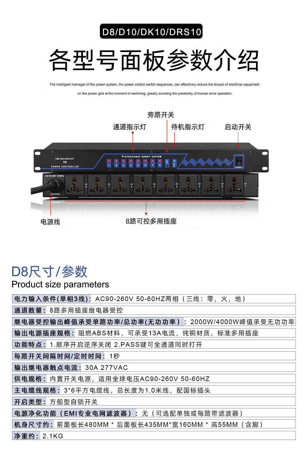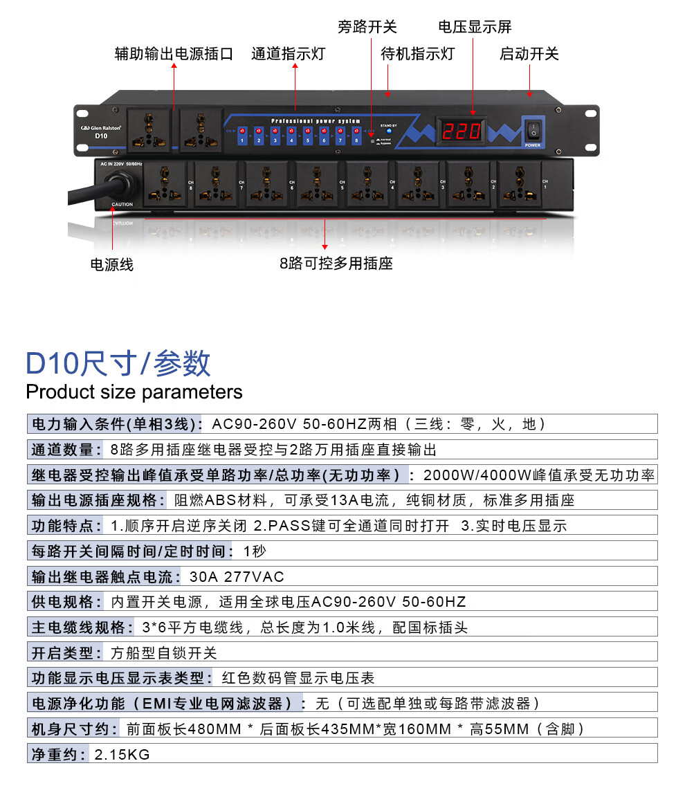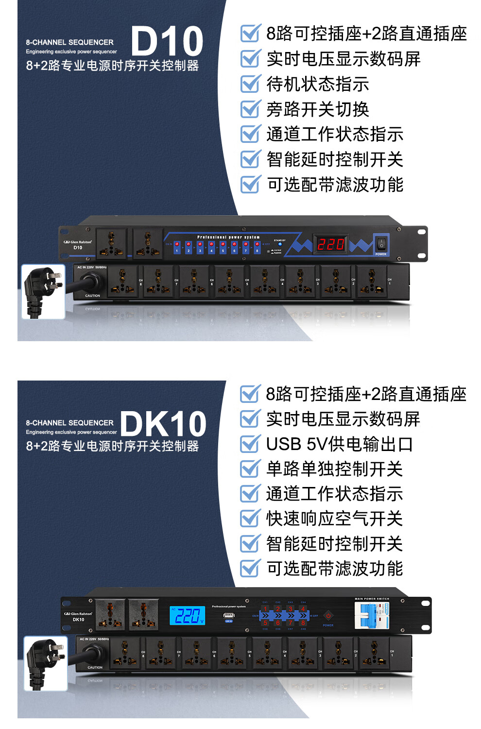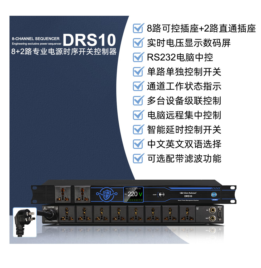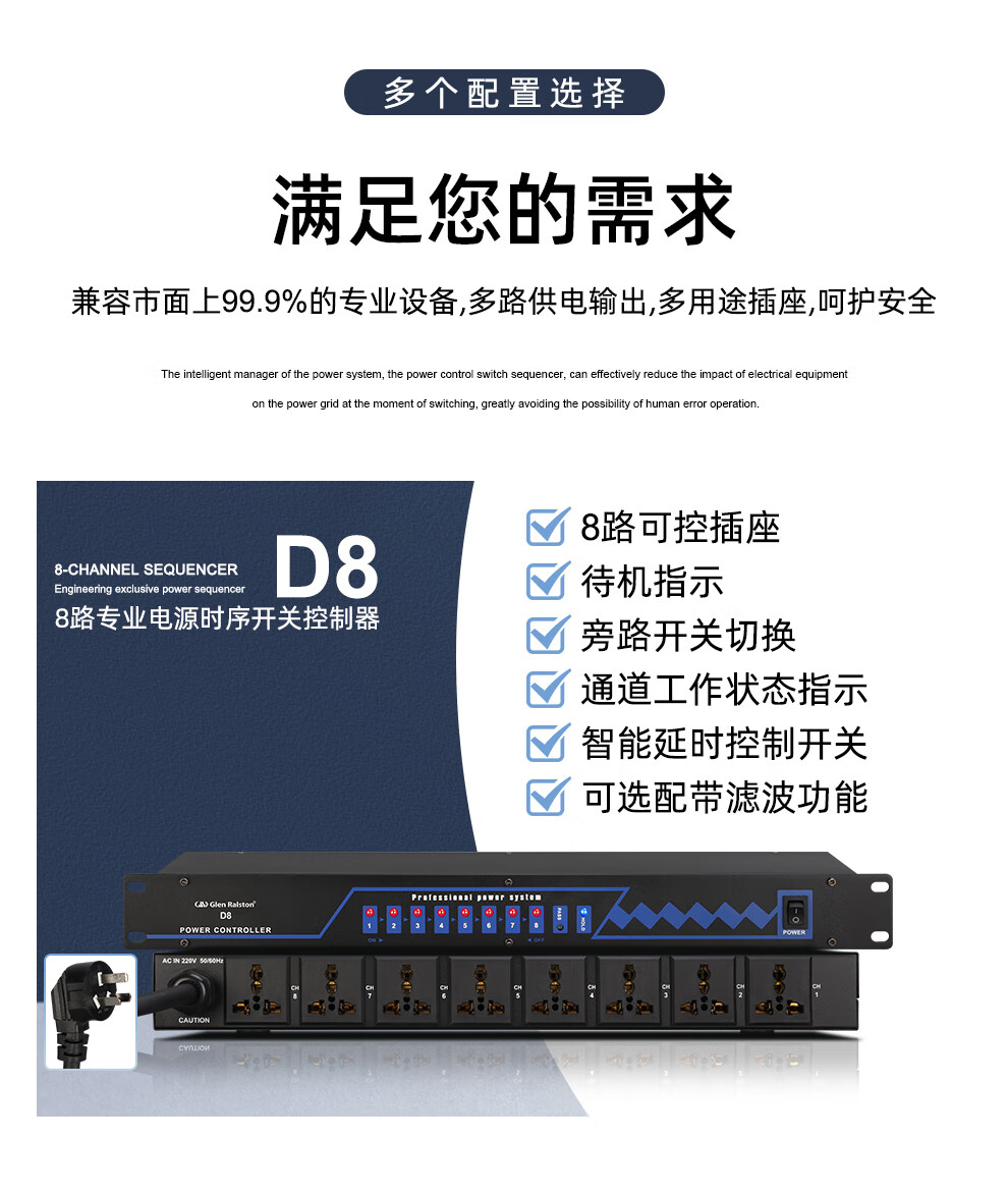 Glenston professional D8 10-way power supply sequencer with filter engineering RS232 serial port cascade network remote central control independent sequence switch controller conference stage broadcast conference D8 (8-way power switch sequencer with filter)
