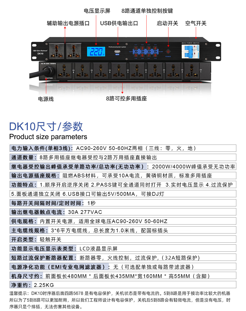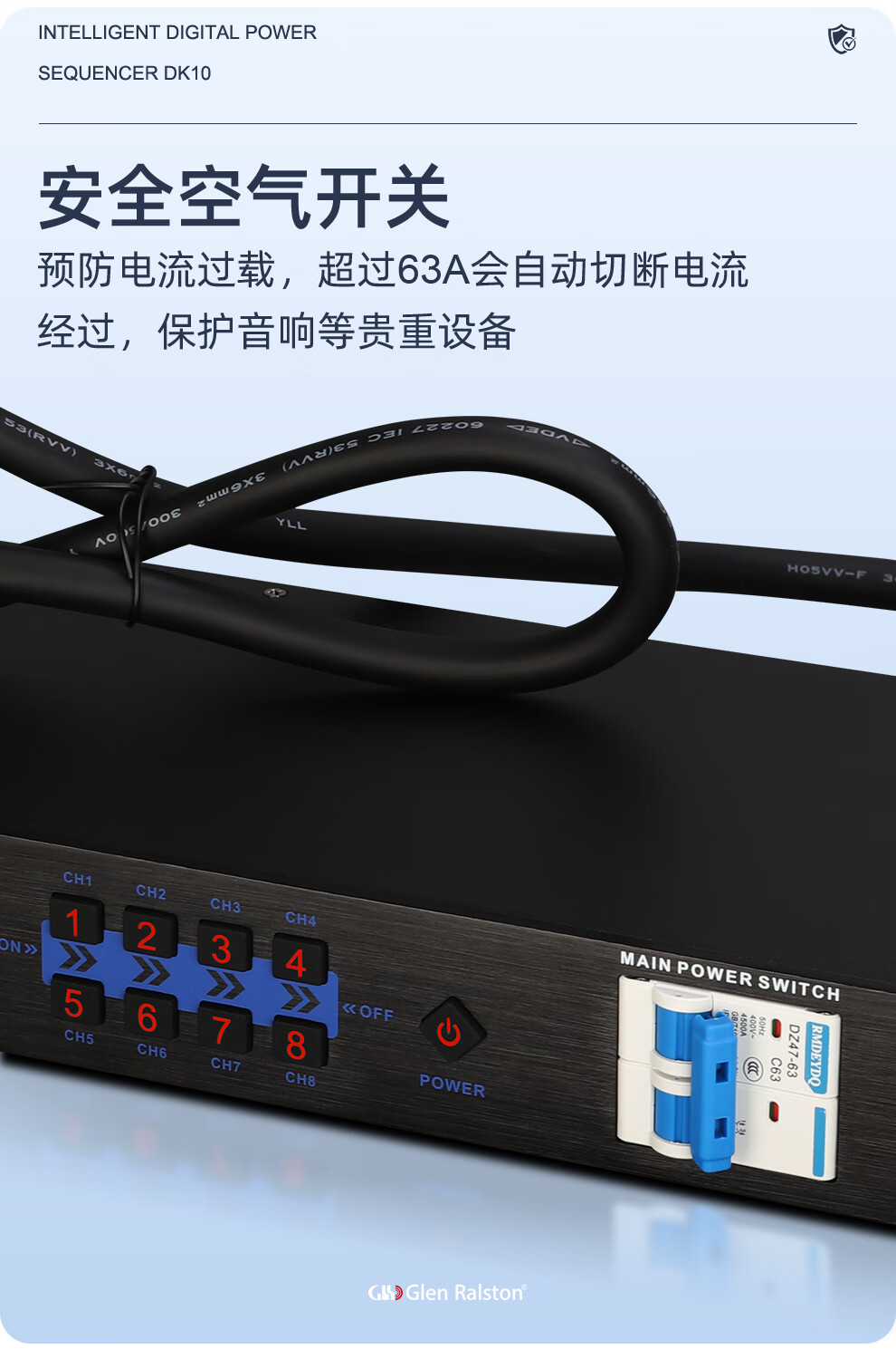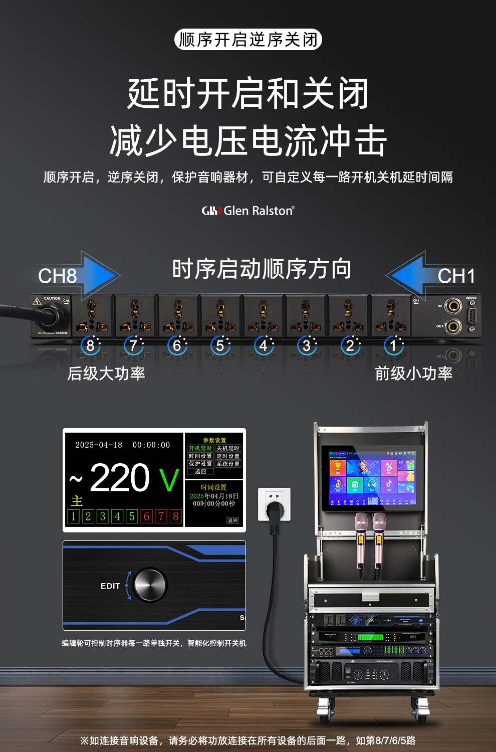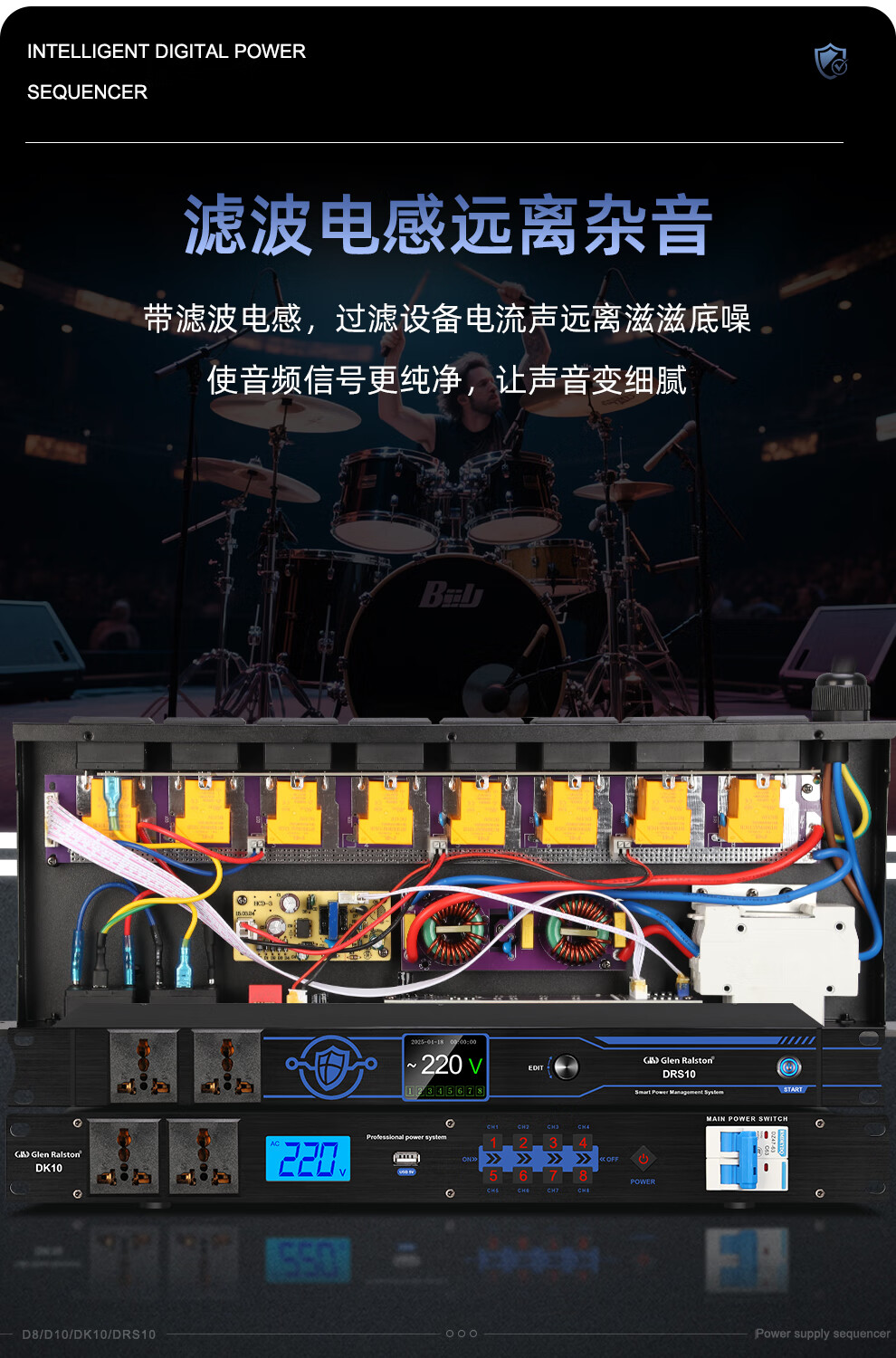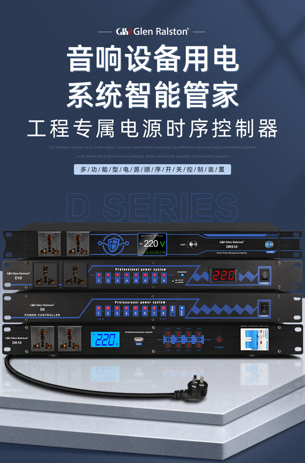 Glenston professional D8 10-way power supply sequencer with filter engineering RS232 serial port cascade network remote central control independent sequence switch controller conference stage broadcast conference D8 (8-way power switch sequencer with filter)