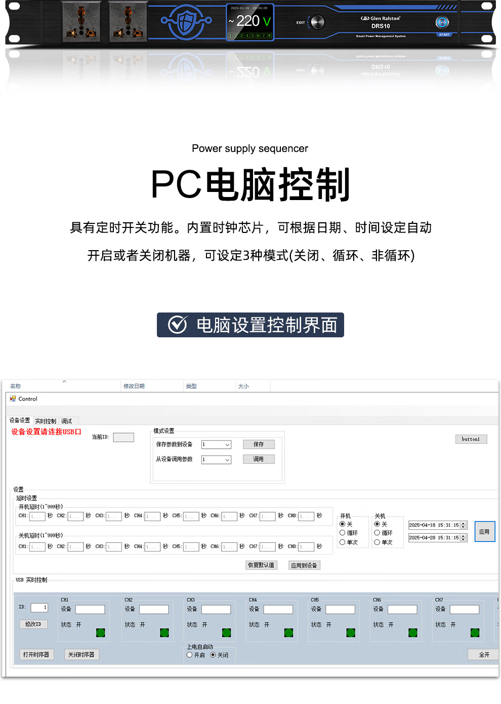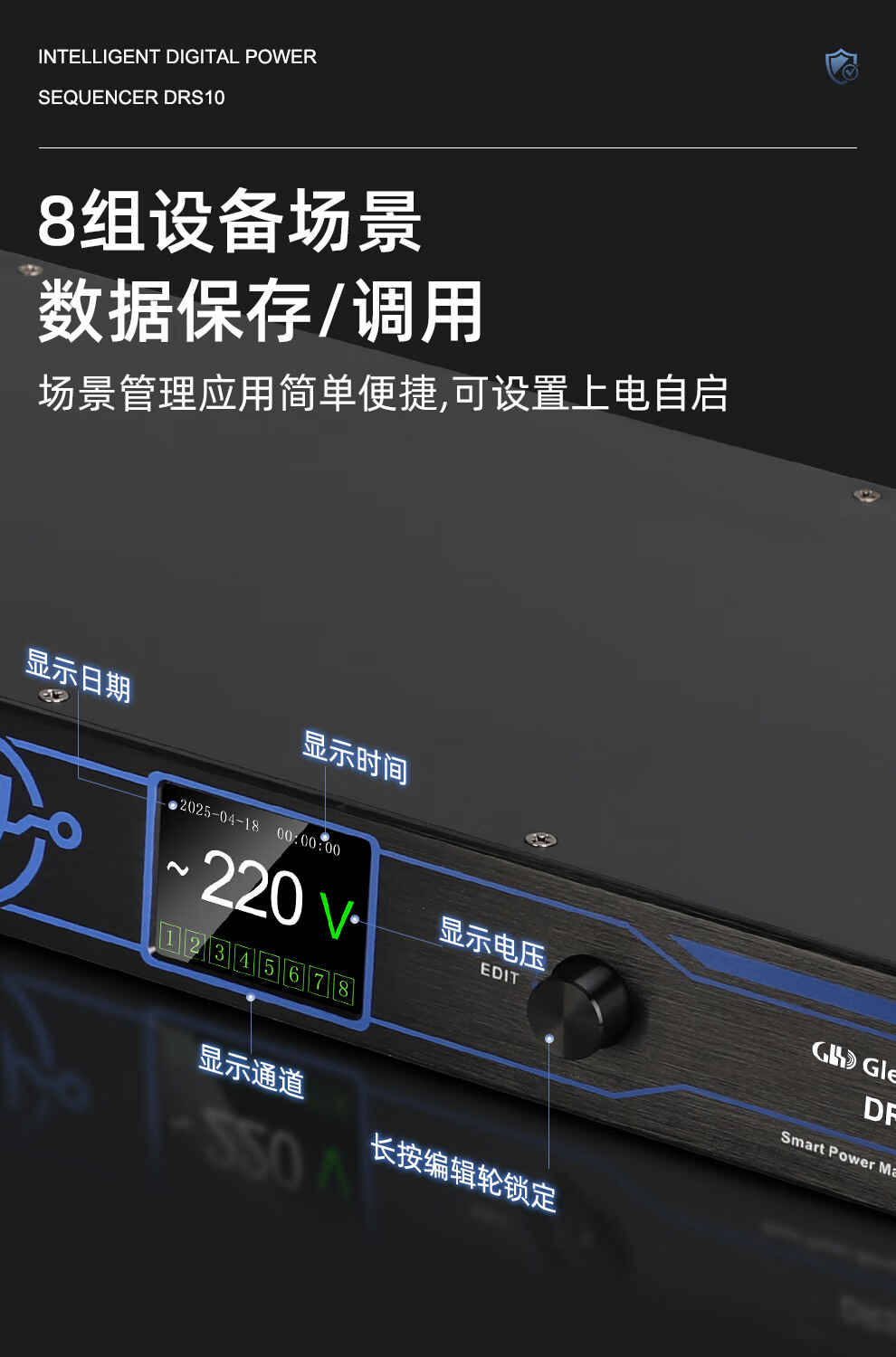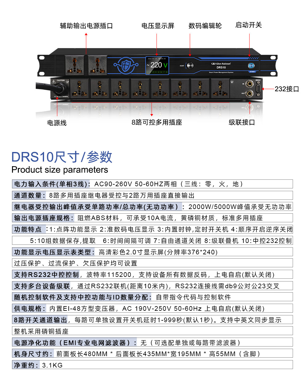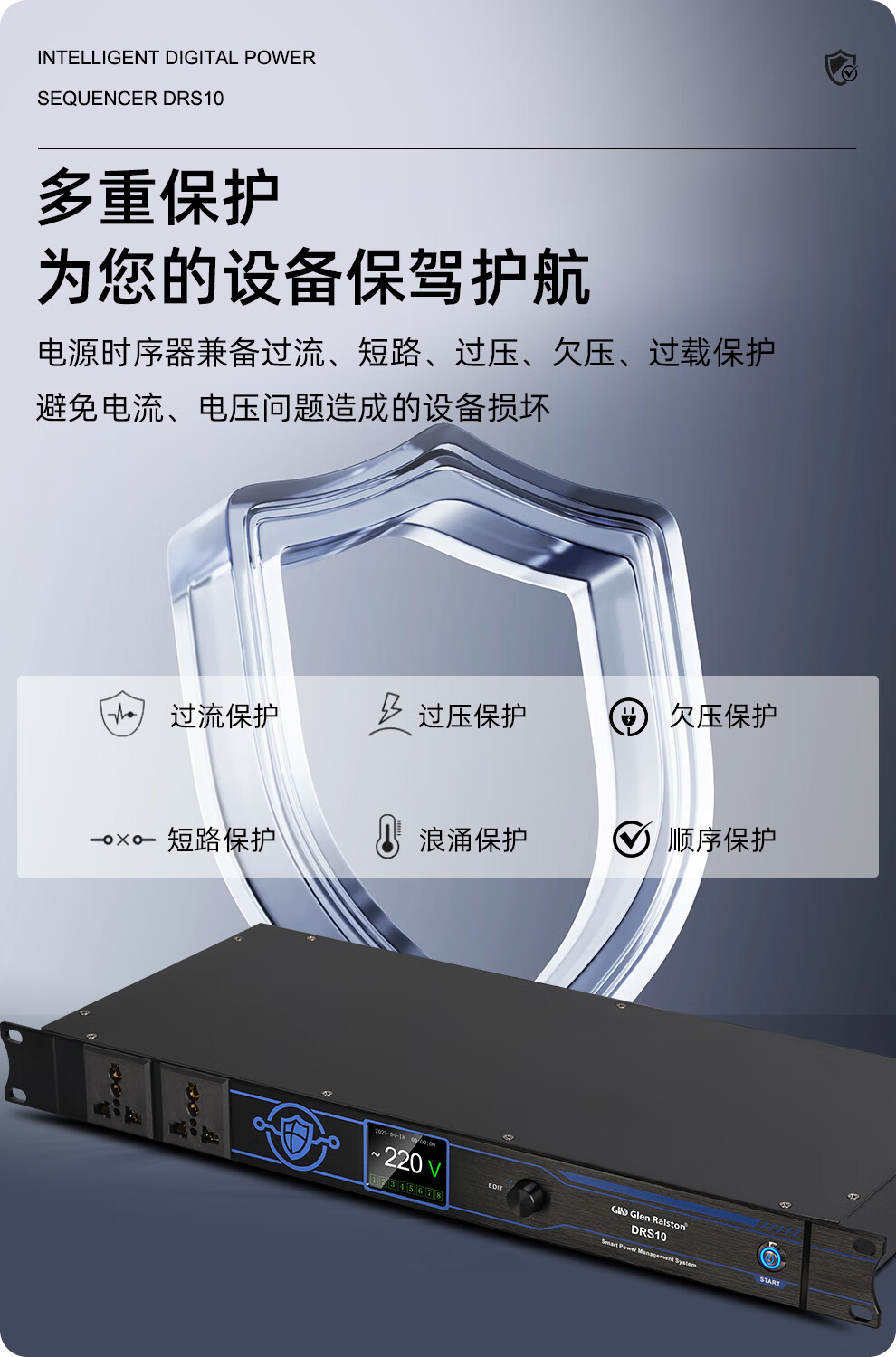 Glenston professional D8 10-way power supply sequencer with filter engineering RS232 serial port cascade network remote central control independent sequence switch controller conference stage broadcast conference D8 (8-way power switch sequencer with filter)