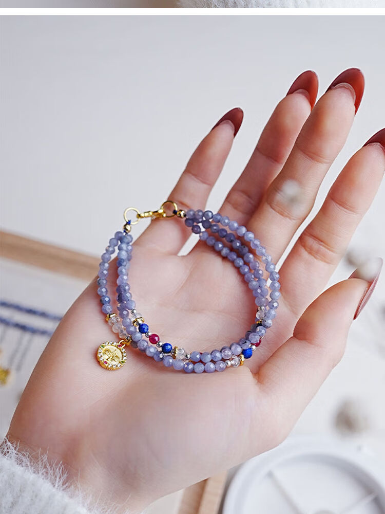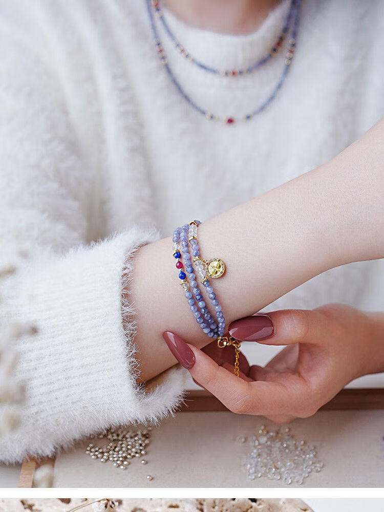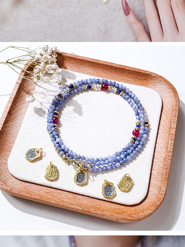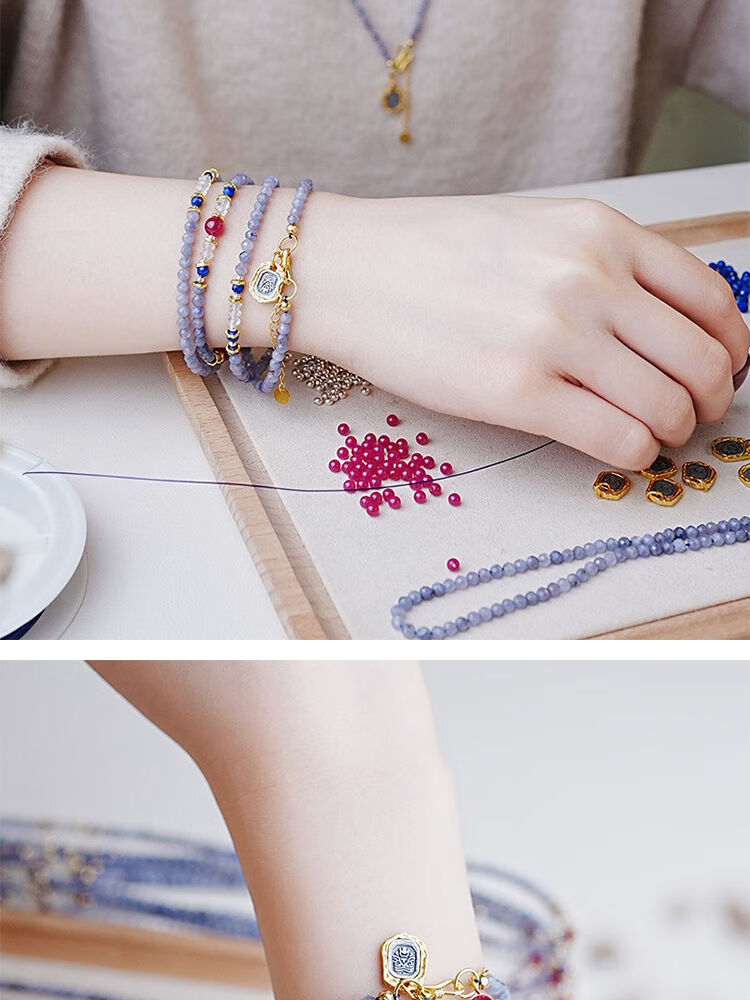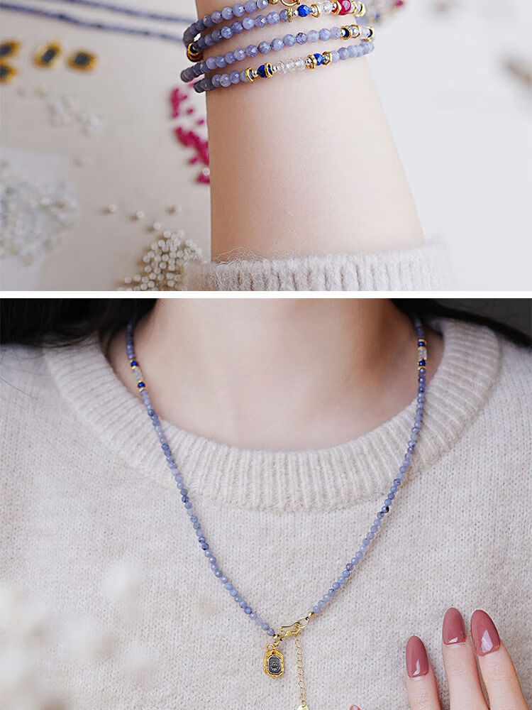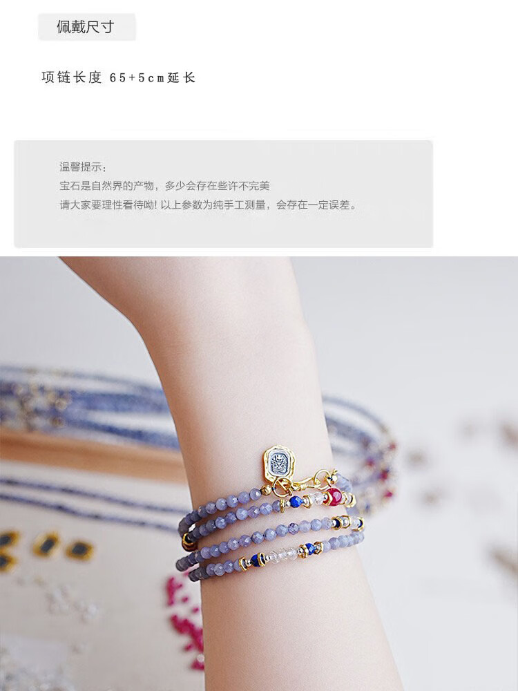 Oein Shanhai Original Wushuanghua Natural Tanzanite Faceted Millet Bead Bracelet Sapphire Necklace Multi-layer Bracelet 4mm Tanzanite Necklace Length 65+5cm Extended
