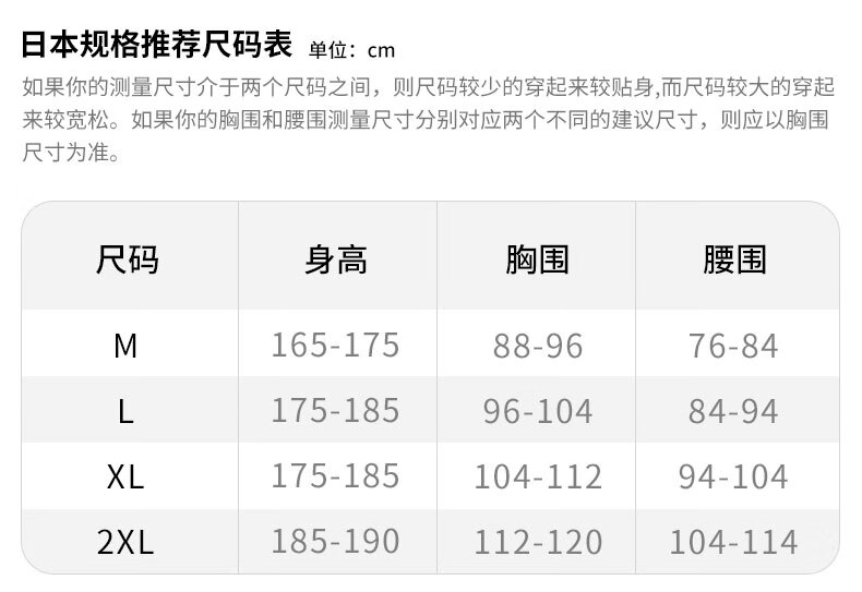China (cm) 165 / 88-90 170 / 96-98 175 / 108-110 180 / 118-122 185 / 126-130