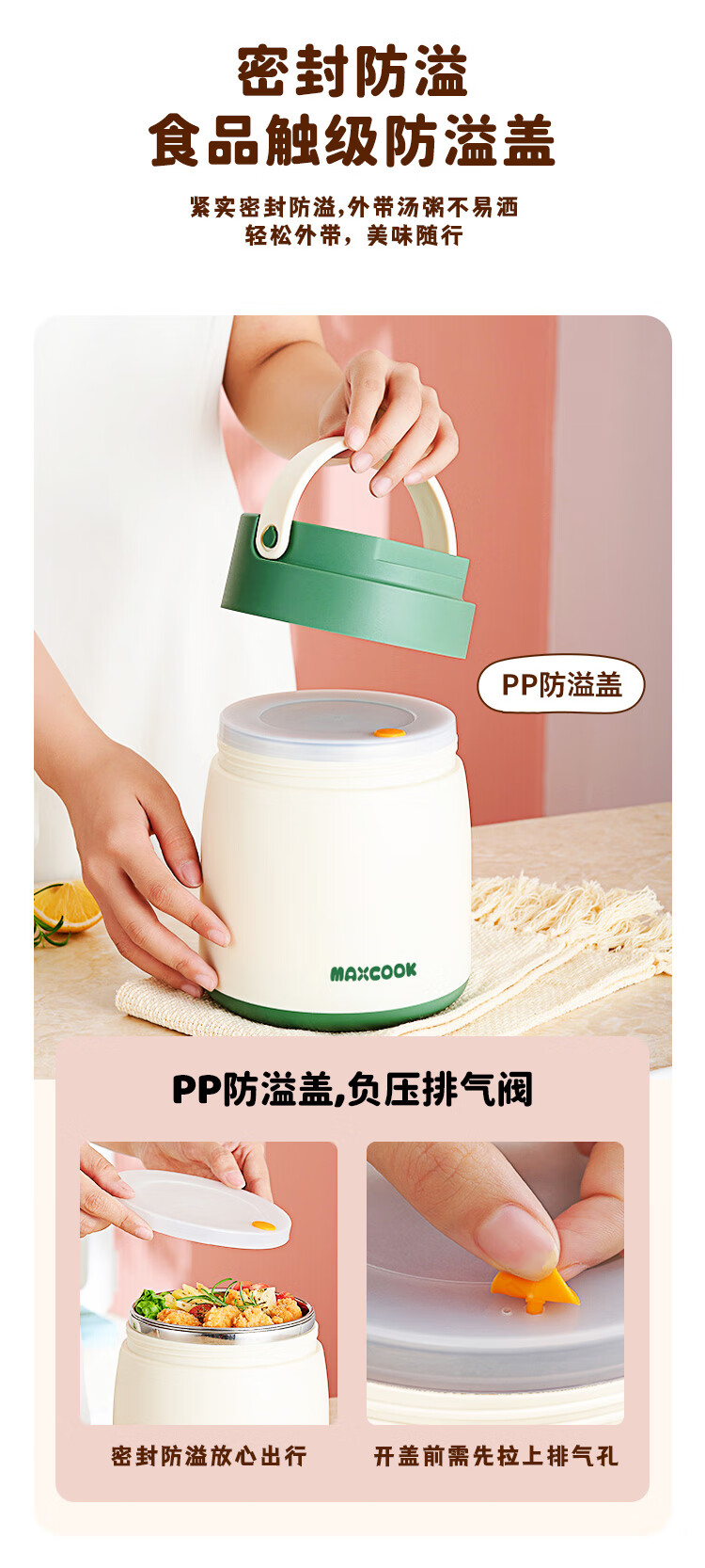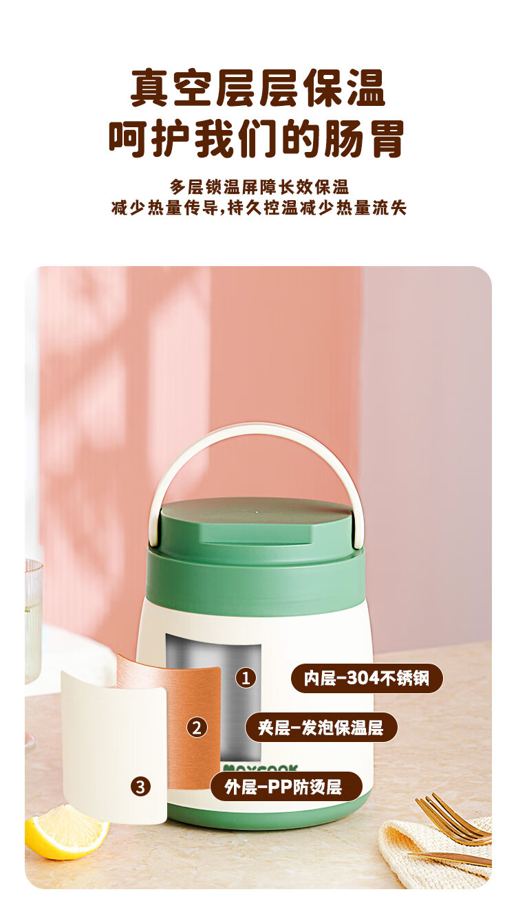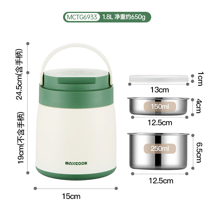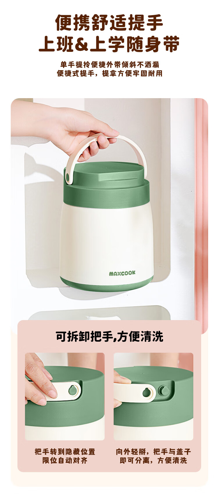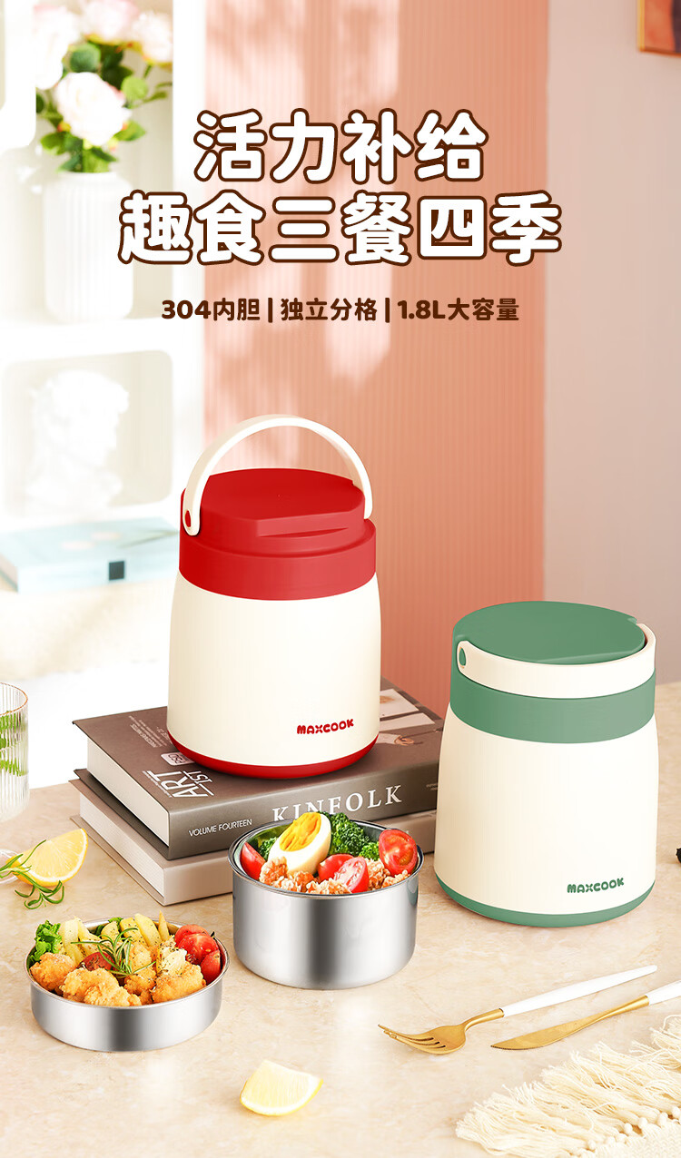Meichu 304 stainless steel insulated lunch box office worker insulated bucket pot student lunch box lunch box large capacity 1.8L (fresh green) MCTG6933