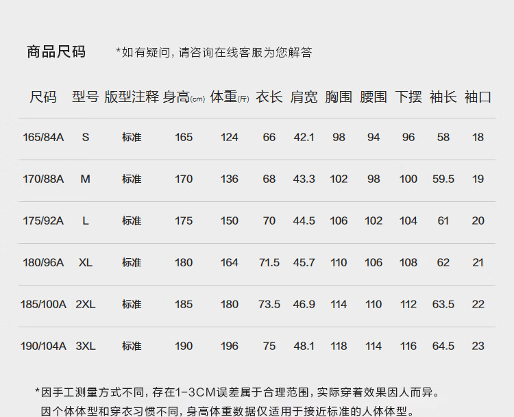 China (cm) 160-165/84-86 165-170 / 88-90 167-172 / 92-96 168-173 / 98-102 170-176 / 106-110