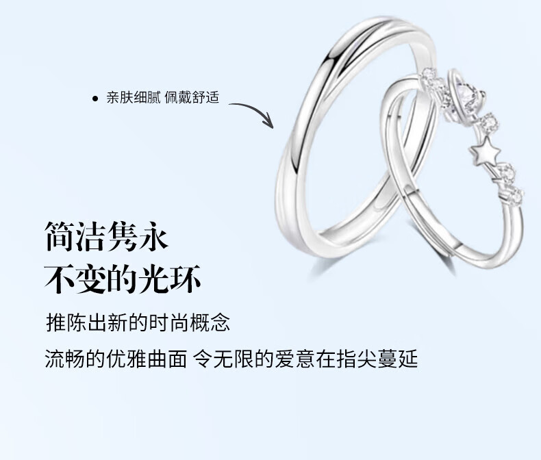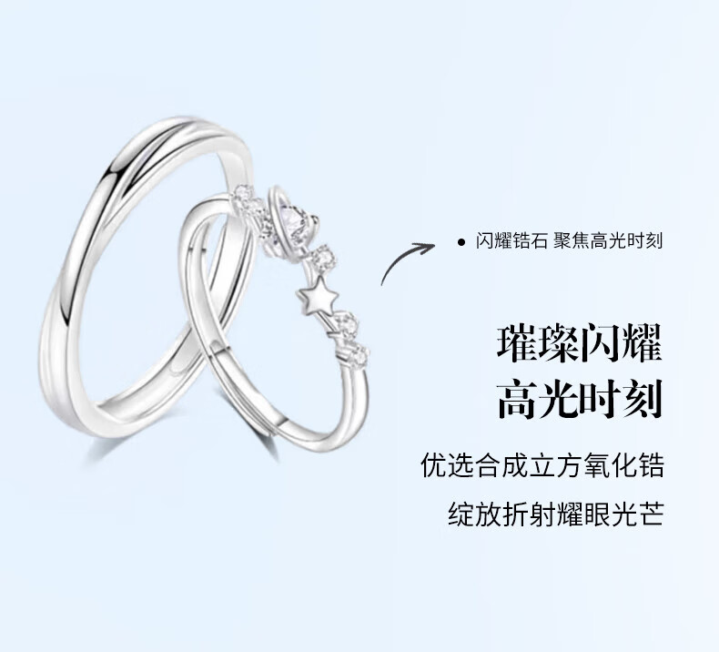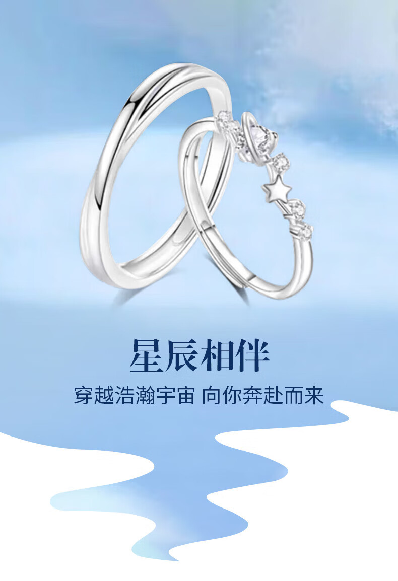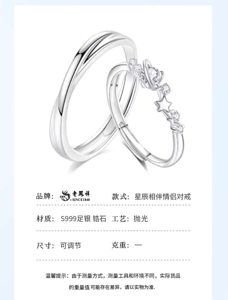 Lao Fengxiang Stars Accompanying Couple Ring S999 Sterling Silver Sweet Fairy Silver Ring Valentine's Day Birthday Gift for Girlfriend Stars Accompanying Couple Ring Brand Gift Box