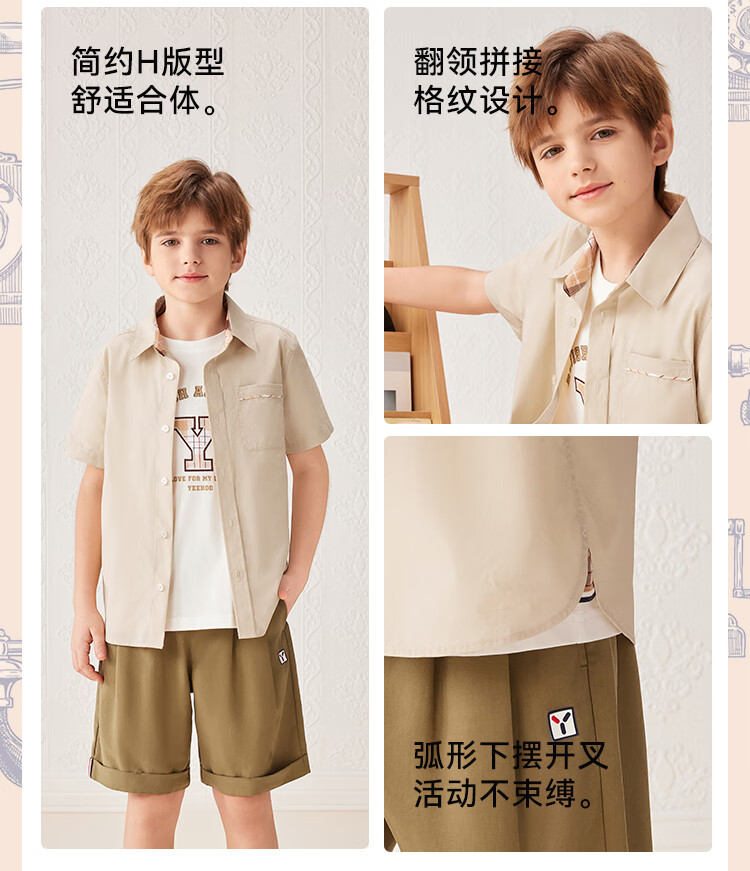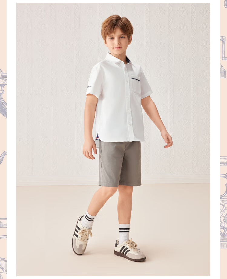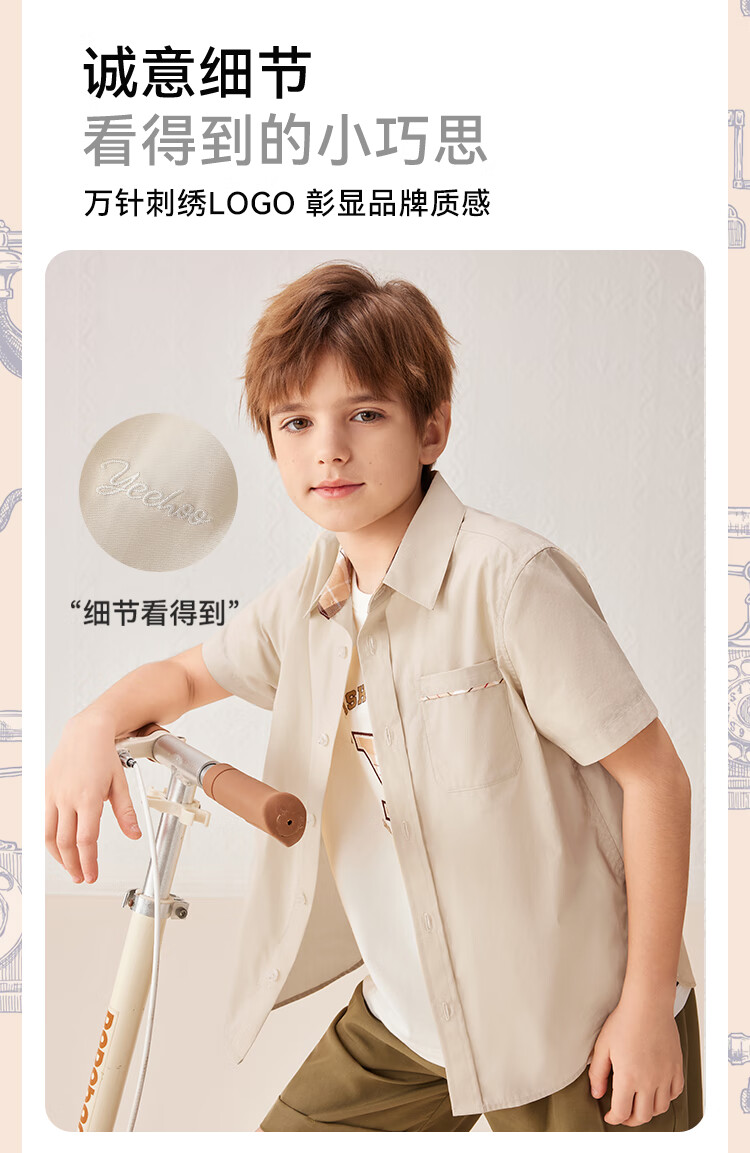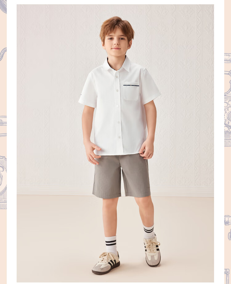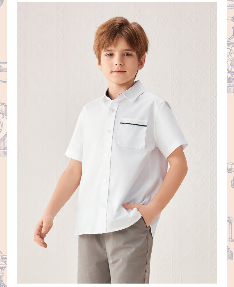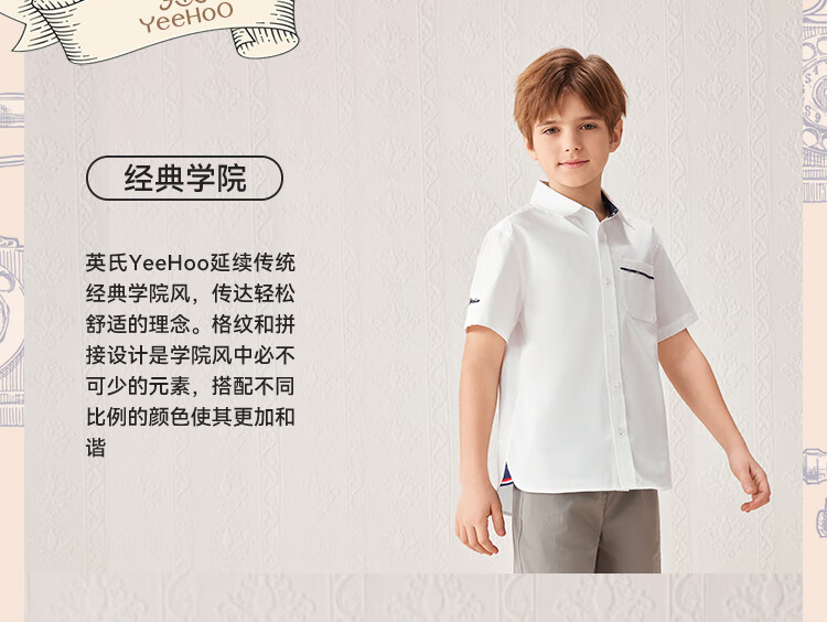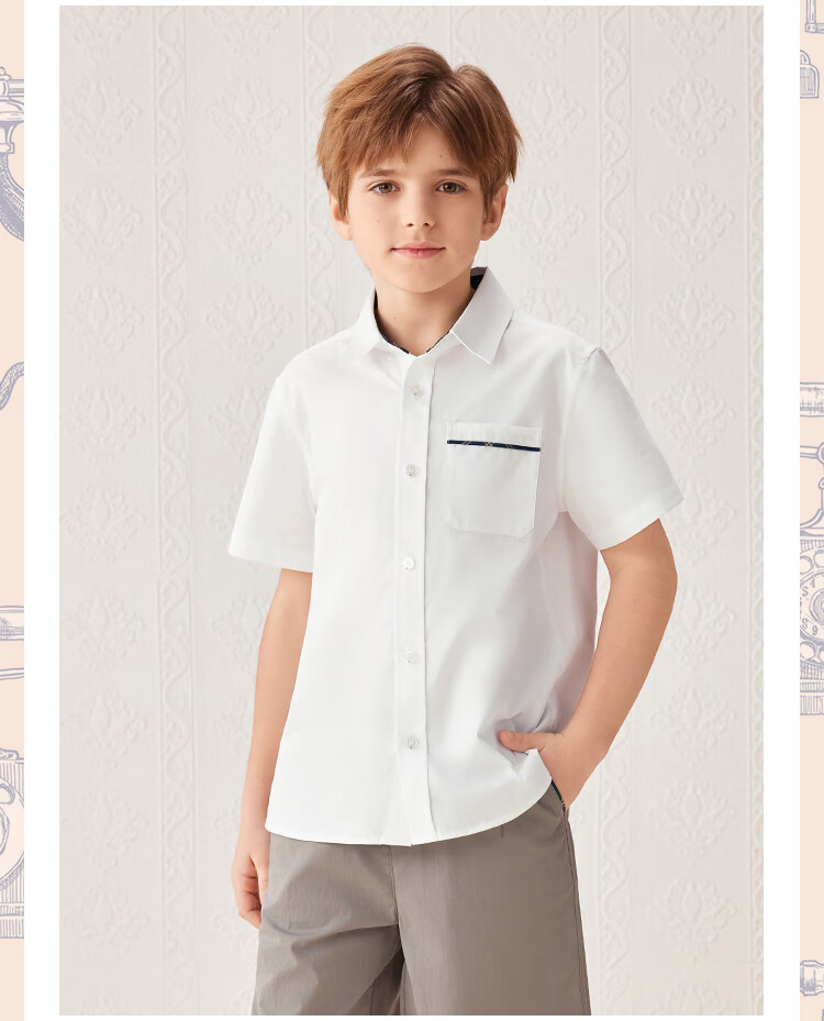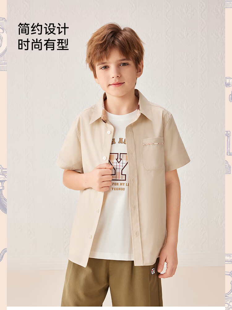 YEEHOO boys' shirts and children's clothes summer casual college style short-sleeved shirts summer new pure cotton medium and large children's clothing badge pocket college white 120