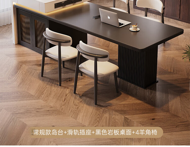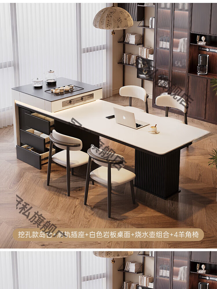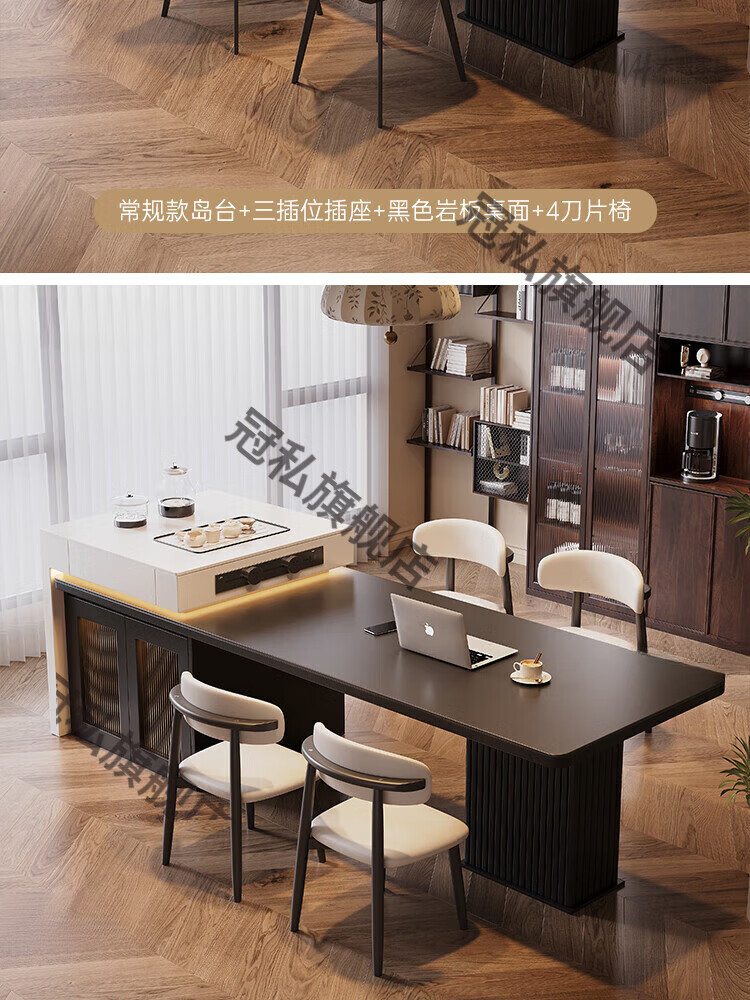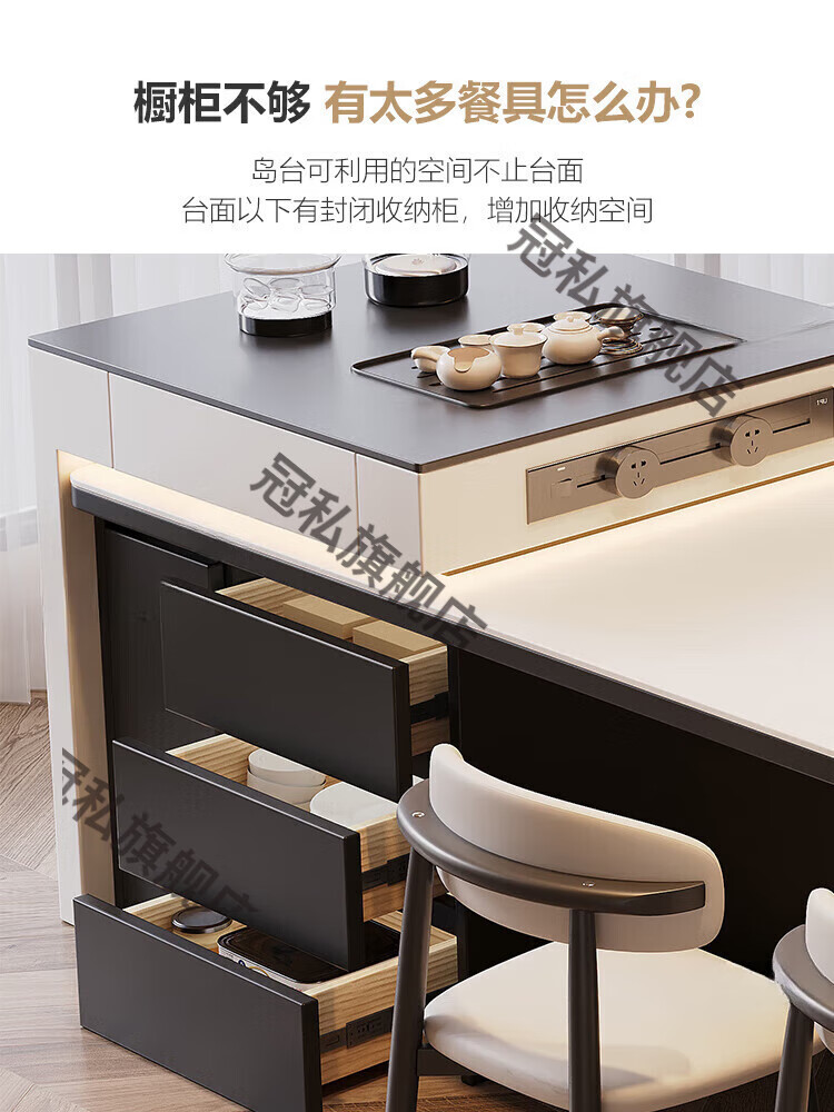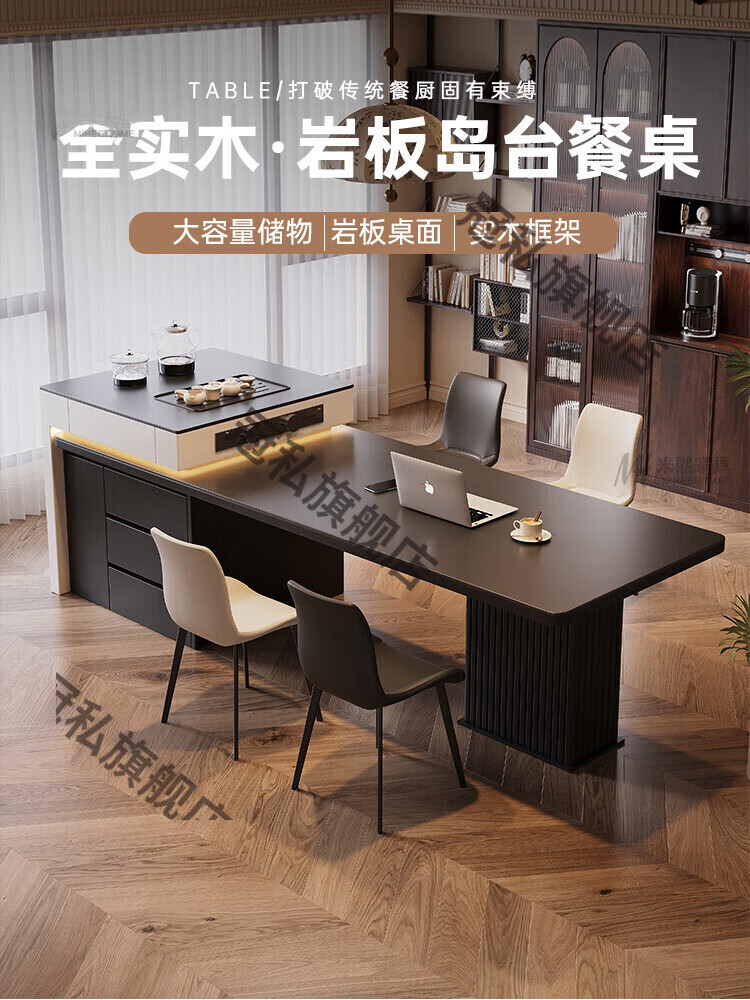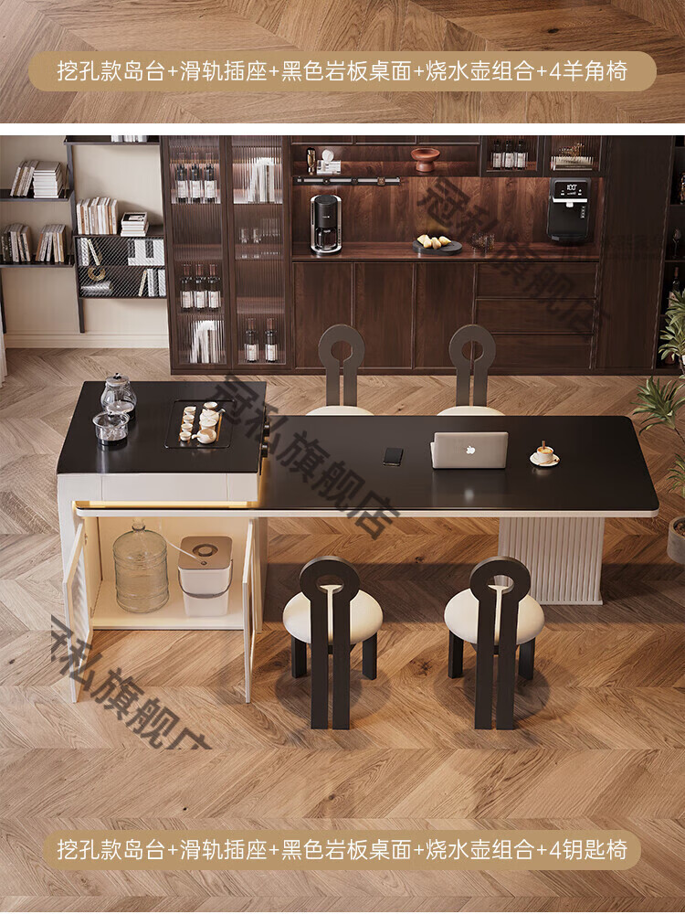 Guansi slate island dining table integrated retractable high-end retro restaurant dining table and chair combination induction cooker all solid wood island dining table slide rail socket + tea stove 6 key chair 160cm x80x76.5cm