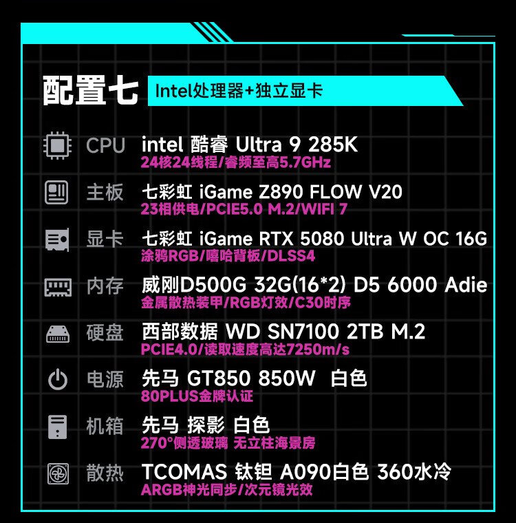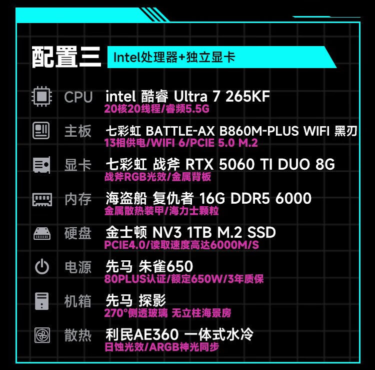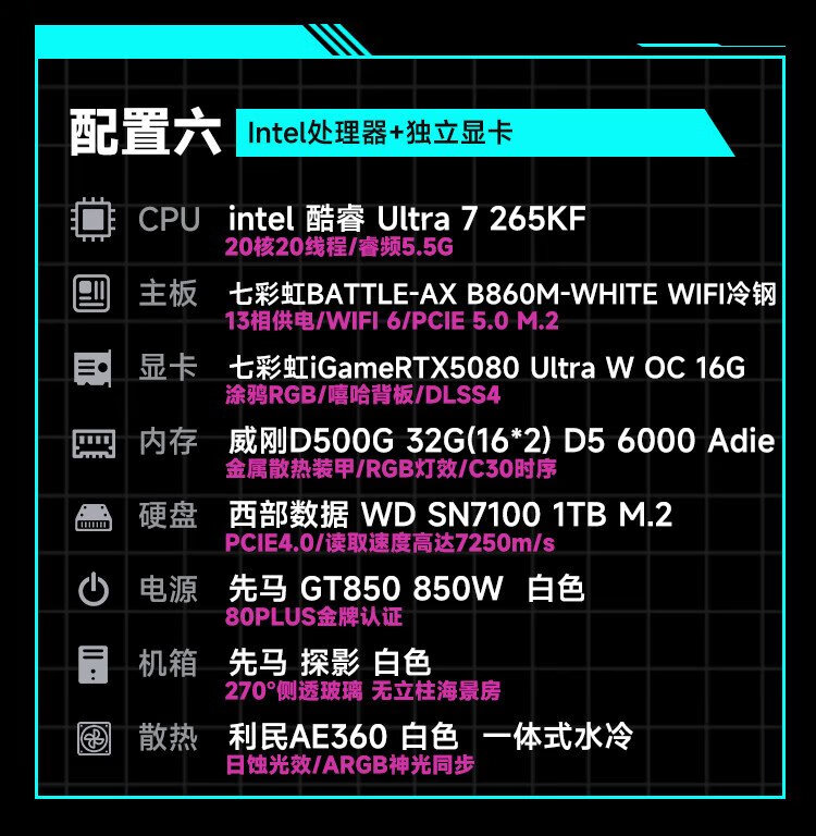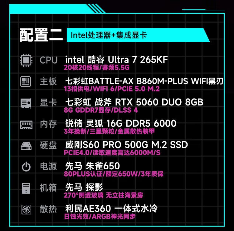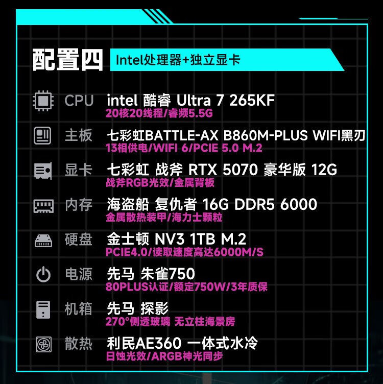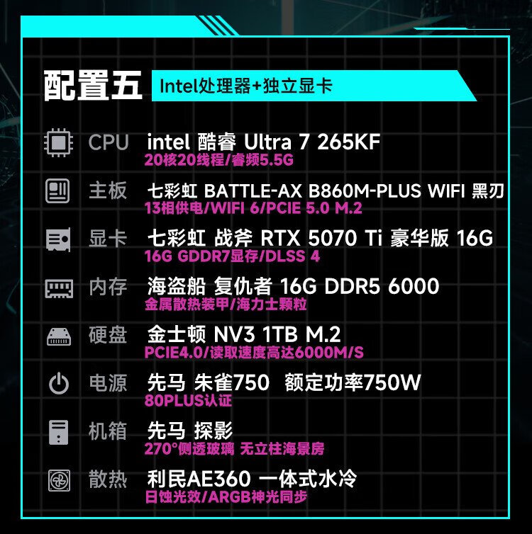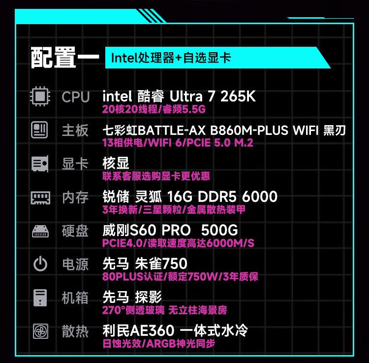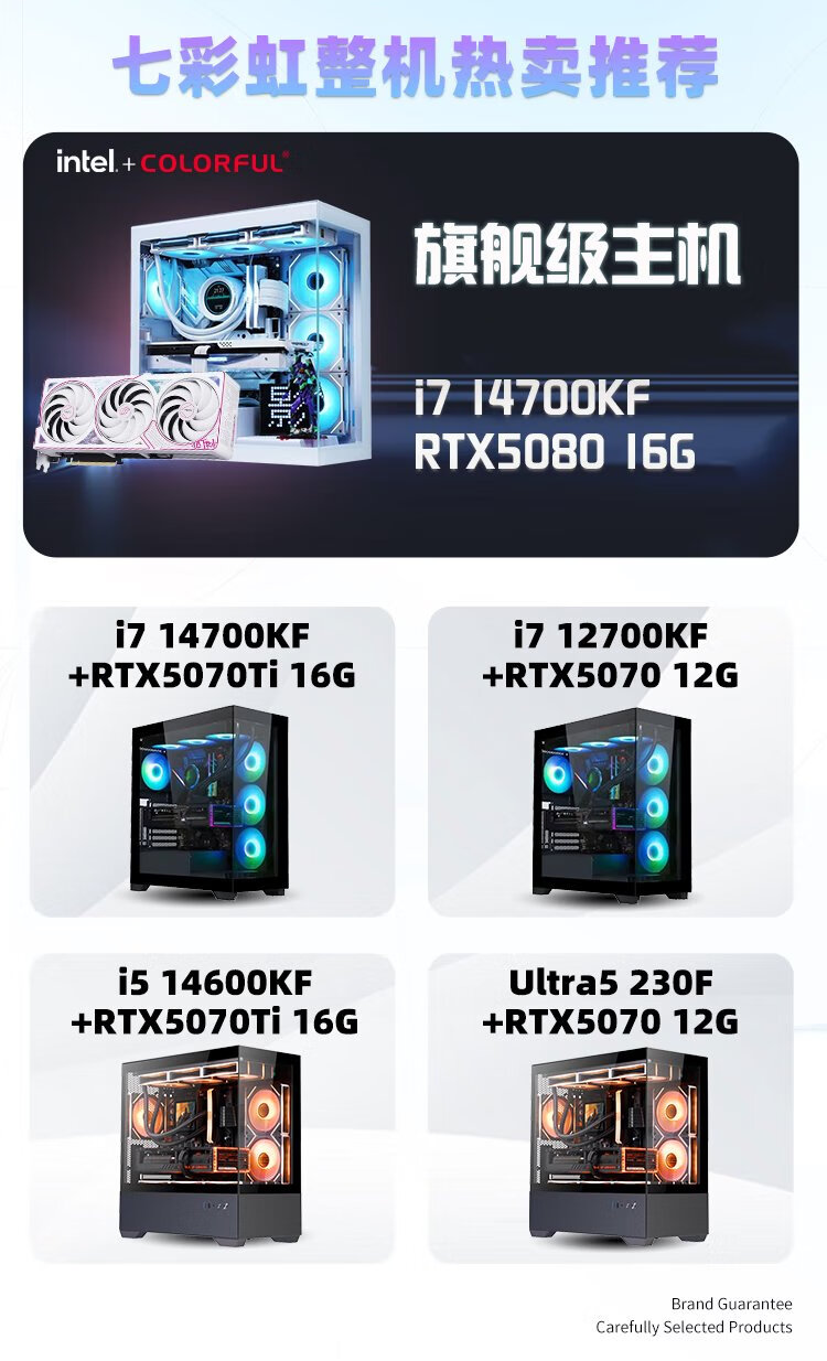 Colorful Intel Core Ultra7 265K/KF host RTX5080/5070Ti/5060Ti rendering design computer e-sports game live broadcast DIY desktop assembly machine configuration 5 265KF/RTX5070Ti/16G