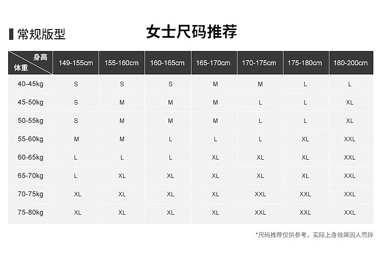 China (cm) 160-165/84-86 165-170 / 88-90 167-172 / 92-96 168-173 / 98-102 170-176 / 106-110