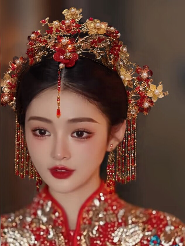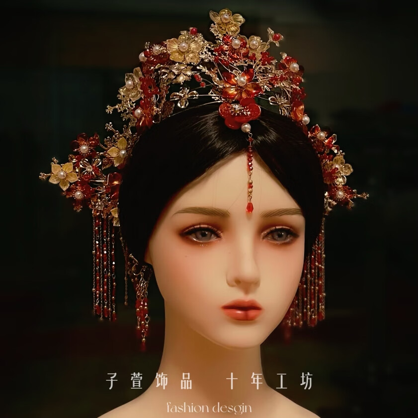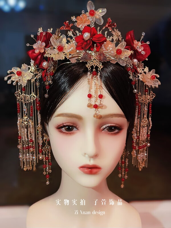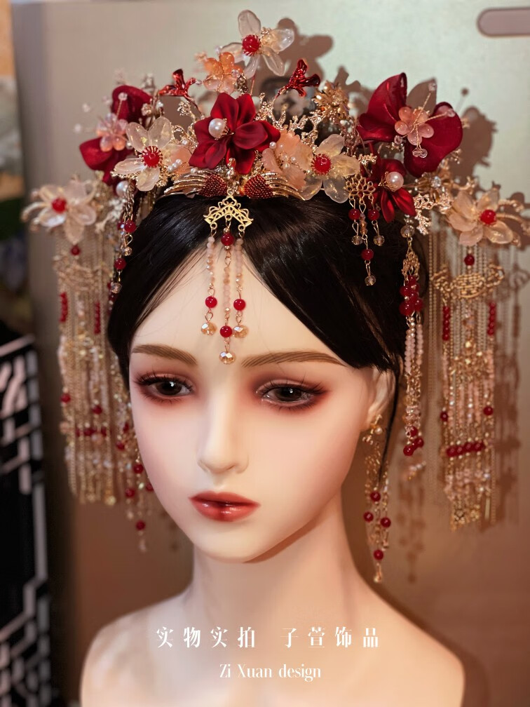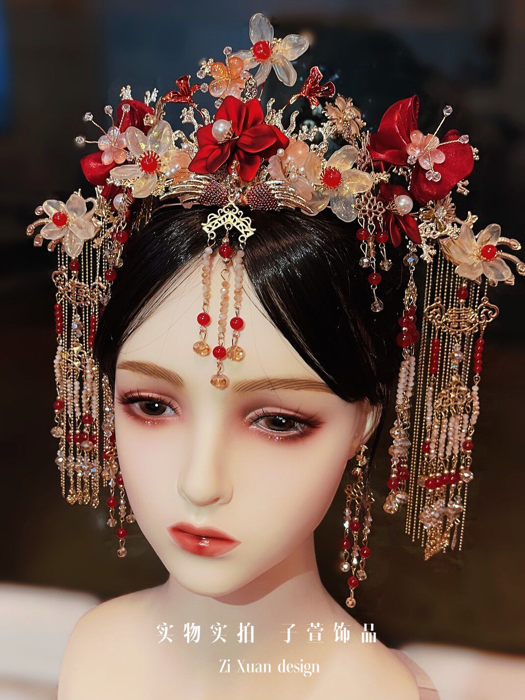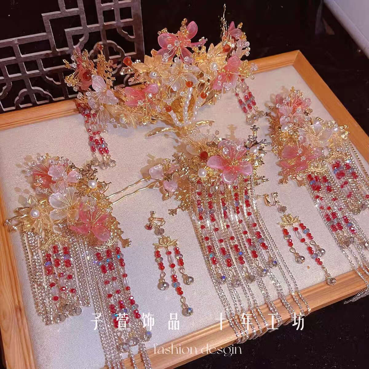 Chishe Xiuhe clothing headdress Chinese style bridal phoenix crown 2025 new red bow glazed hair crown ancient style wedding hair accessories C main crown + back area + hairpin + earrings gift box
