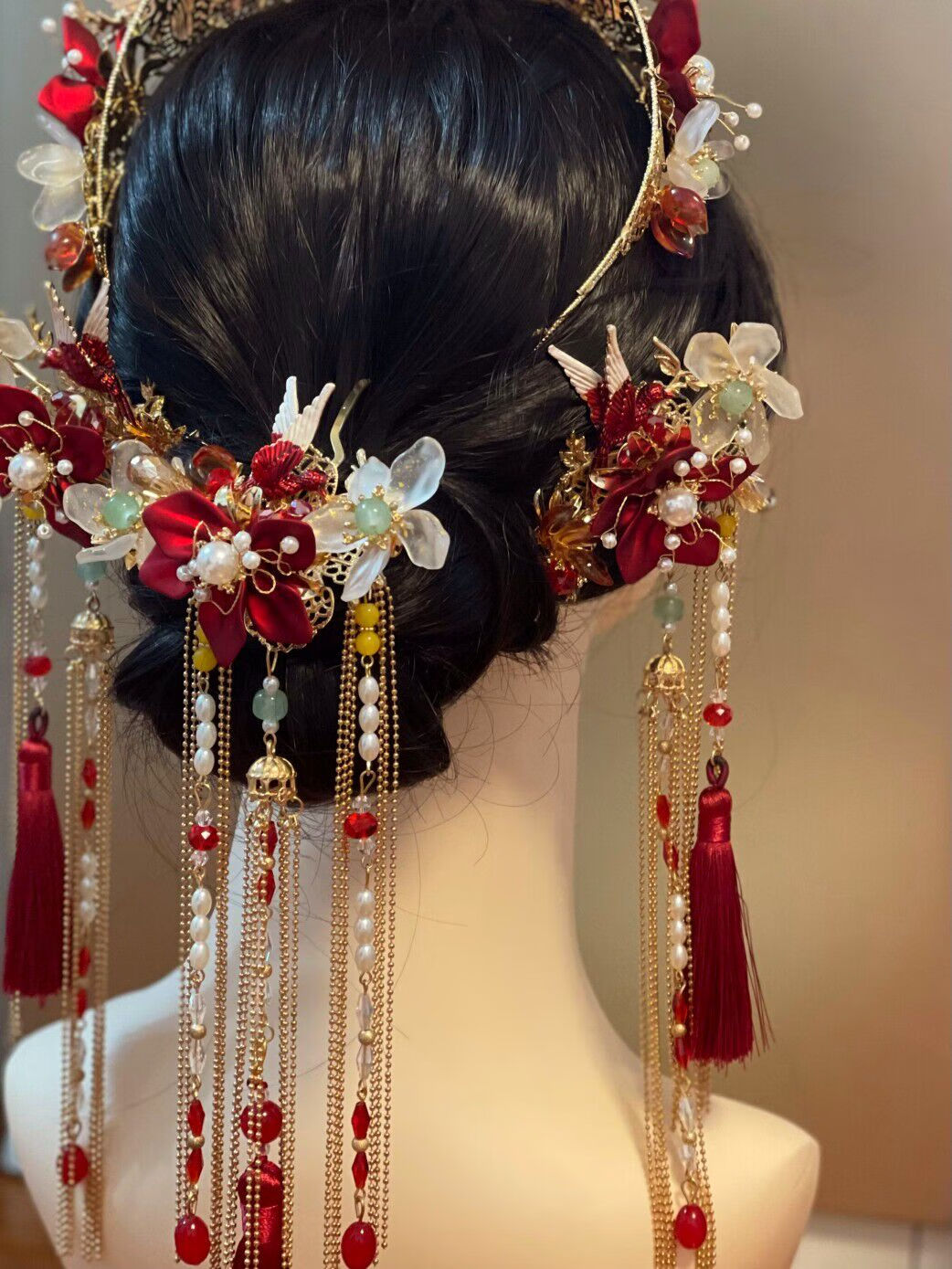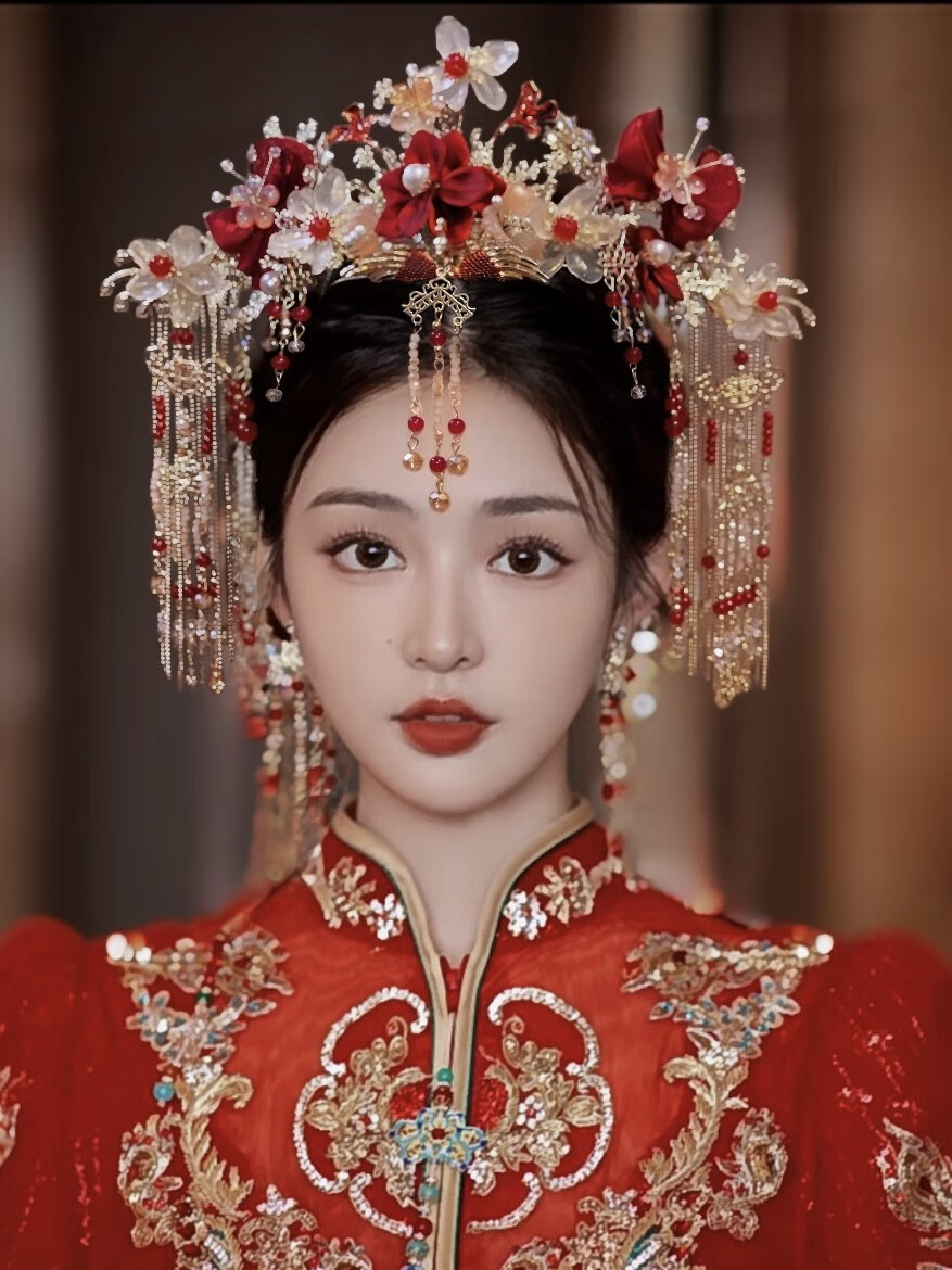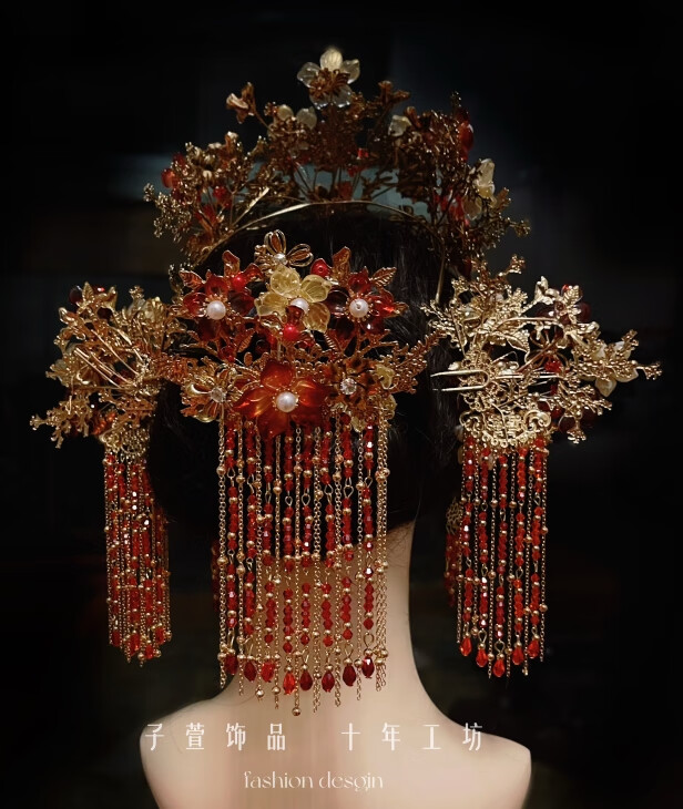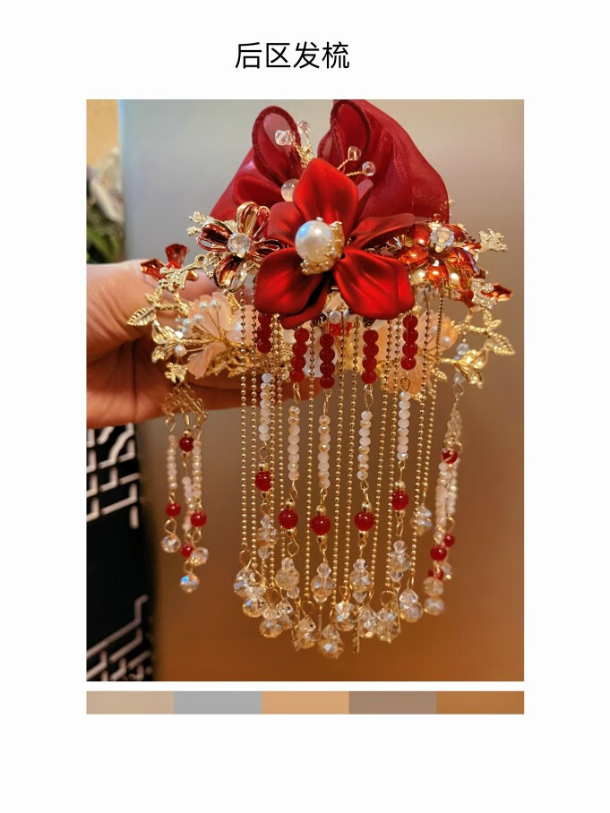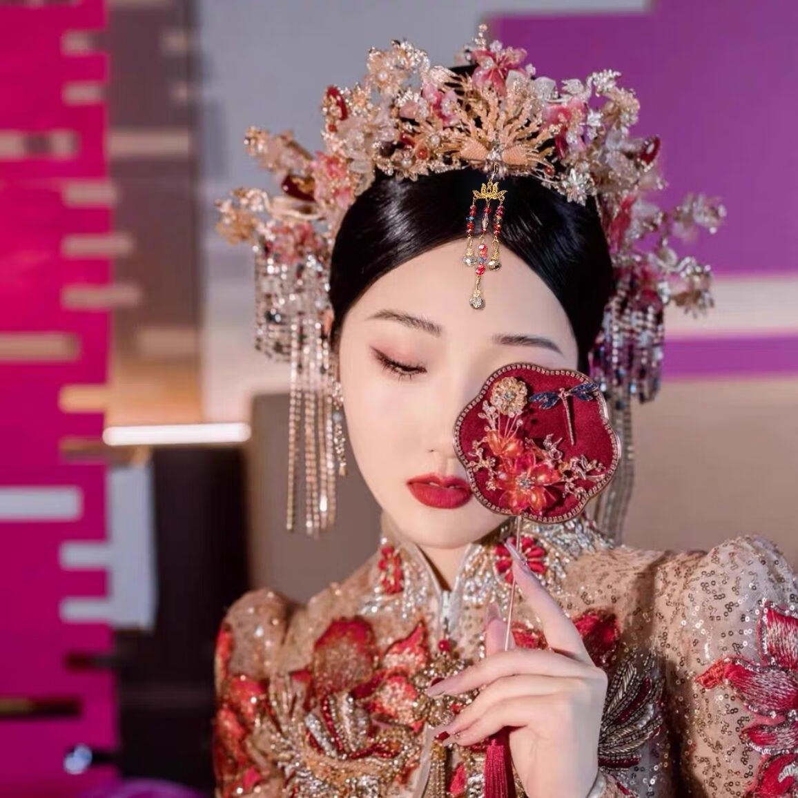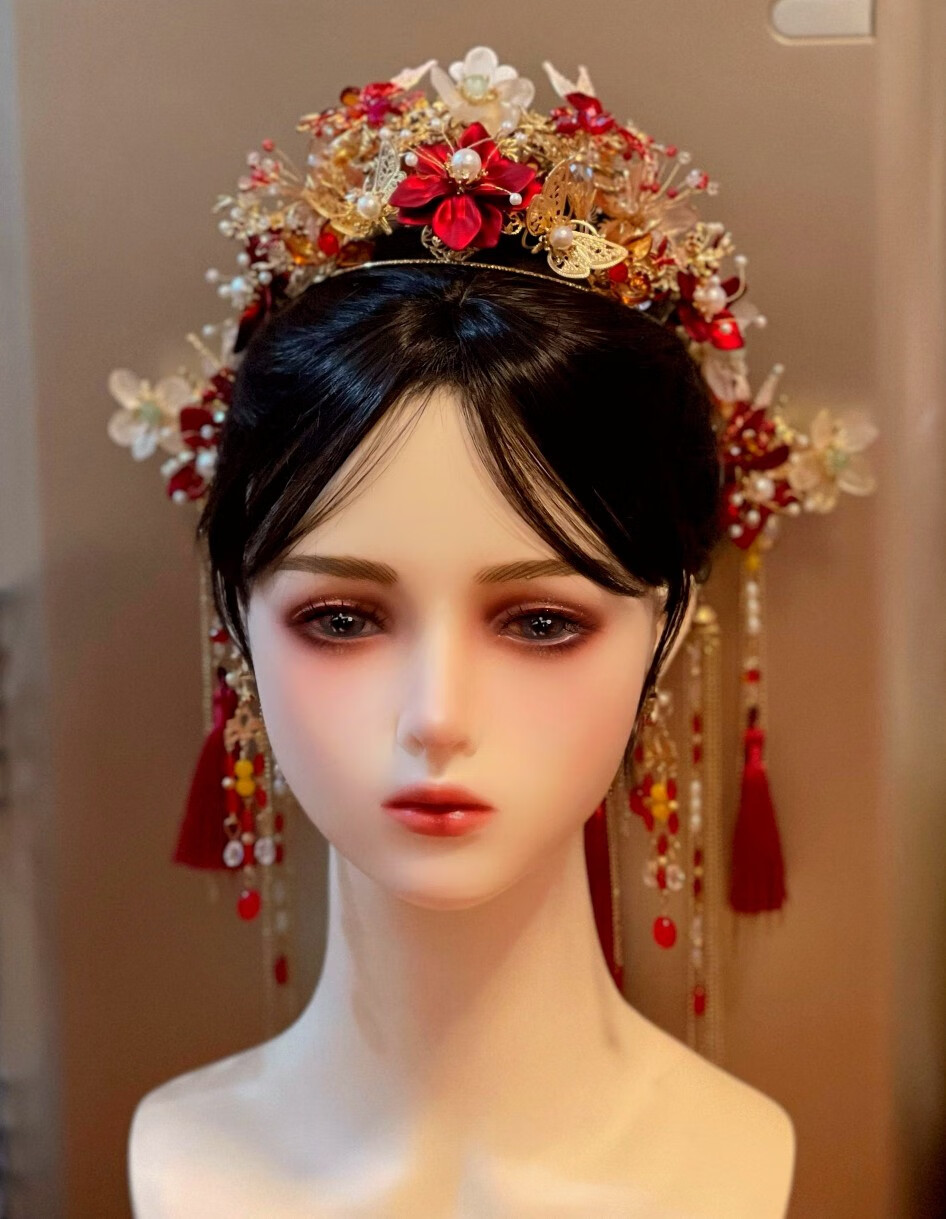 Chishe Xiuhe clothing headdress Chinese style bridal phoenix crown 2025 new red bow glazed hair crown ancient style wedding hair accessories C main crown + back area + hairpin + earrings gift box