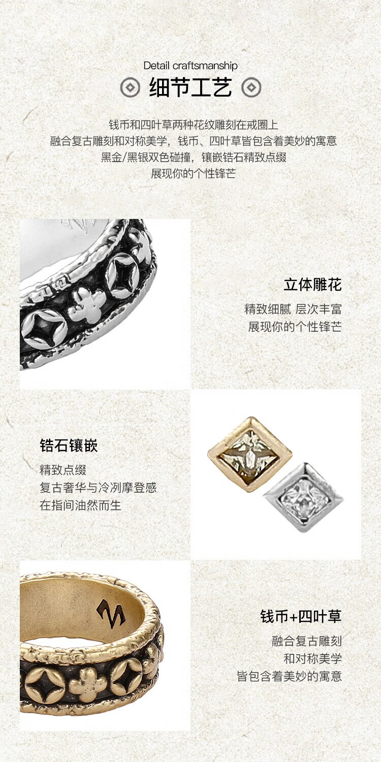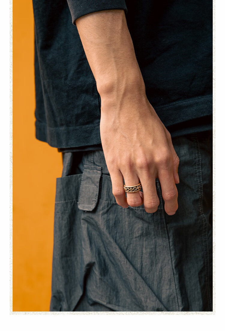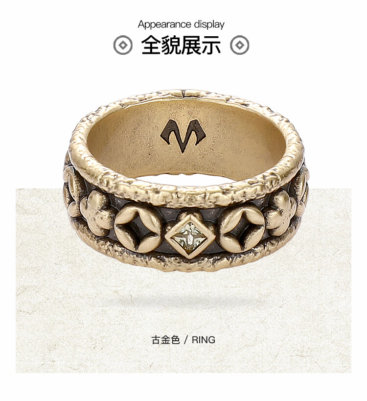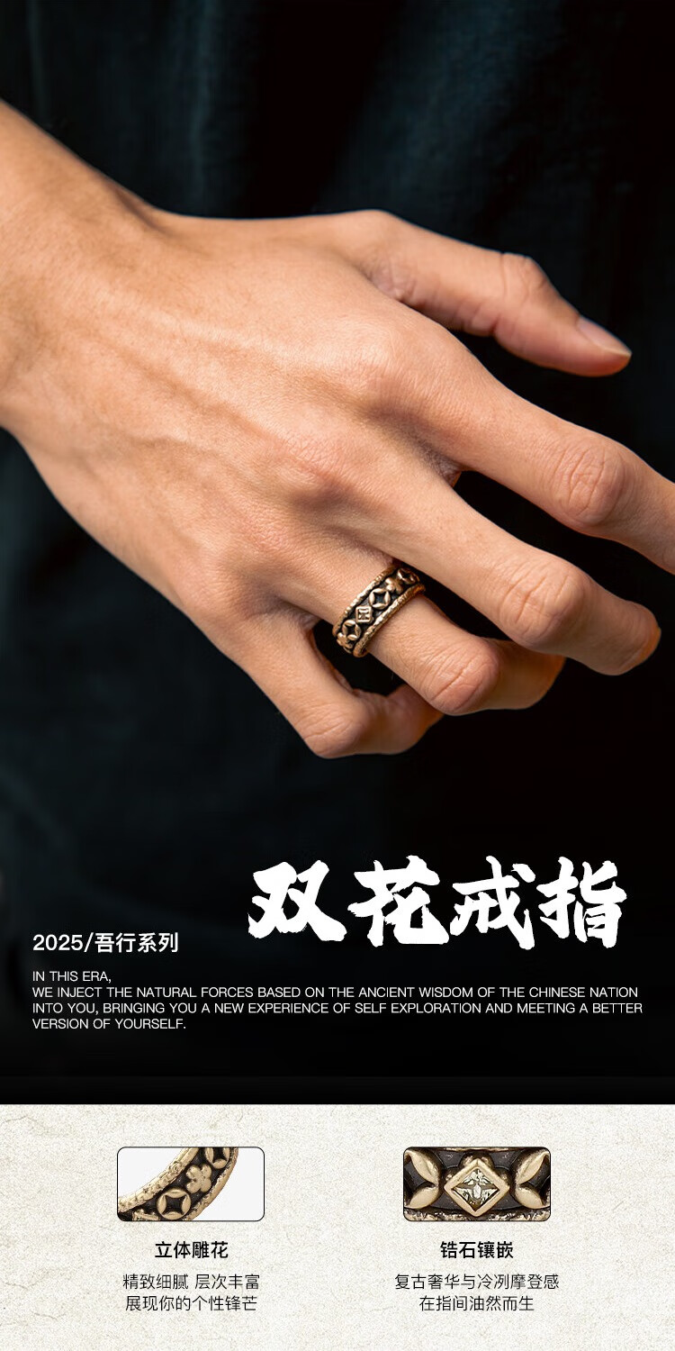 BABAMA Wuxing Series Rich Flower Double Flower Ring Men's Retro Old Copper Plated Platinum Ring Couple's Same Style Birthday Gift Ancient Gold Men's Style 59mm
