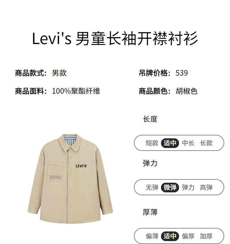 Levi s Levis Children's Boys' Shirt 2026 Spring Comfortable Children's Long-Sleeved Shirt Pepper Color 160/76 Recommended Height 152-158cm