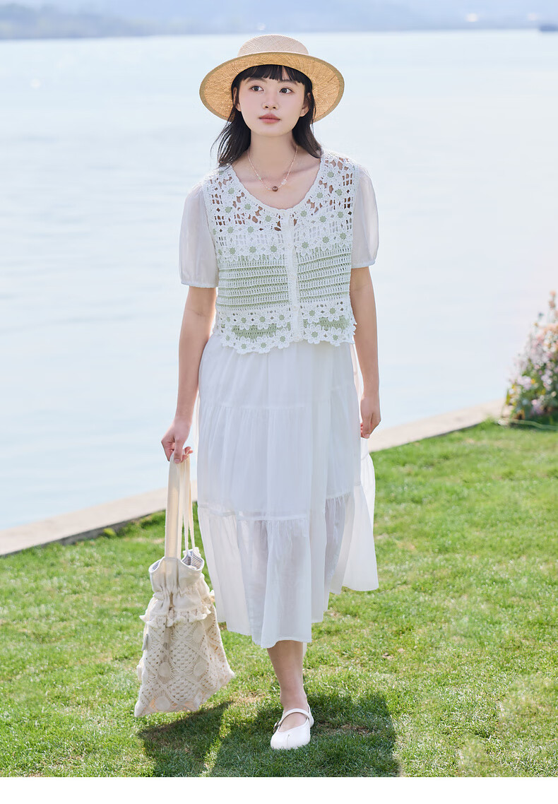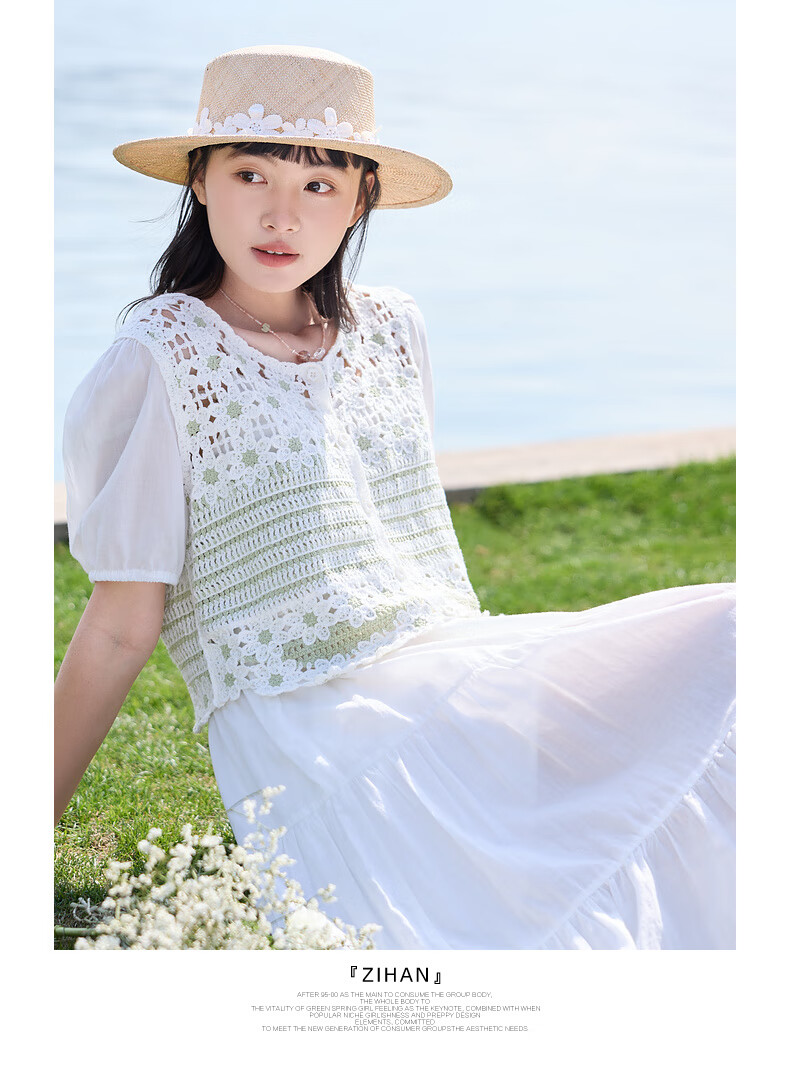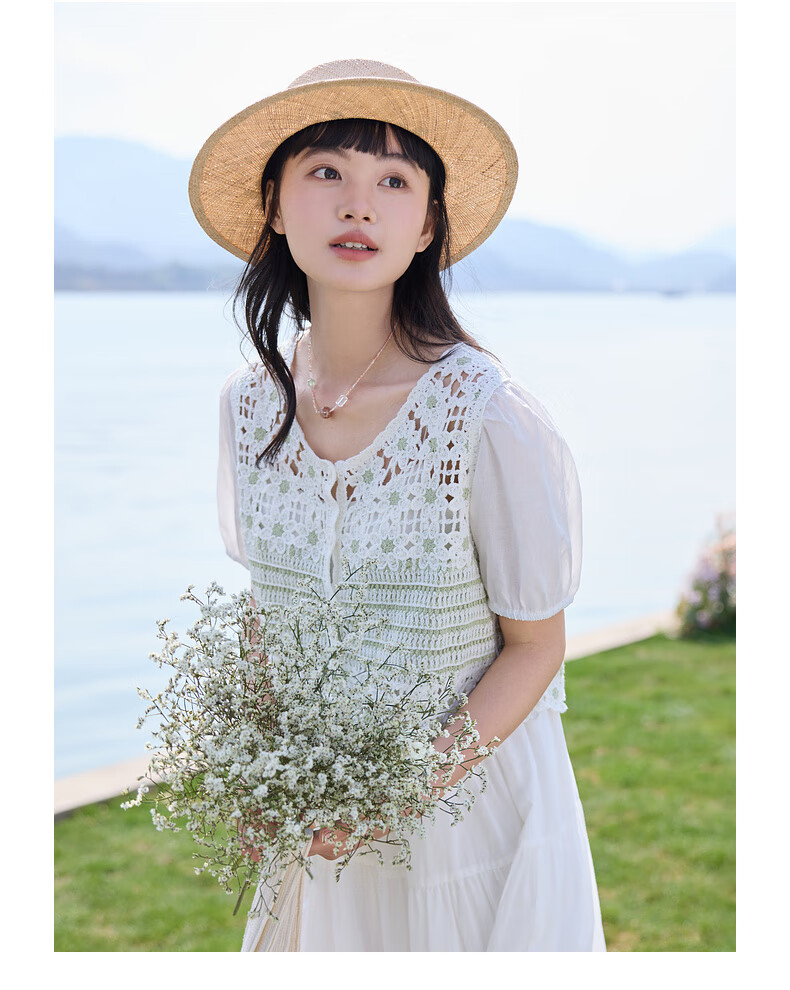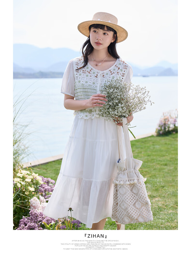 Zihan (ZIHAN) Zihan pastoral style hollow pattern puff sleeve shirt suspender dress two-piece suit for women 2025 summer new style off-white S