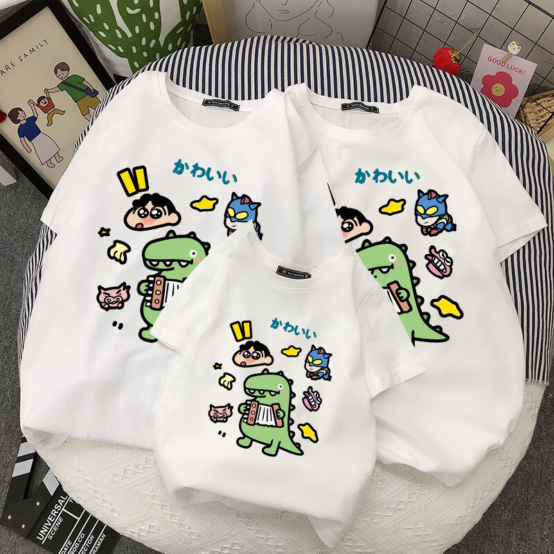 Pure cotton parent-child clothing high-end summer clothing for a family of three and four summer mother-child clothing 2025 new trendy short-sleeved T-shirt white-Dinosaur Crayon Shin-chan 170 (L) Adult
