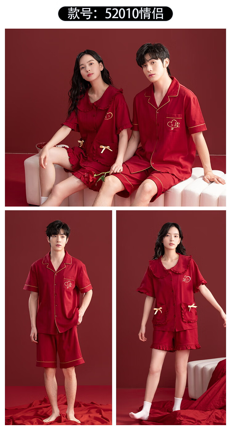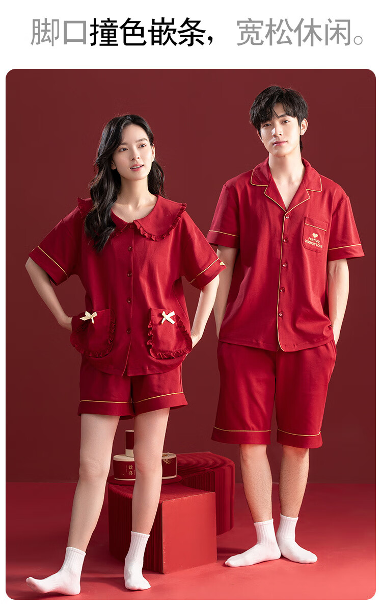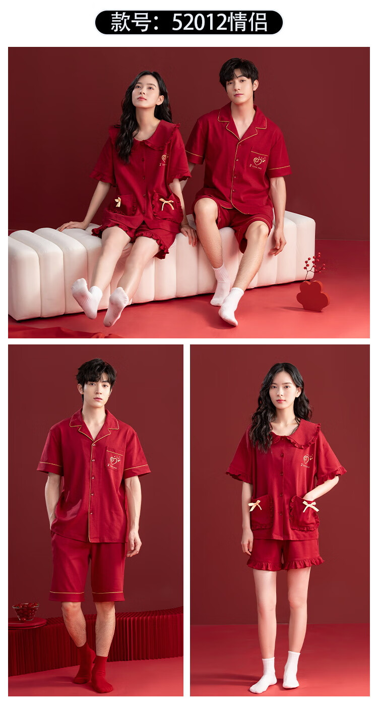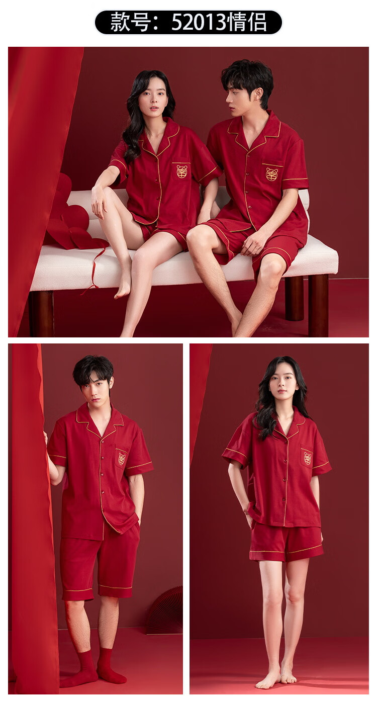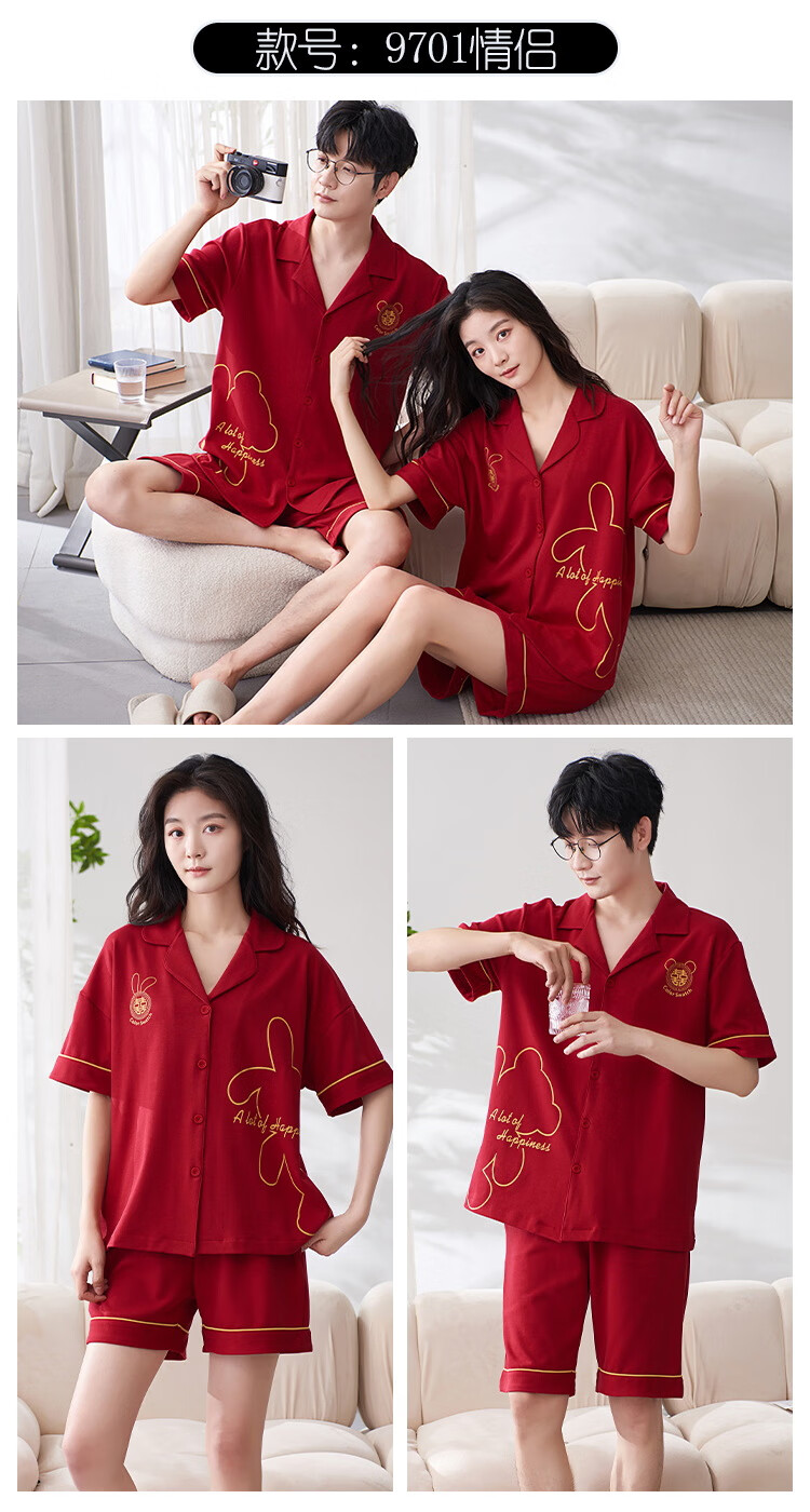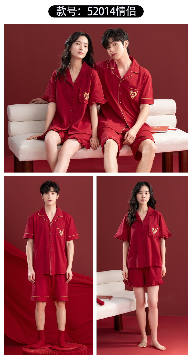 Pure cotton pajamas wedding newlyweds couple set red men's women's short-sleeved summer love couple's pajamas summer Z52012 couple XL male