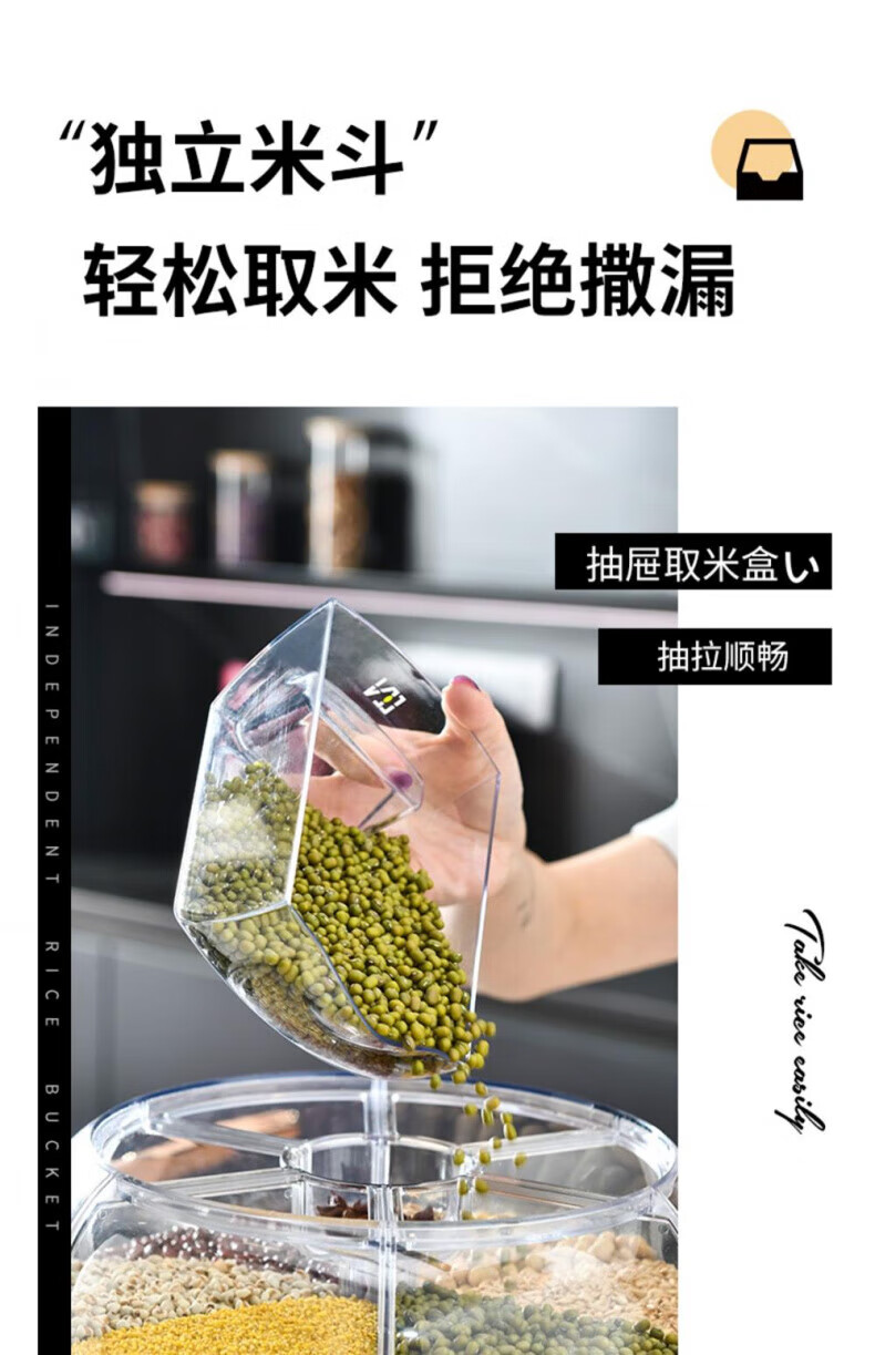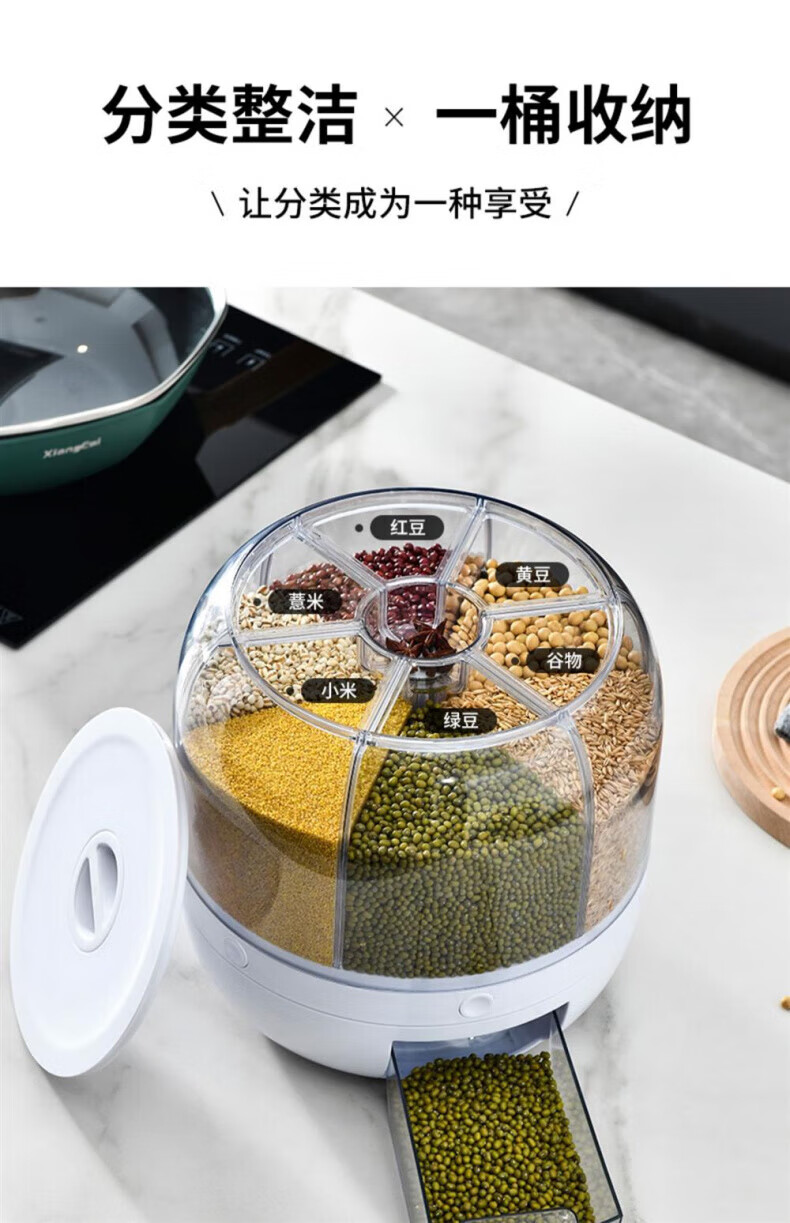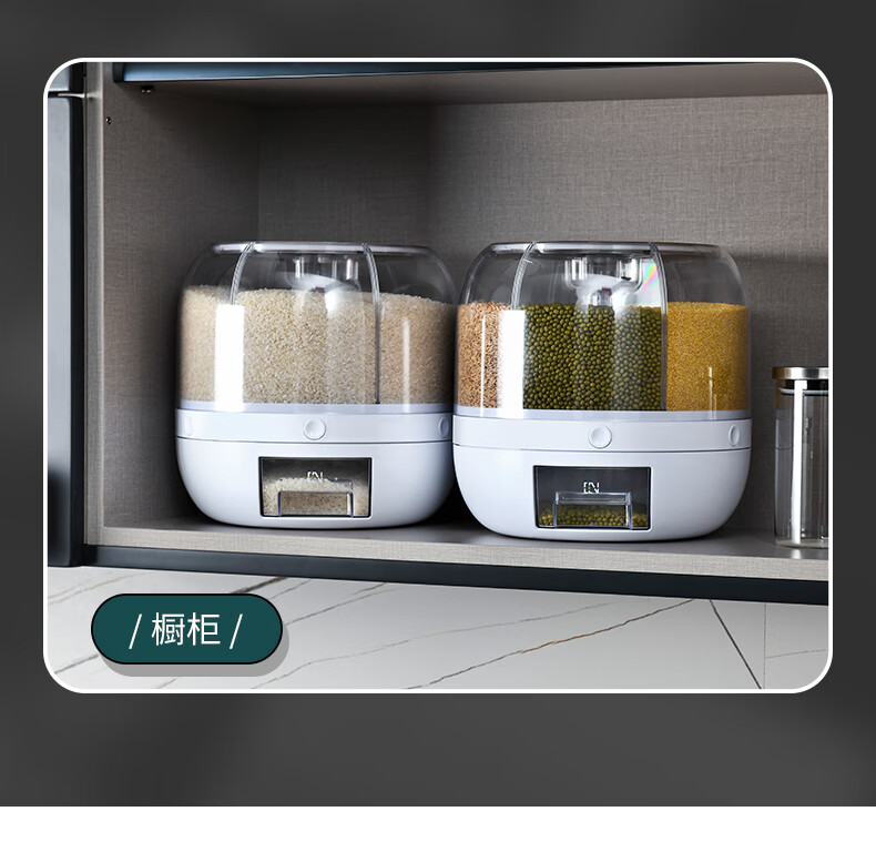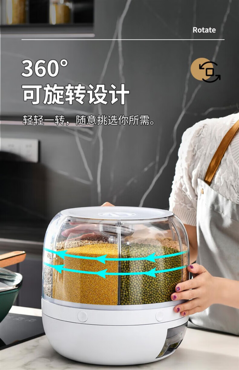 JCZS German brand grain storage box, rice bucket, insect-proof and moisture-proof, sealed, rotating and separated rice cylinder storage tank, 20Jin Jin is equal to 0.5kg, crescent white, six-part grid, rotating storage, one-click open