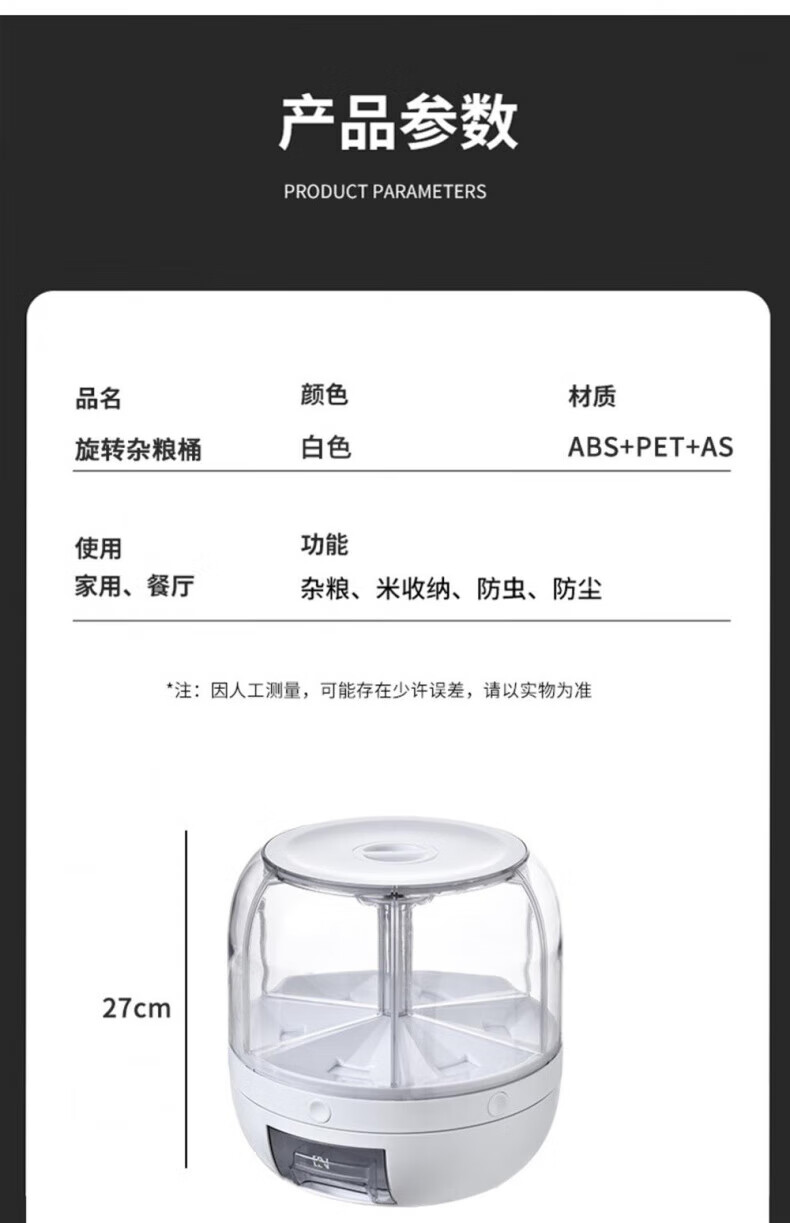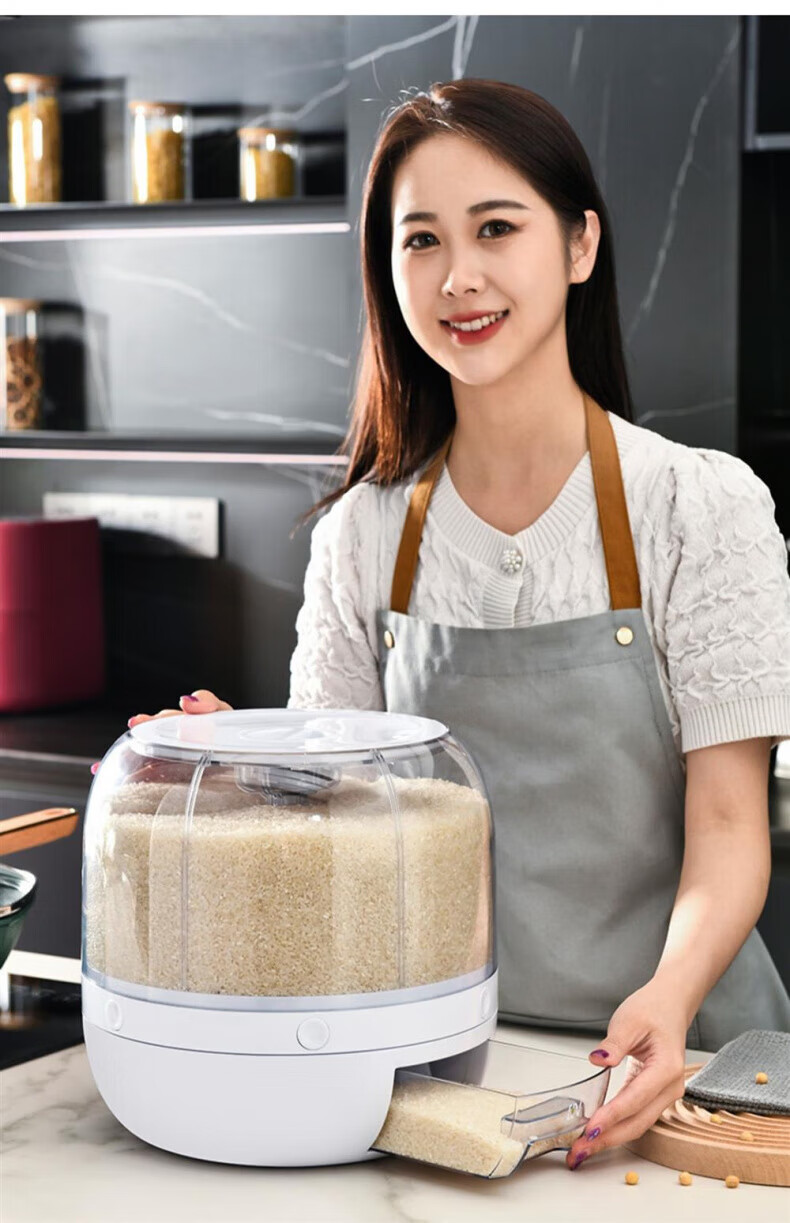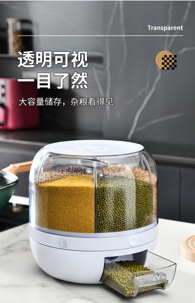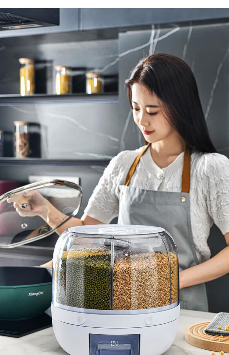 JCZS German brand grain storage box, rice bucket, insect-proof and moisture-proof, sealed, rotating and separated rice cylinder storage tank, 20Jin Jin is equal to 0.5kg, crescent white, six-part grid, rotating storage, one-click open