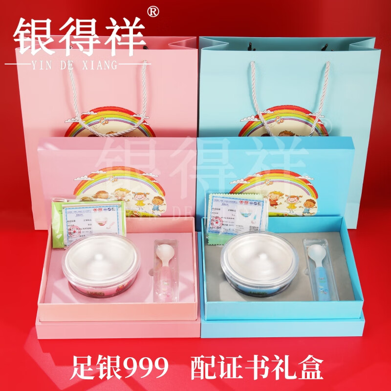 Yin De Xiang Zui Yin 999 Bowl, Chopsticks and Spoon Set Children's Silver Bowl and Chopsticks Three-piece Set Newborn Baby One-month-old Birthday Gift Blue (Bowl + Spoon + Chopsticks) Silver Approximately 88 Grams