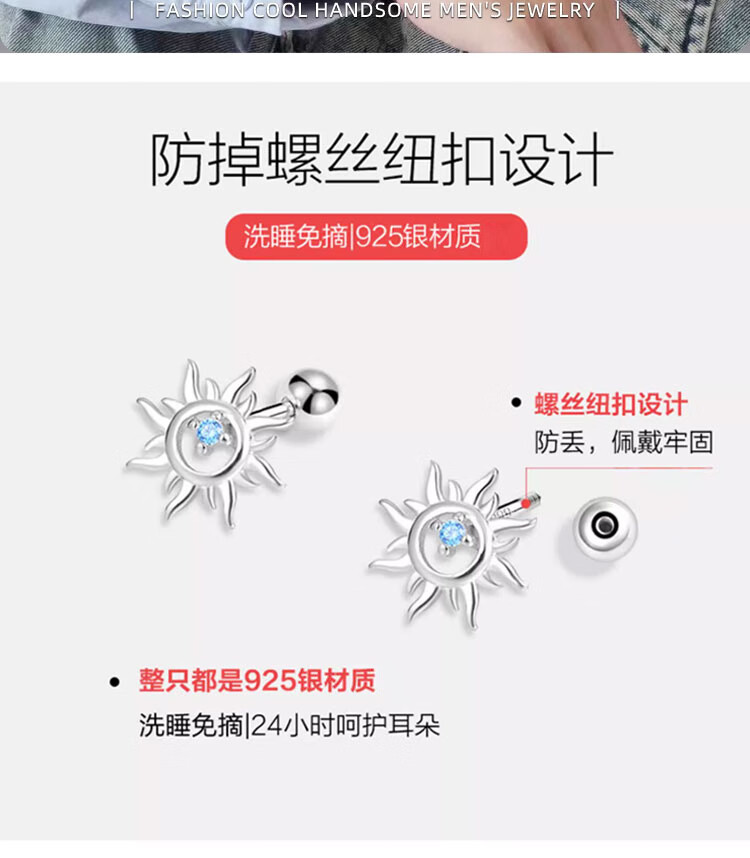 BJYLS925 sterling silver earrings men's sun unique screw design ear piercing earrings boys American ear bone earrings women S925 silver sun earrings - single