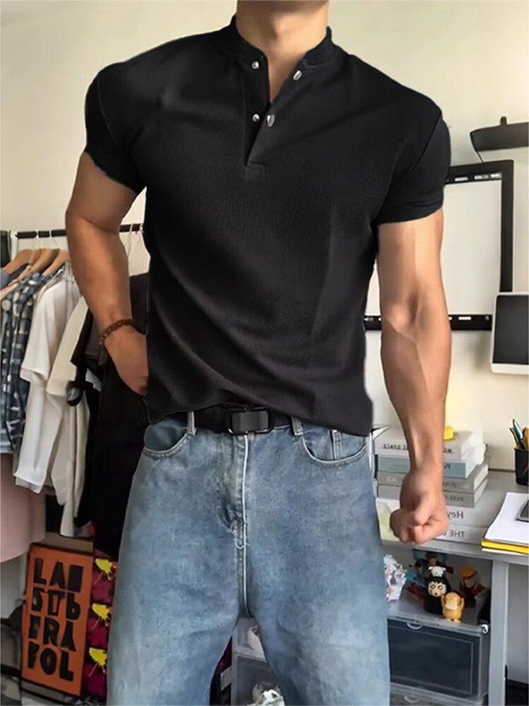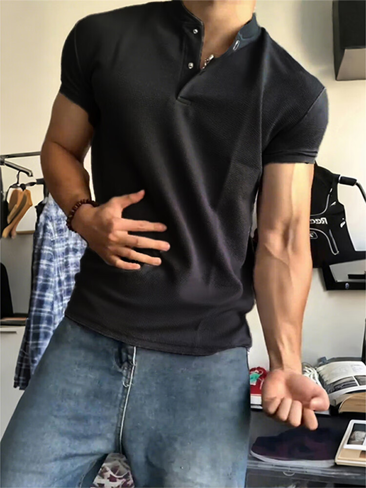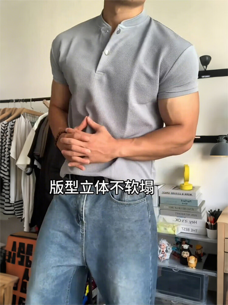 Shantou Lincun black Henry collar POLO shirt short-sleeved men's summer American sports fitness right shoulder T-shirt showing muscles three-quarter sleeves black upgraded style M (suitable) 100-115Jin Jin equals 0.5 kg