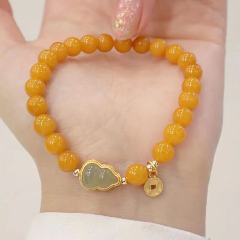 Fat Donglai's same style beeswax bracelet, beeswax bracelet, female old honey chicken oil yellow Hetian jade gourd, Hetian jade Fulu bracelet 8mm single circle bracelet
