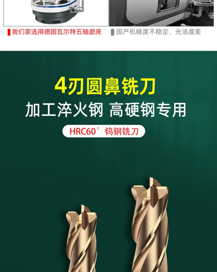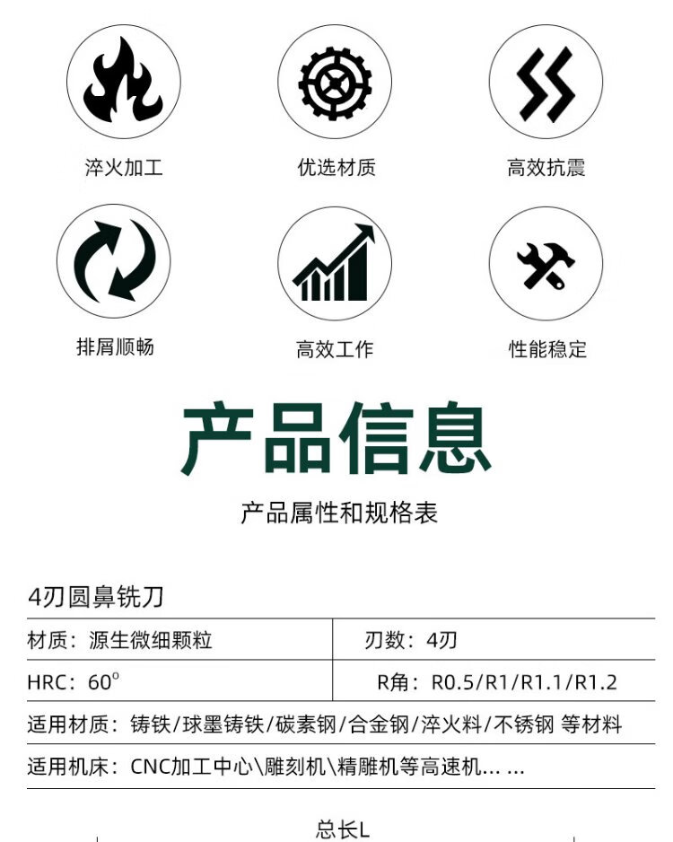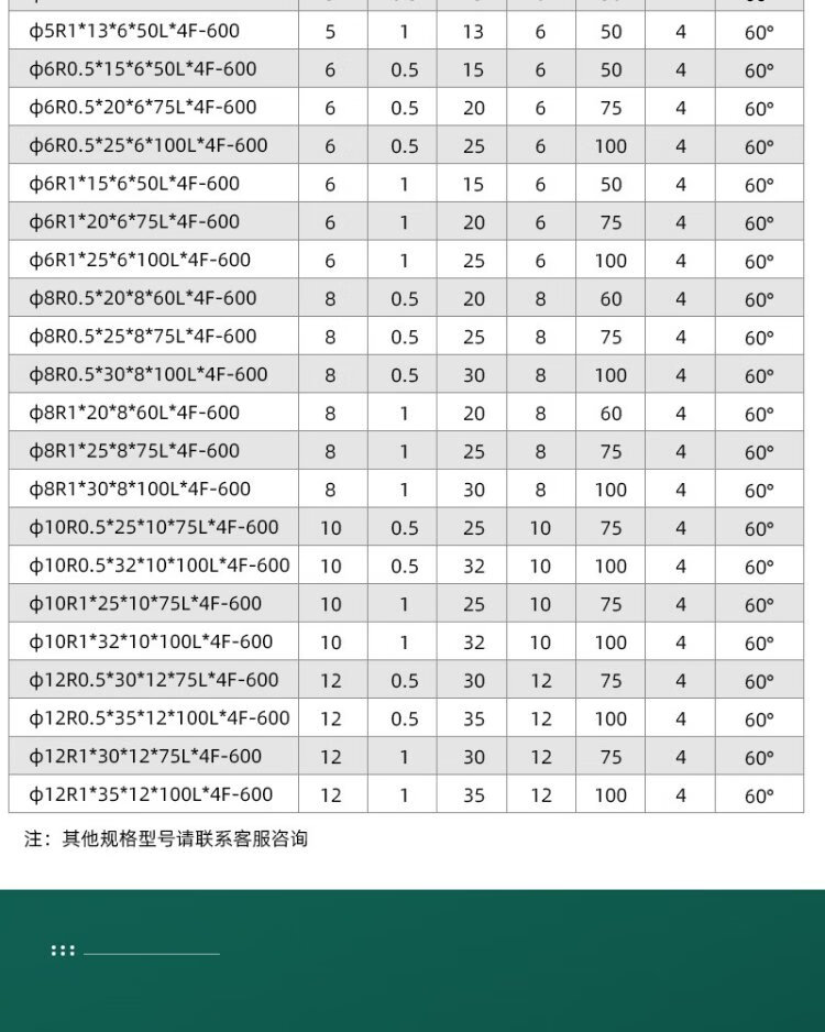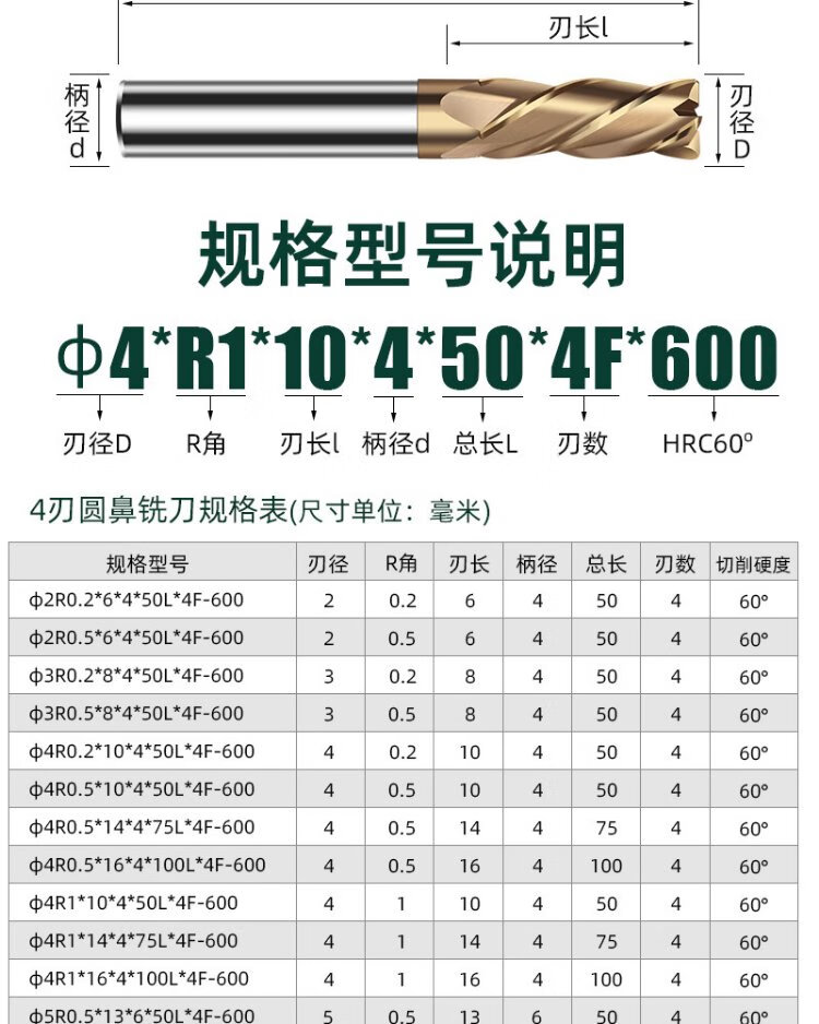 60 degree tungsten steel round nose milling cutter R angle carbide extended 75L100L steel bull nose cutter 10R0.2 R0.5 R1 6R0.5*15*6*50*4F*60S