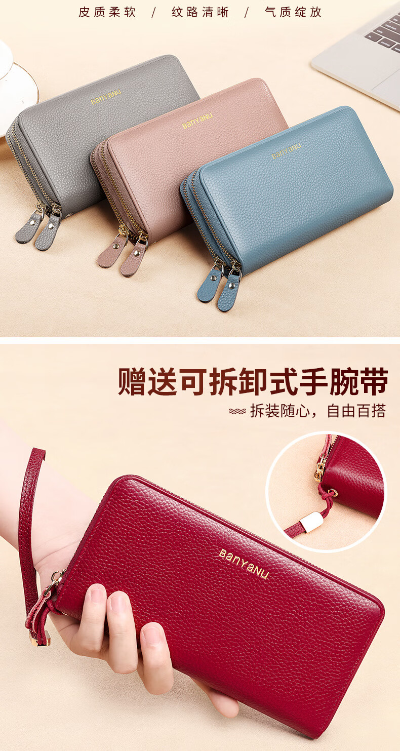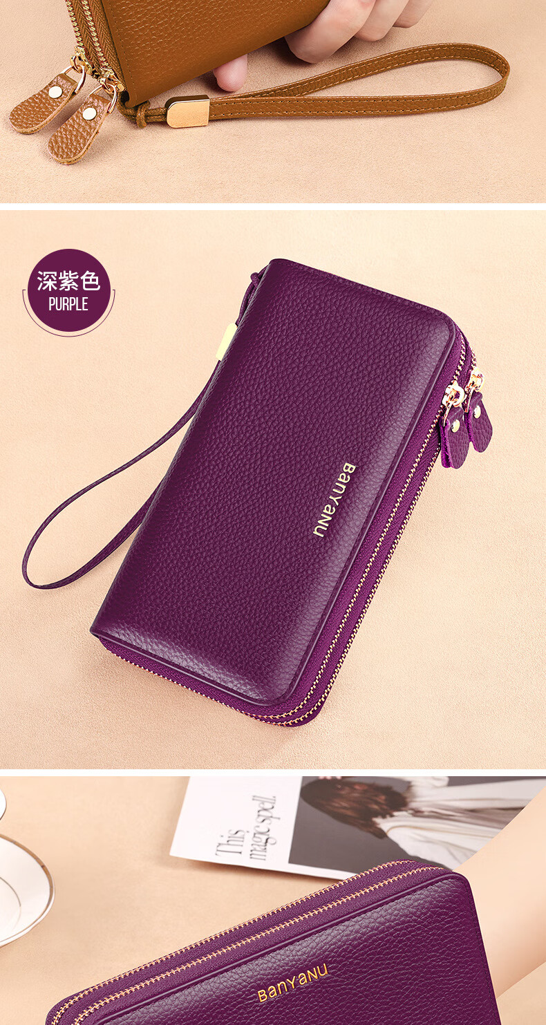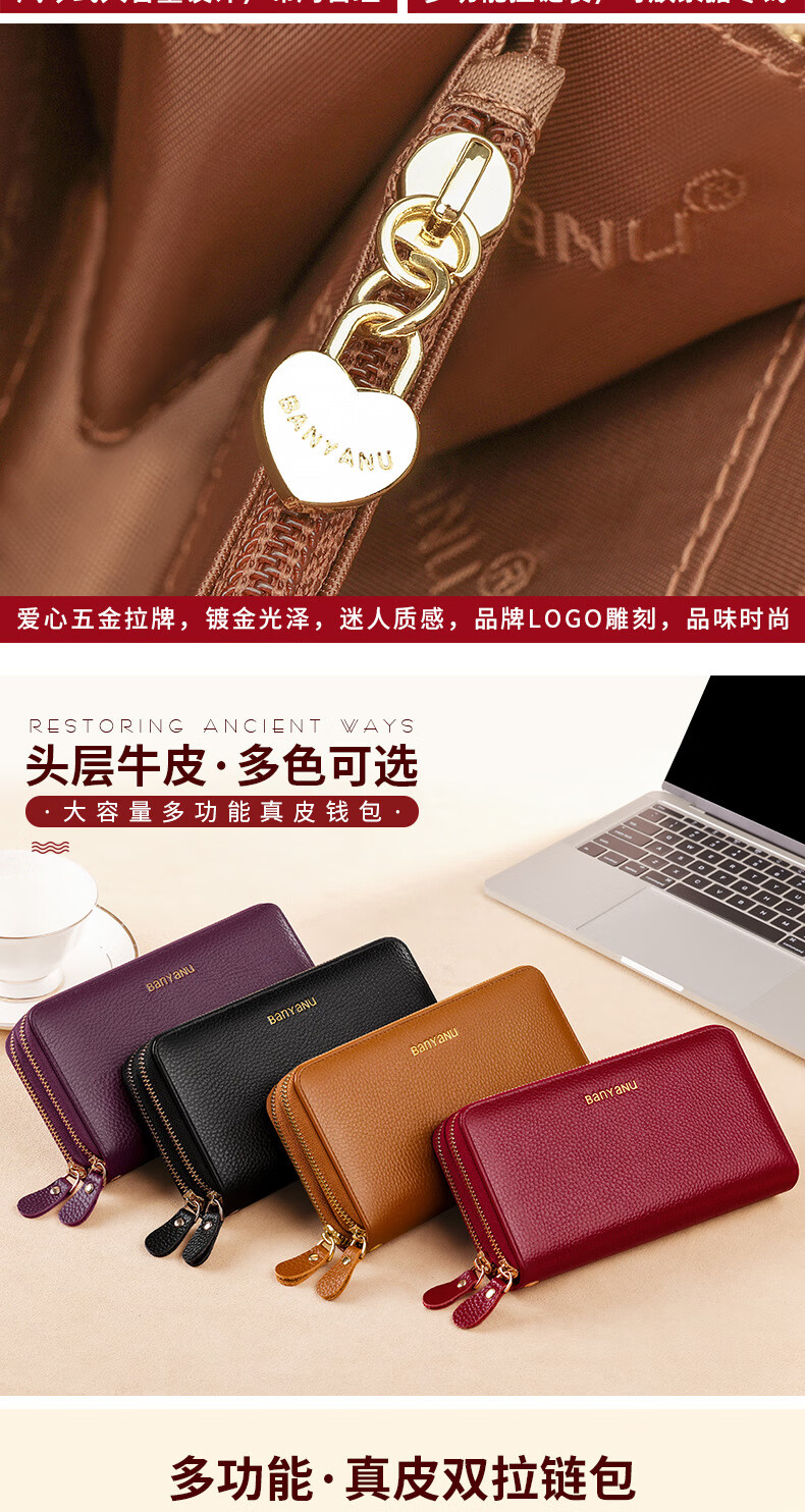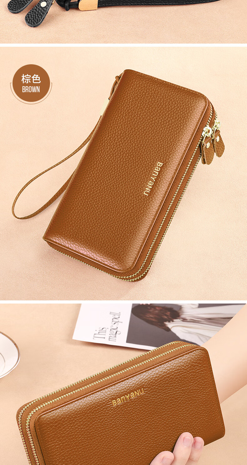 Banyanu Wallet Women's Long Style 2025 New Fashion Large Capacity First Layer Cowhide Wallet Double Zipper Genuine Leather Clutch Brown (First Layer Cowhide) Anti-Theft Brush No Specifications