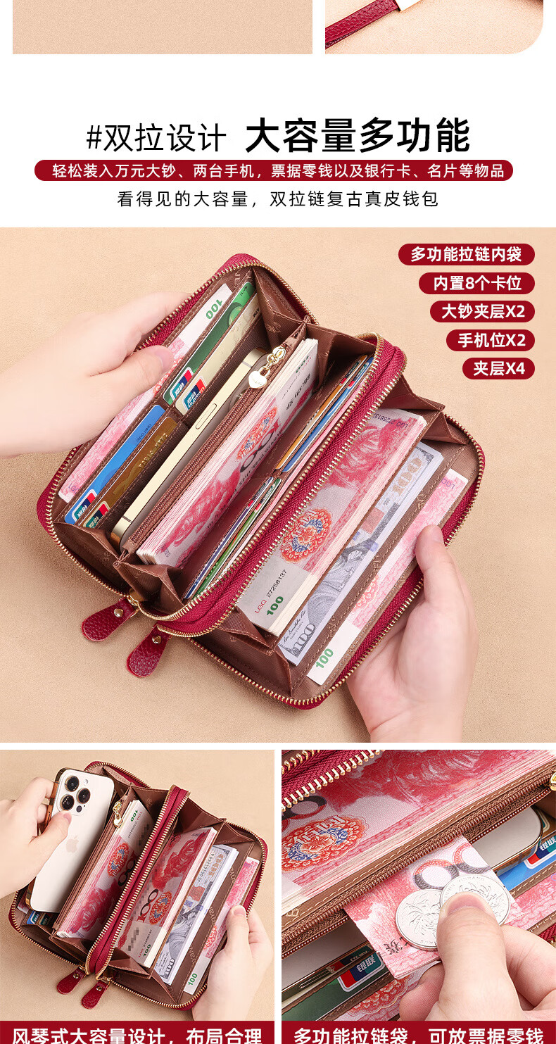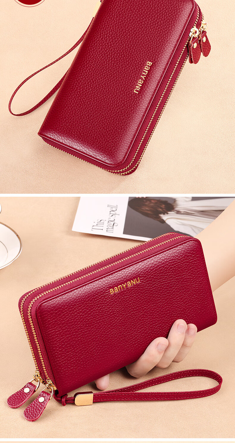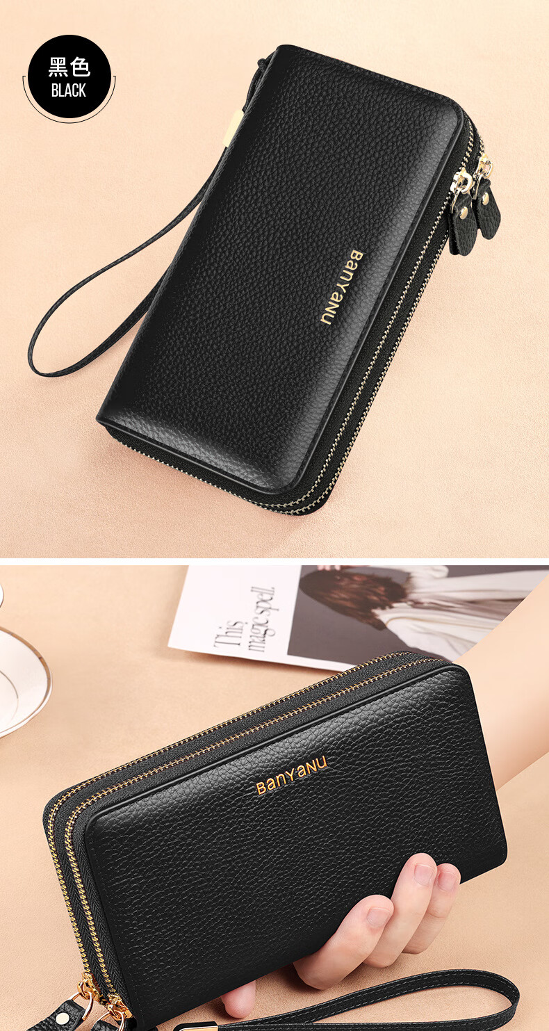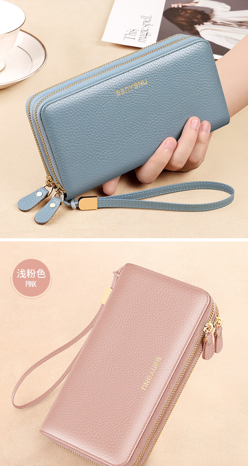 Banyanu Wallet Women's Long Style 2025 New Fashion Large Capacity First Layer Cowhide Wallet Double Zipper Genuine Leather Clutch Brown (First Layer Cowhide) Anti-Theft Brush No Specifications