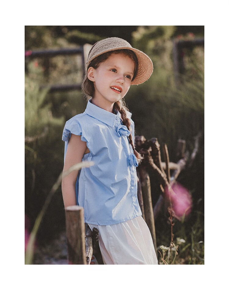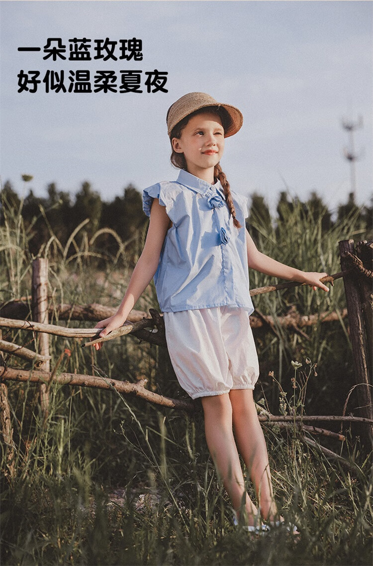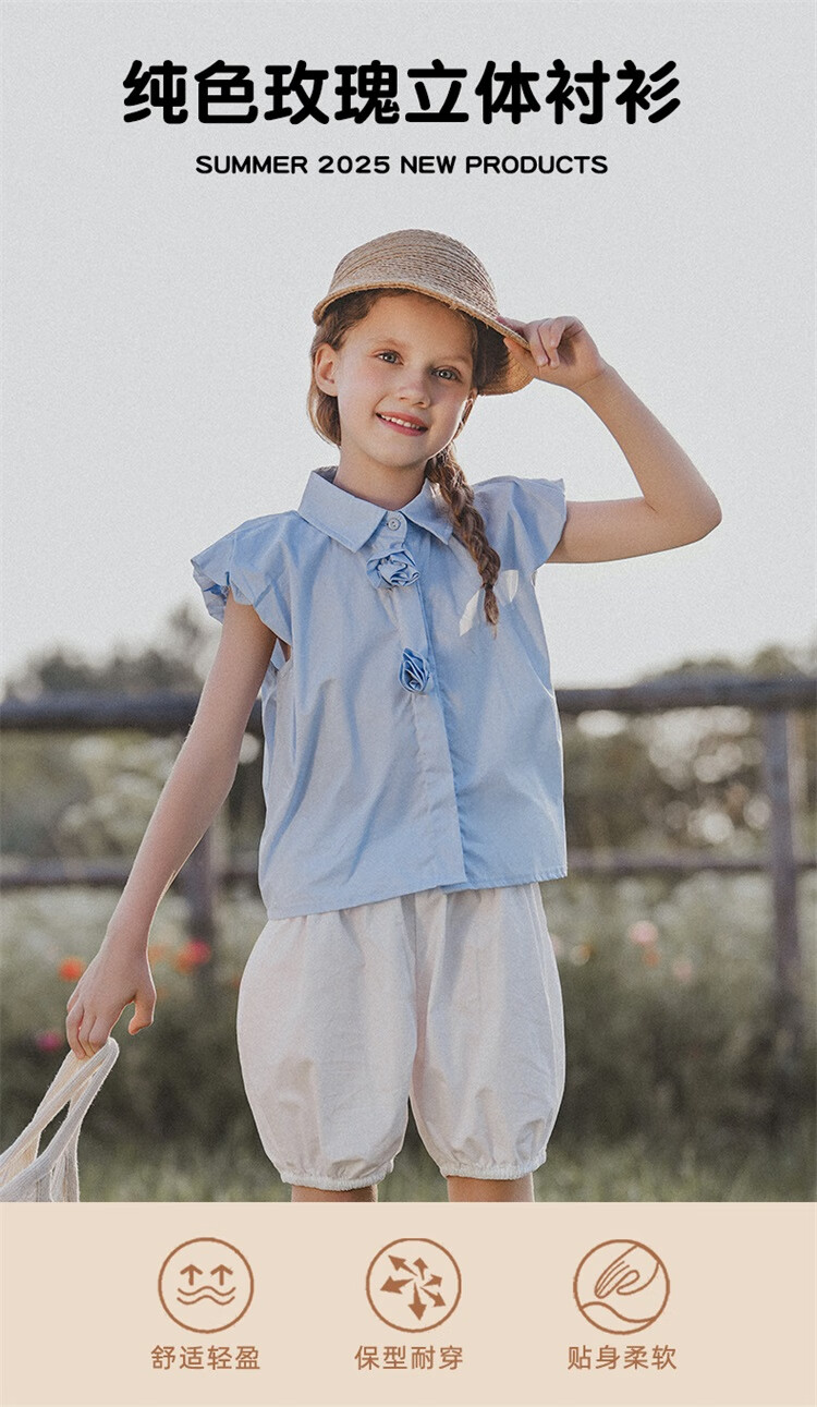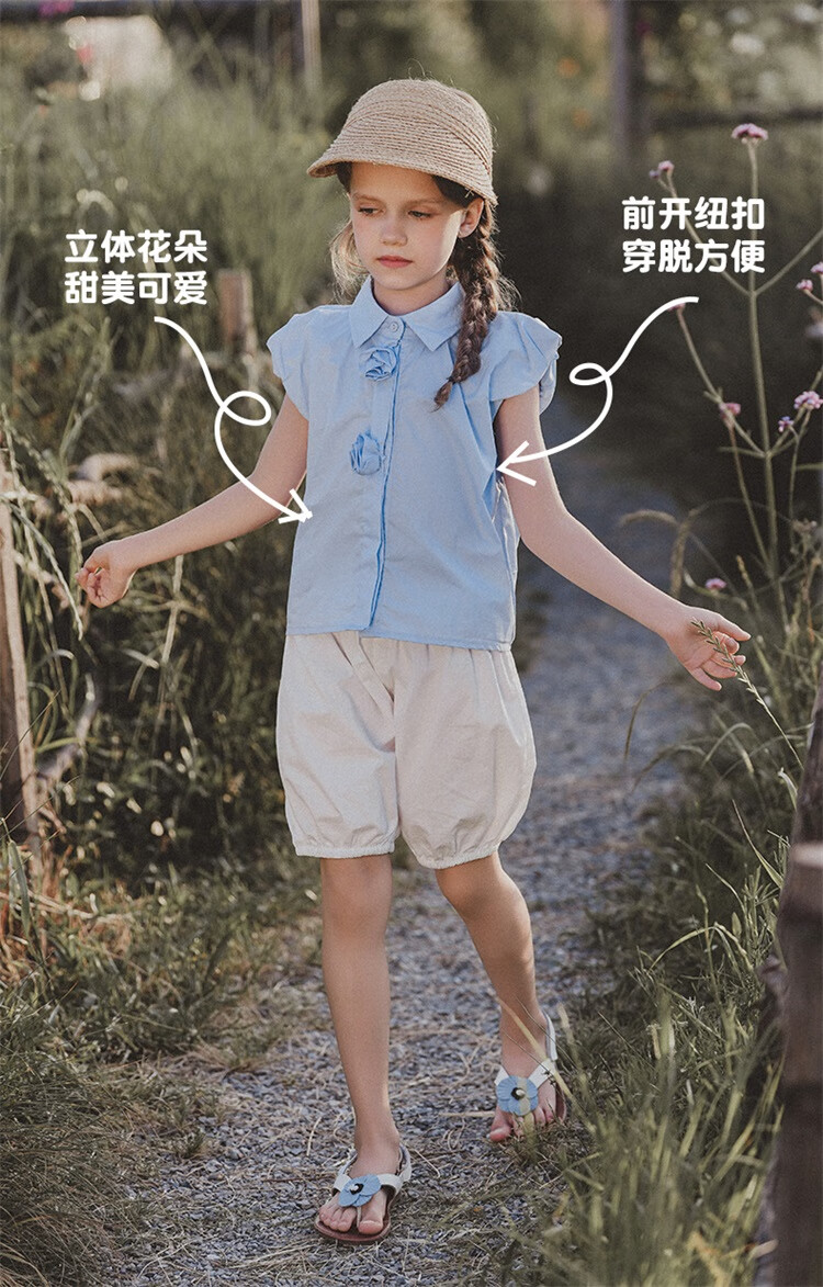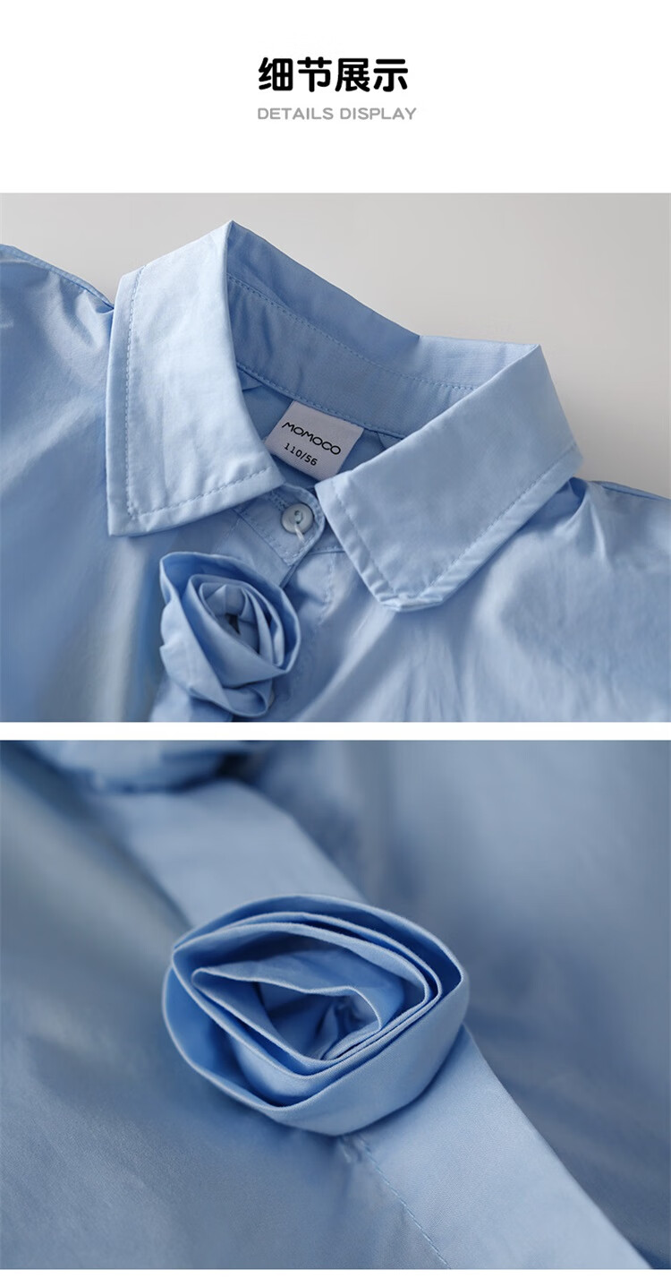 Mami Maca (MOMOCO) girls summer cotton shirt summer new breathable solid color rose three-dimensional shirt blue 110