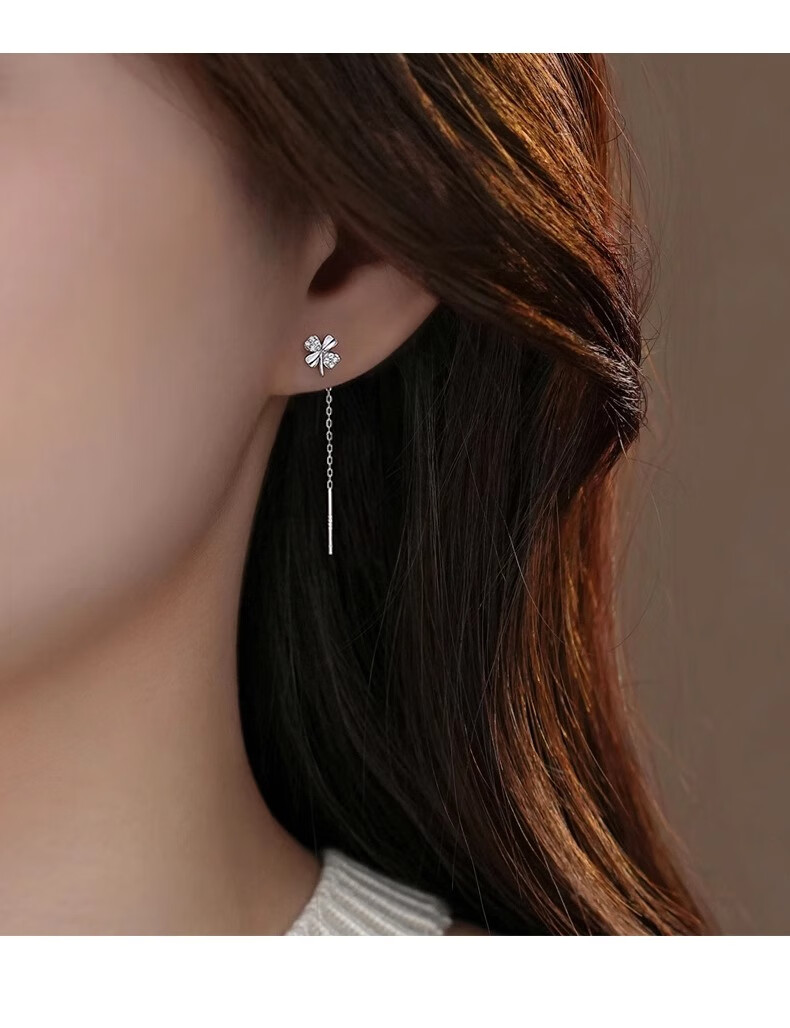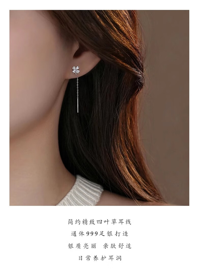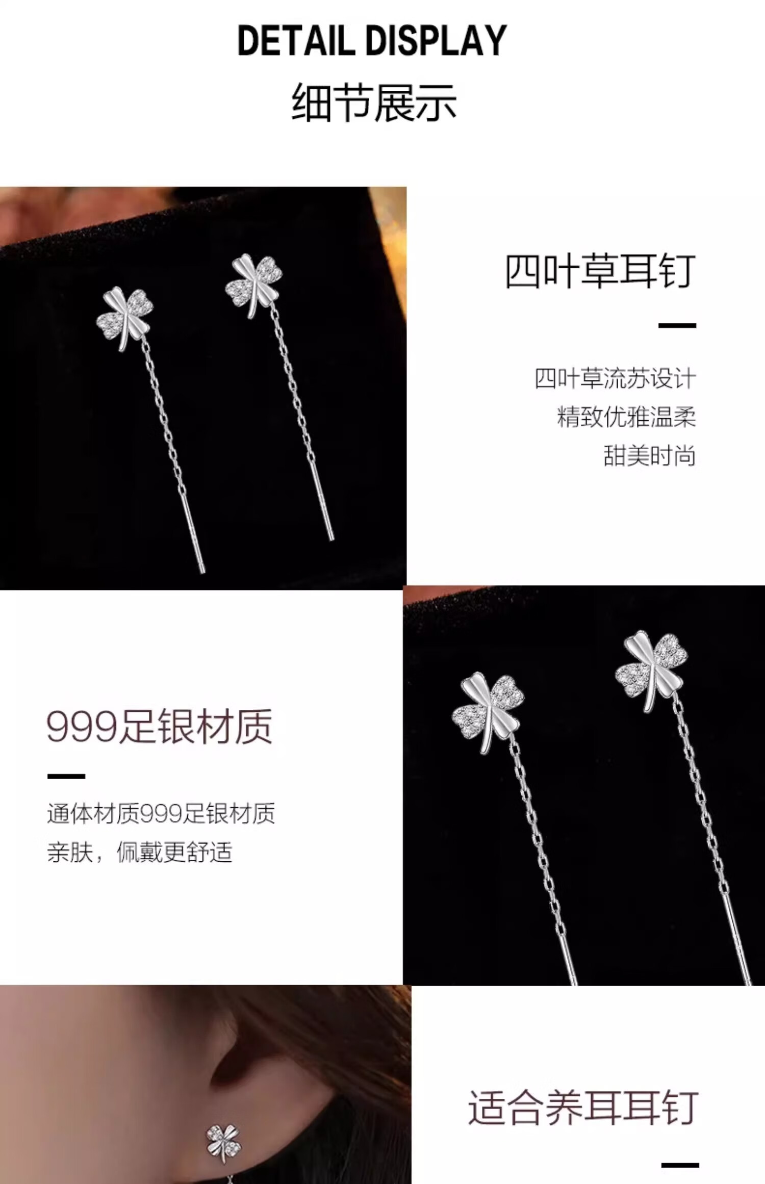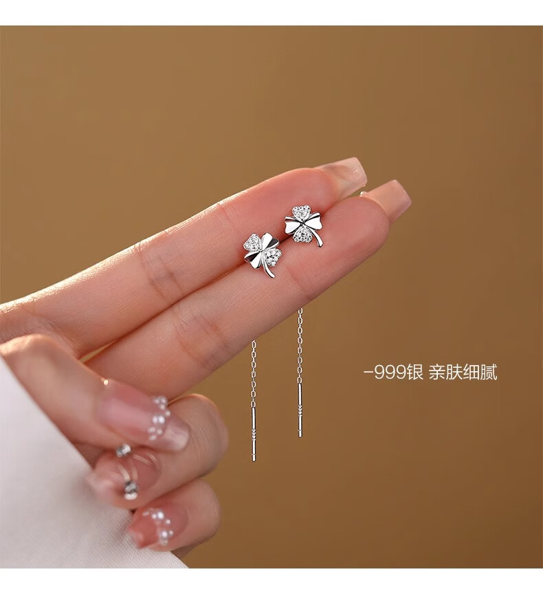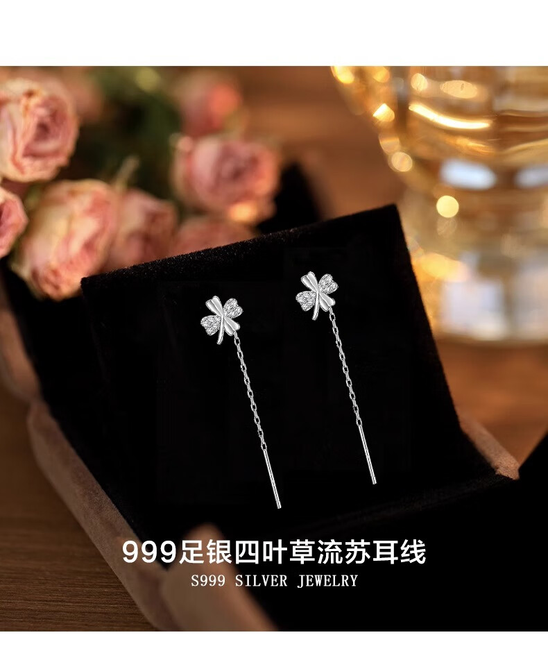 BJYLS999 pure silver four-leaf clover ear wire for women, long style, no need to take off sterling silver earrings, earrings, earrings, earrings for women, S999 pure silver four-leaf clover tassel ear wire (pair)